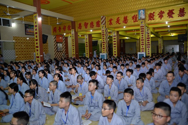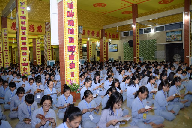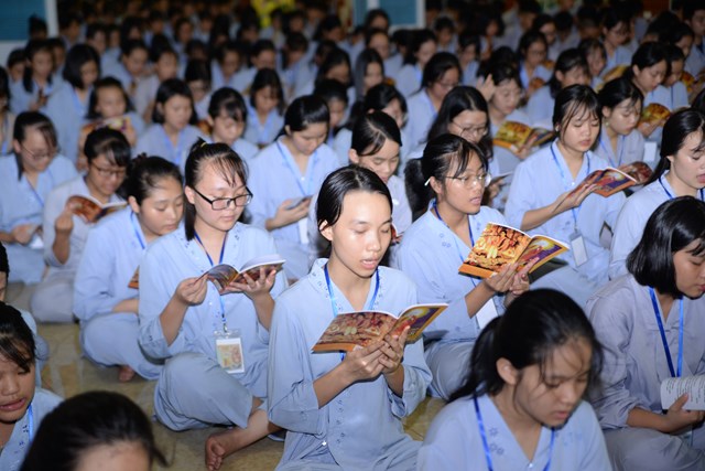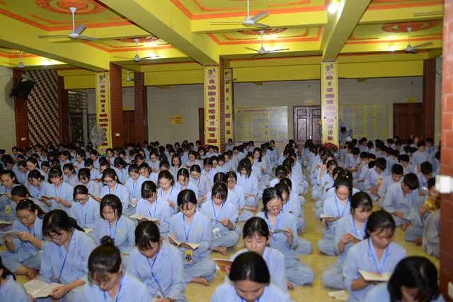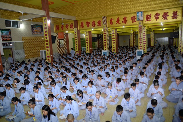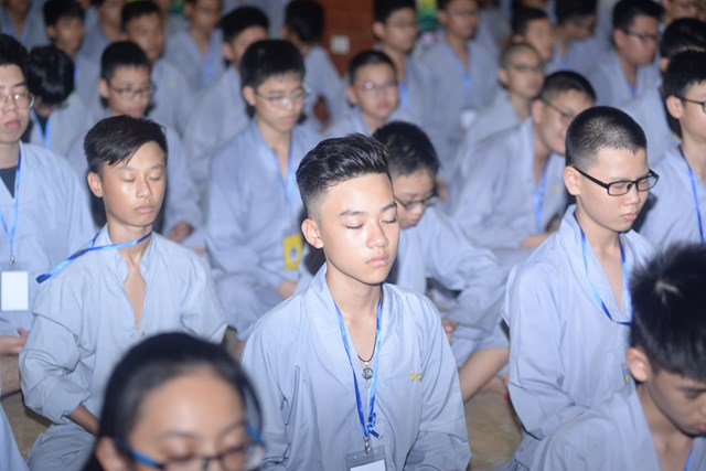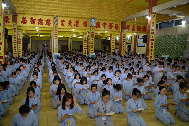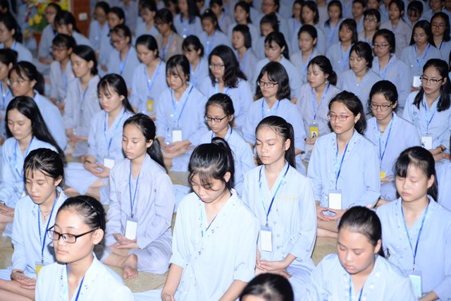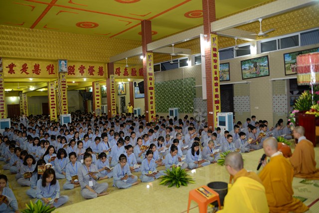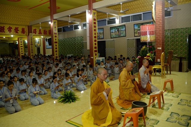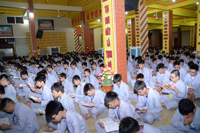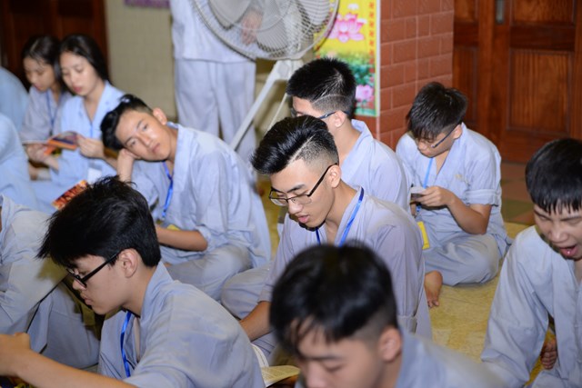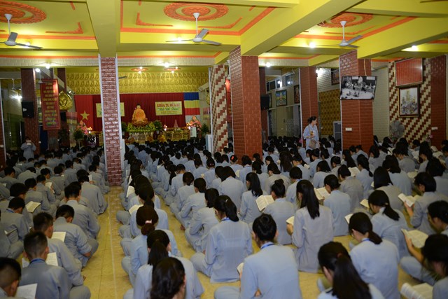 Buổi tối của ngày tu học đầu tiên, các bạn khóa sinh cũng đã được quý thầy cô trong Ban chủ nhiệm khóa tu hướng dẫn cách ngồi thiền, cách tụng kinh và thực hành tụng kinh Vu Lan – Báo Hiếu tại giảng đường với sự tham dự của hơn 800 bạn khóa sinh.