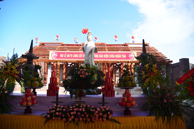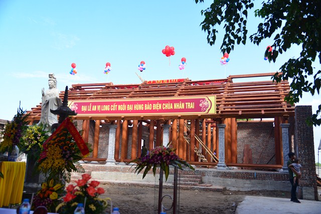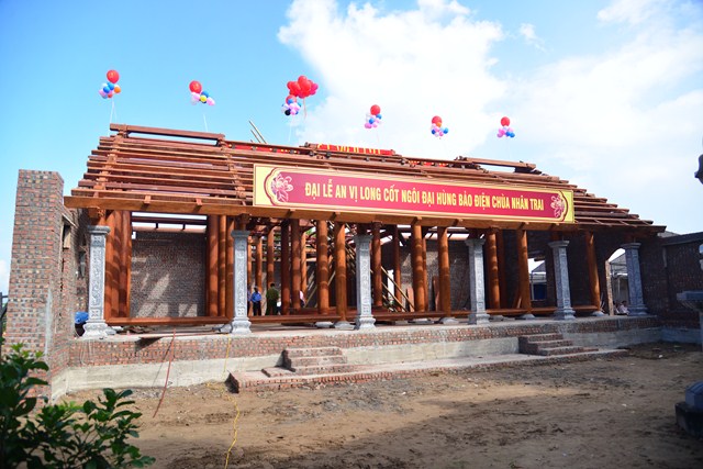 Chùa được xây dựng  theo kiến trúc hình chữ Đinh, phía trước thờ Phật, phía sau thờ chư lịch đại Tổ sư,  Sau hơn 5 tháng thi công, đến nay công trình đã hoàn thiện xong phần mộc.  Hôm nay, nhân kỷ niệm ngày Bồ Tát Quán Thế Âm xuất gia, các cấp Giáo hội, chính quyền và nhân dân địa phương tổ chức lễ an vị long cốt ngôi Đại Hùng Bảo Điện, đồng thời khởi công động thổ xây dựng ngôi Tổ đường, nhà Mẫu, điện Vua chùa Nhân Trai.