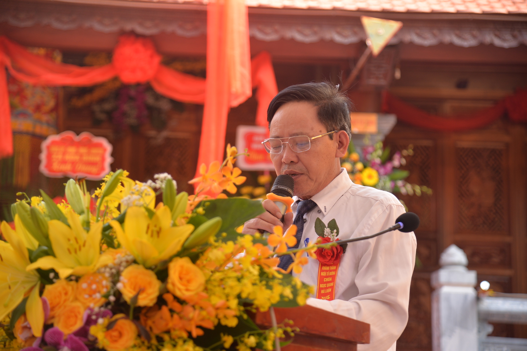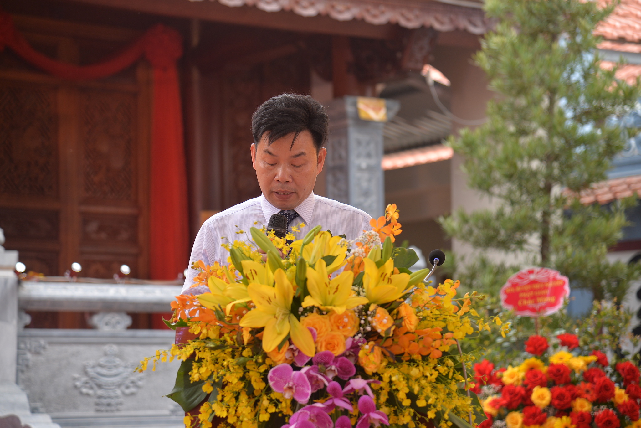 Tại buổi lễ, thay mặt cho các cấp chính quyền địa phương, ông: Trần Văn Toàn – Đảng ủy viên, Phó Chủ tịch UBND xã Hòa Bình, trưởng Ban quản lý Di tích đã lên phát biểu chúc mừng đại lễ. Đồng thời, tán dương công đức của Sư cô trụ trì, các nhà hảo tâm, các mạnh thường quân, Phật tử gần xa, nhân dân địa phương đã phát tâm công đức, đóng góp tịnh tài, tịnh vật xây dựng ngôi Tổ đường được khang trang, tố hảo như ngày hôm nay. Ông cũng hy vọng nơi đây sẽ là ngôi nhà tâm linh vững chắc, là nơi gắn kết cộng đồng thể hiện sự đoàn kết, hòa hợp trong tình yêu thương bao la rộng lớn, trên phương châm Phật giáo luôn đồng hành cùng Dân tộc.