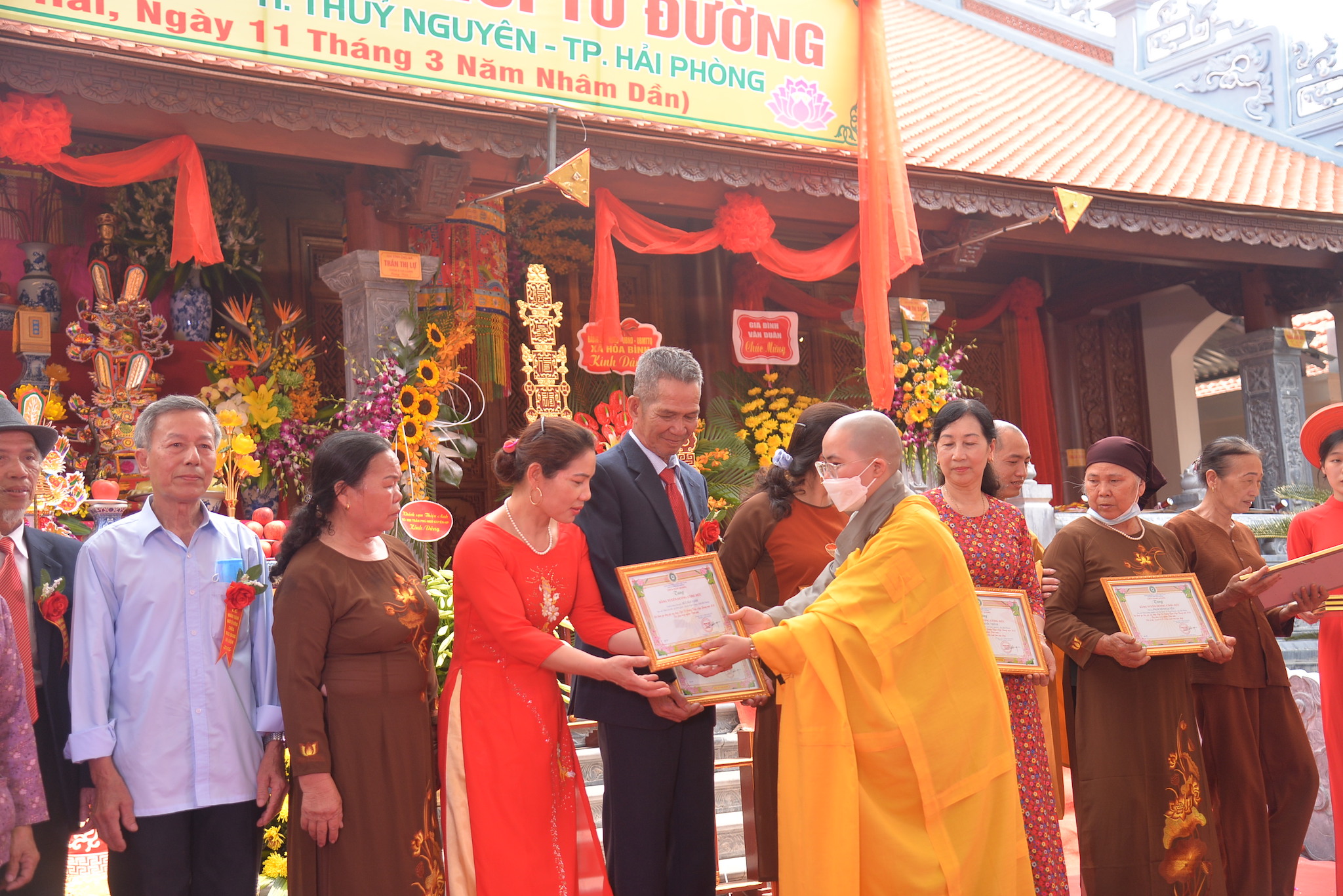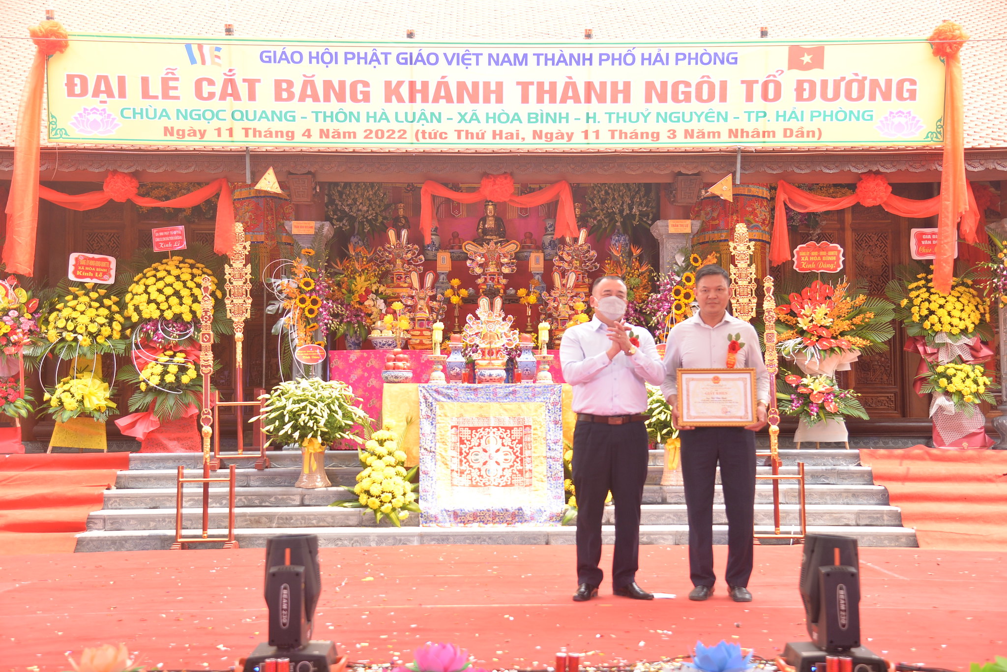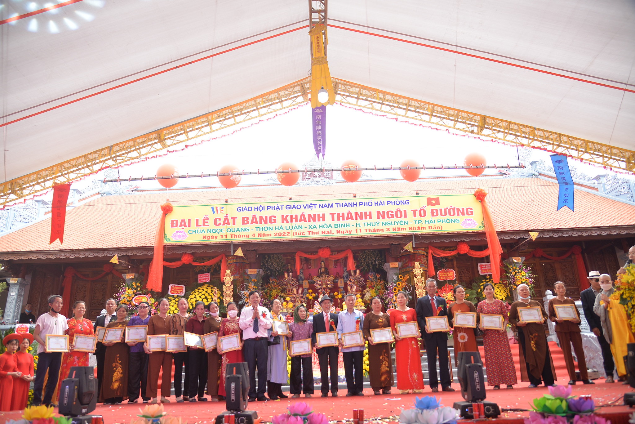 Dip này, đại diện lãnh đạo BTS GHPGVN huyện Thủy Nguyên và Sư cô trì chùa Ngọc Quang đã trao tặng bằng tuyên dương công đức cho các tập thể và cá nhân các Phật tử, các nhà hảo tâm, các mạnh thường quân đã góp công, góp của để xây dựng lại ngôi Tổ Đường chùa Ngọc Quang.