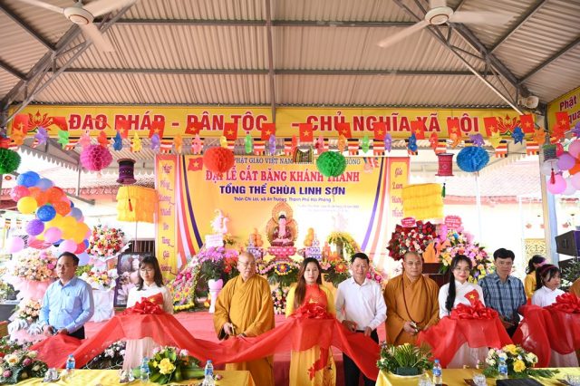 Chư tôn đức và đại diện chính quyền cắt băng khánh thành tổng thể chùa Linh Sơn