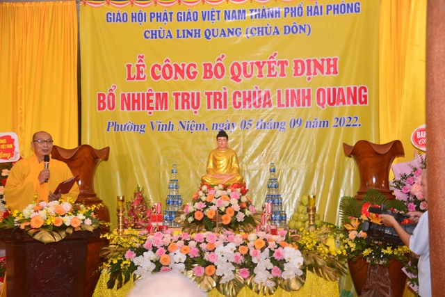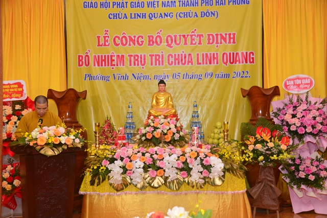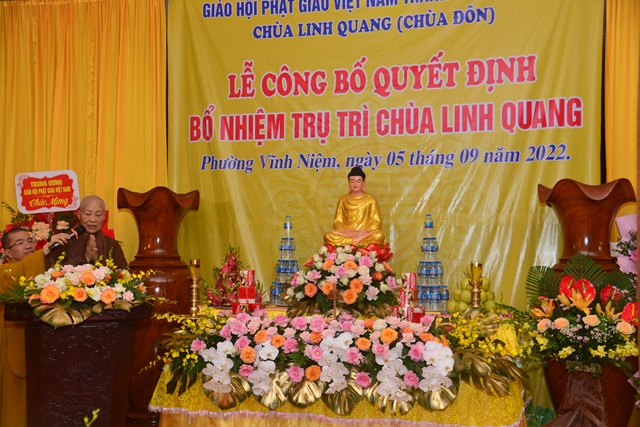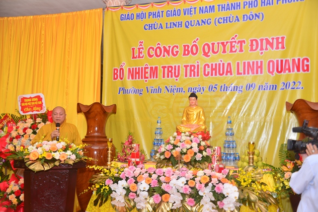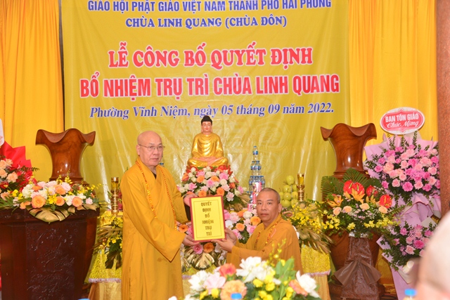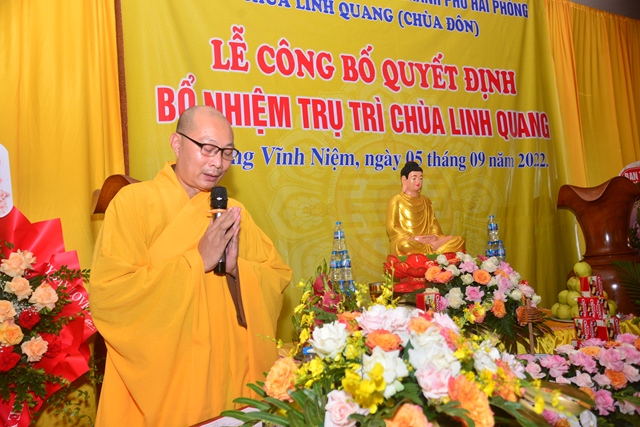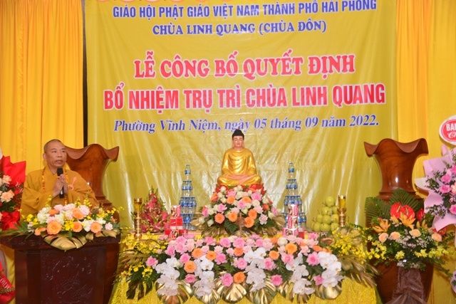 Thay mặt cho thường trực BTS GHPGVN thành phố Hải Phòng, Hòa thượng Thích Quảng Tùng – Trưởng Ban trị sự GHPGVN thành phố đã trao Quyết định bổ nhiệm trụ trì chùa Đôn ( Linh Quang tự) cho Thượng tọa Thích Quảng Truyền. Ngay sau khi đón nhận quyết định, thượng tọa tân trụ trì cảm ơn sự tin tưởng, tín nhiệm của Ni trưởng Thích Diệu Tư, thượng tọa mong tiếp tục nhận được sự trợ duyên của các cấp Giáo hội, sự giúp đỡ của các cấp chính quyền, Phật tử và nhân dân địa phương trong thời gian tới, để có thể hoàn thành tốt trọng trách “ Hoằng pháp vi gia vụ, lợi sinh vi bản hoài”. Thượng tọa tân trụ trì hứa sẽ cố gắng hoàn thành tốt trách nhiệm của mình trên cương vị của một vị trụ trì: Trụ Pháp Vương gia – Trì Như Lai tạng.