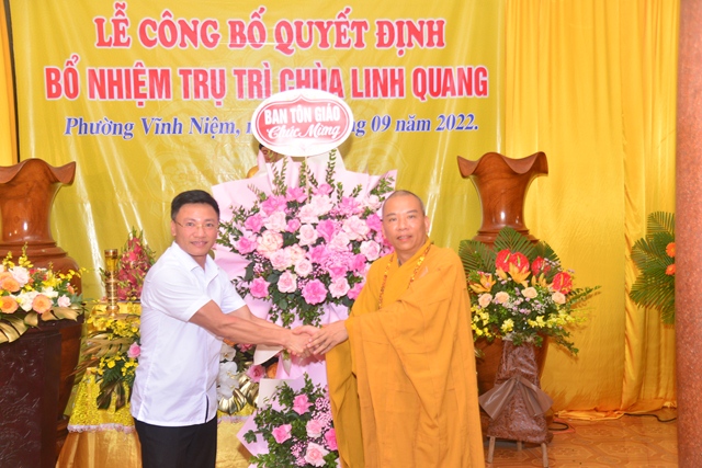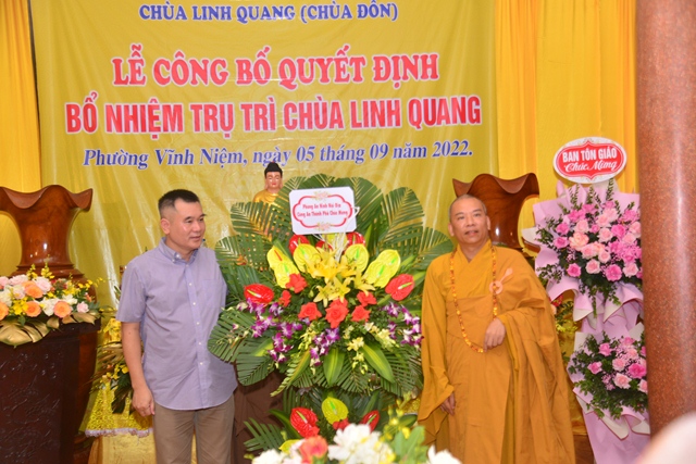 Tại buổi lễ, Thượng tọa Thích Quảng Truyền đã đón nhận những lẵng hoa chúc mừng của HĐTS TƯ GHPGVN, Ban trị sự GHPGVN thành phố Hải Phòng, Ban Tôn giáo thành phố, Phòng An ninh Nội địa, Công an thành phố và các cấp chính quyền quận Lê Chân, phường Vĩnh Niệm.