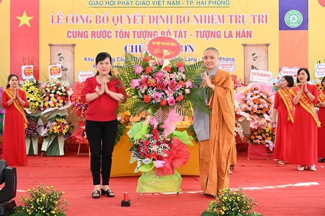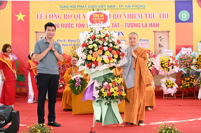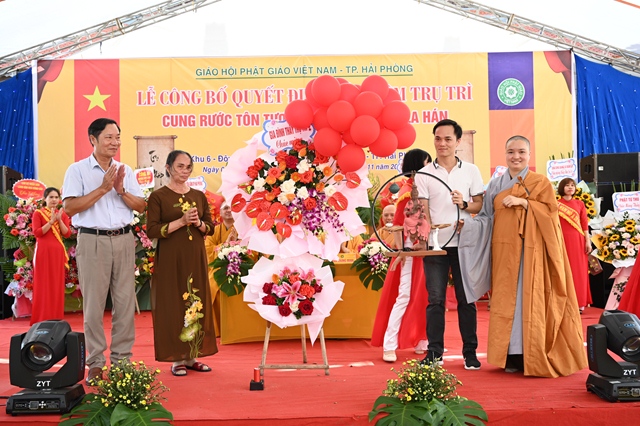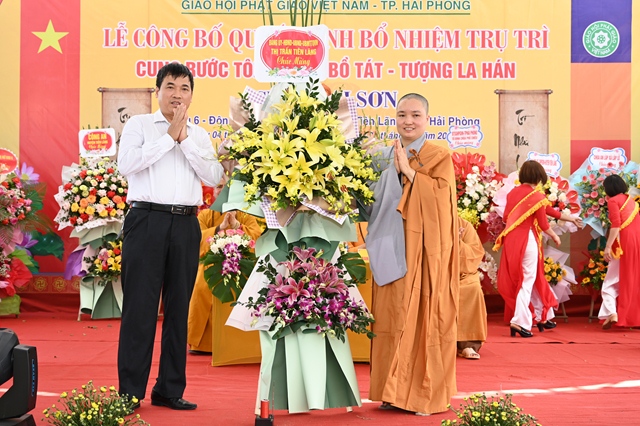 HT. Thích Thanh Giác đại diện BTS GHPGVN thành phố Hải Phòng tặng hoa chúc mừng Sư cô tân trụ trì