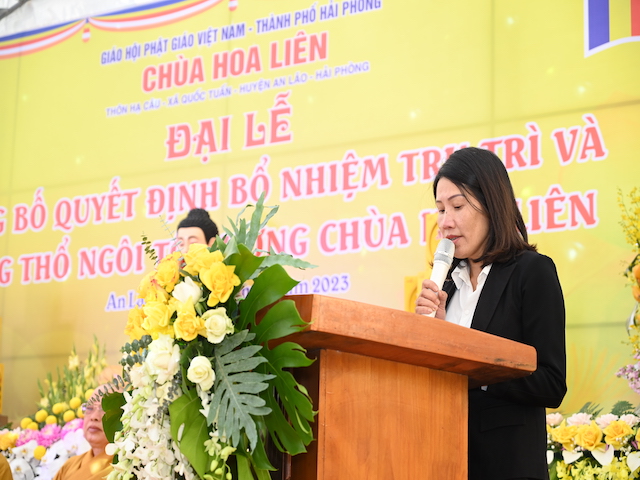 Bà: Vụ Thị Dung, đại diện chính quyền địa phương phát biểu chúc mừng Đại đức tân trụ trì