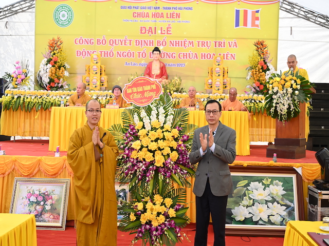 Đại đức tân trụ trì đón nhận lẵng hoa chúc mừng của ban Tôn giáo thành phố