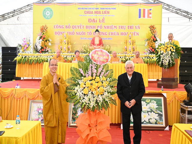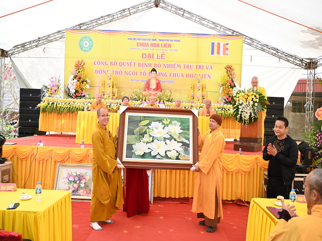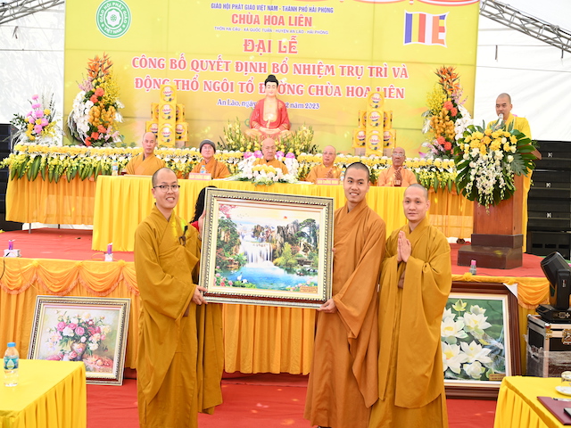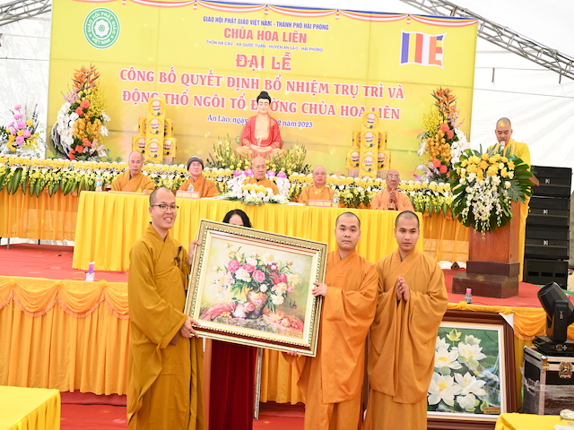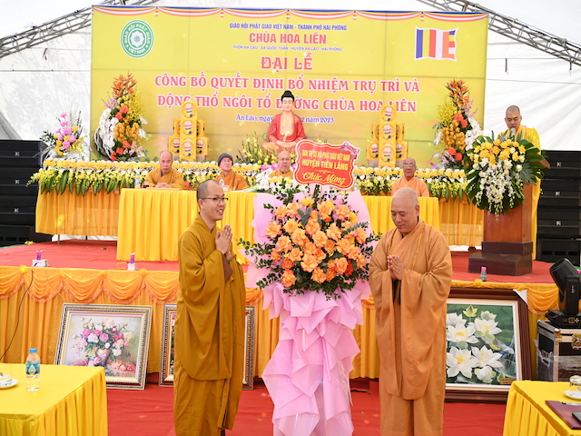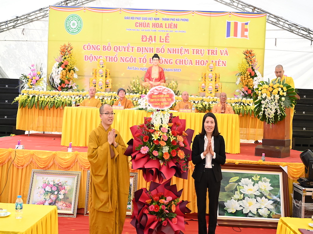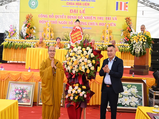 Đại đức tân trụ trì đón nhận lẵng hoa chúc mừng của Ban trị sự GHPGVN thành phố Hải Phòng