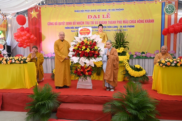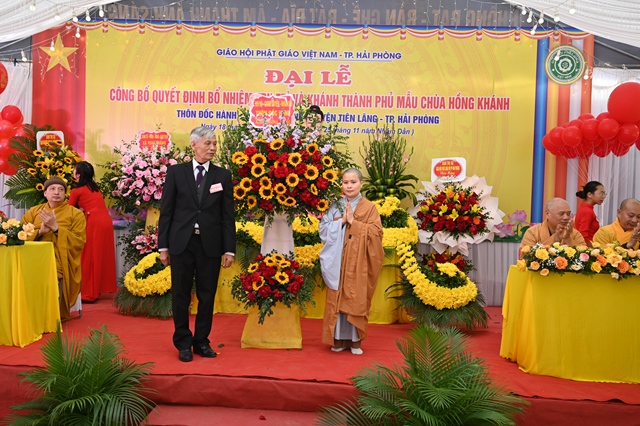 Hòa thượng trưởng BTS GHPGVN thành phố Hải Phòng tặng hoa chúc mừng