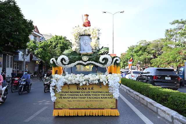 Đoàn xe cung rước Xá lợi cố Đại lão Hòa thượng Thích Trí Hải gần 30 xe đi qua một số tuyến phố chính của thành phố như: phố Trường Chinh – Trần Nguyên Hãn – Tô Hiệu – Cầu Đất – Hai Bà Trưng sau đó đoàn xe dừng lại tập kết tại Trụ sở Công an quận Lê Chân ( phố Hai Bà Trưng) và rước bộ về chùa Nam Hải ( Trụ sở Ban trị sự) với sự tham dự của đông đảo Chư tôn đức Tăng Ni, chính quyền các cấp và hàng ngàn Phật tử gần xa, du khách thập phương, nhân dân địa phương.