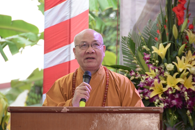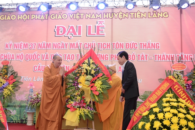 Nhân dịp này, Hòa thượng Thích Quảng Tùng – Phó chủ tịch HĐTS TƯ GHPGVN, trưởng Ban trị sự GHPGVN thành phố Hải Phòng đã lên ban đạo nói lên ý nghĩa của ngôi chùa, cũng như công đức của việc xây chùa. Đồng thời, từ tán thán công đức của Ban trị sự GHPGVN huyện Tiên Lãng nói chung và cá nhân Đại đức Thích Quảng Minh nói riêng đã phát tâm đứng lên kêu gọi sự ủng hộ của các nhà hảo tâm, các tổ chức kinh tế xã hội, các mạnh thường quân và các Phật tử gần xa để xây dựng công trình có tầm cỡ quy mô lớn như ngày hôm nay. Trong bài đạo từ của mình, Hòa thượng chứng minh cũng đã gửi lời cảm ơn tới các cấp chính quyền của thành phố Hải Phòng, các cấp chính quyền của huyện Tiên Lãng và xã Tiên Cường đã tạo mọi điều kiện giúp đỡ BTS GHPGVN thành phố Hải Phòng và BTS GHPGVN huyện Tiên Lãng trong quá trình thi công xây dựng Đền thờ cố chủ tịch nước Tôn Đức Thắng và rất mong tiếp tục nhận được sự ủng hộ, giúp đỡ của các cấp chính quyền thành phố, chính quyền địa phương sở tại trong thời gian tới để giai đoạn 2 của công trình sớm được hoàn thiện, đưa vào sử dụng, đáp ứng nhu cầu văn hóa tâm linh của bà con Phật tử và nhân dân địa phương.