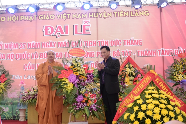 Tại buổi lễ, Đại đức Thích Quảng Minh – Trưởng Ban trị sự GHPGVN huyện Tiên Lãng đã đón nhận những lẵng hoa chúc mừng của Hòa thượng Thích Quảng Tùng – Trưởng BTS GHPGVN thành phố Hải Phòng, đại diện cho thường trực BTS GHPGVN thành phố Hải Phòng; Ông: Nguyễn Văn Tùng: Phó bí thư thành ủy, chủ tịch UBND thành phố Hải Phòng, ông: Nguyễn Hữu Doãn, ủy viên thường vụ, trưởng Ban tuyên giáo thành ủy thành phố Hải Phòng; ông: Đỗ Tràng Thành – Phó chủ tịch UB MTTQVN thành phố Hải Phòng; ông: Lê Văn Nhã – Phó giám đốc Sở nội vụ, trưởng Ban tôn giáo thành phố Hải Phòng, ông: Trần Phi Long – Bí thư Đảng ủy, chủ tịch UBND xã Thượng Yên Công, Tp. Uông Bí, tỉnh Quảng Ninh cùng các ông bà đại diện cho thành ủy HĐND, UBND, UB MTTQVN thành phố Hải Phòng, huyện Tiên Lãng và xã Tiên Cường.
