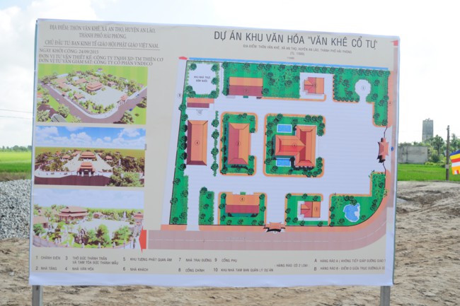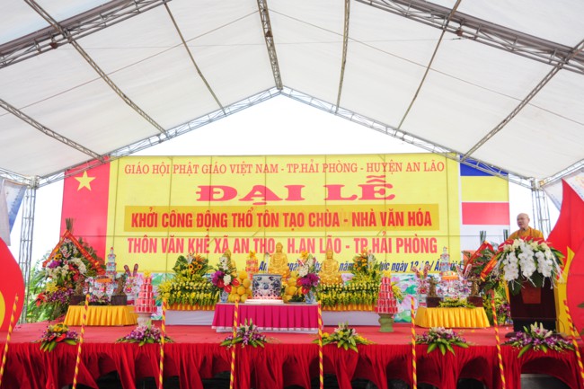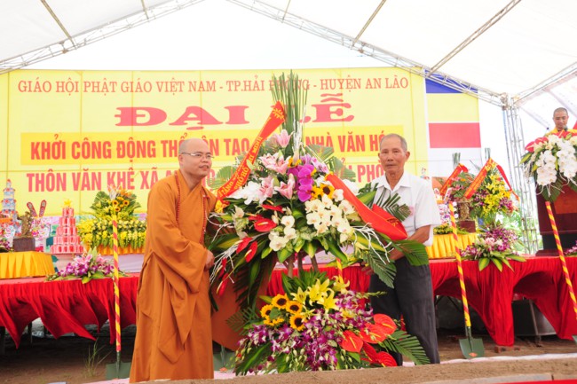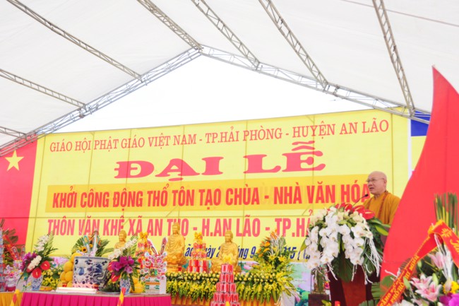 Sau nghi thức chào Quốc Kỳ, Đạo kỳ, ông Vũ Văn Thế – Trưởng thôn Văn Khê đã lên sơ lược lịch sử và kế hoạch xây dựng chùa Văn Khê. Chùa Văn Khê tọa lạc tại thôn Văn Khê, xã An Thọ, huyện An Lão, thành phố Hải Phòng là một ngôi chùa cổ được xây dựng từ lâu đời nhưng do biến cố thăng trầm của thời gian và lịch sử, cũng như trải qua hai cuộc chiến tranh khốc liệt, chùa đã bị xuống cấp trầm trọng. Thể theo nguyện vọng của đồng bào, Phật tử và nhân dân địa phương, được sự quan tâm của các cấp chính quyền TƯ và địa phương, đặc biệt là sự quan tâm giúp đỡ của Ban kinh tế tài chính TƯ GHPGVN cũng như sự giúp đỡ, tạo điều kiện của BTS GHPGVN thành phố Hải Phòng, chính quyền và nhân dân địa phương cùng BTS GHPGVN huyện An Lão đã tổ chức lễ khởi công động thổ tôn tạo cụm di tích chùa và nhà văn hóa thôn Văn Khê.
