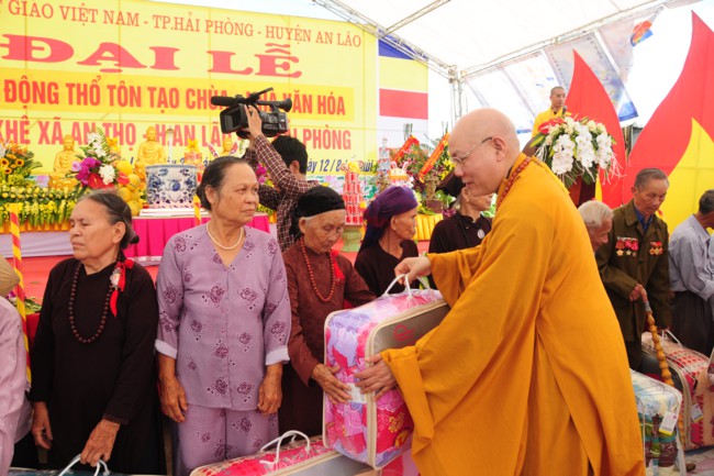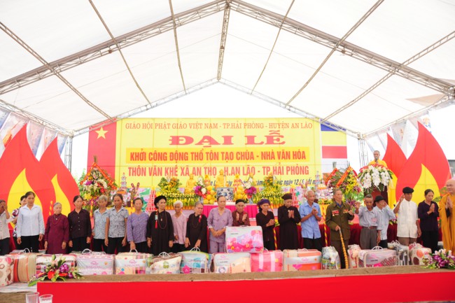 Cũng trong buổi lễ, nhân dịp chuẩn bị kỷ niệm ngày người cao tuổi mùng 1 tháng 10 sắp tới, Ban kinh tế tài chính và Ban từ thiện xã hội TƯ GHPGVN đã trao 20 xuất quà cho người cao tuổi có hoàn cảnh khó khăn thuộc thôn Văn Khê, xã An Thọ, huyện An Lão.