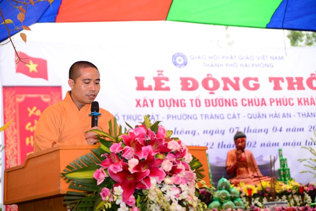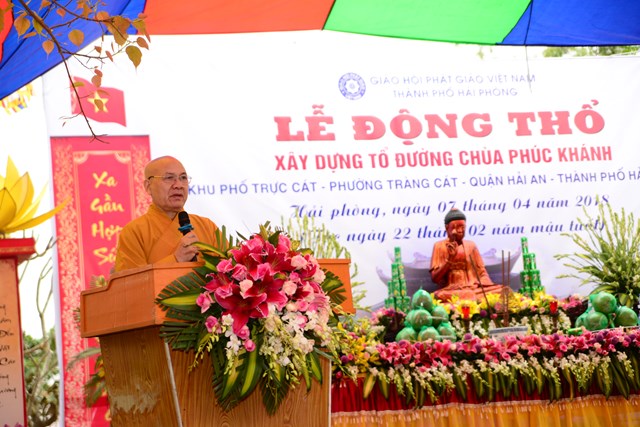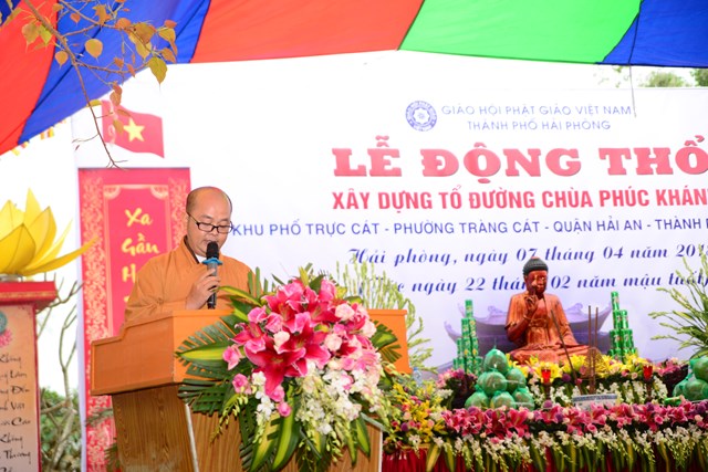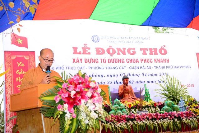 Sau nghi thức niệm Phật cầu gia bị, chào Quốc kỳ, chào Đạo Kỳ, Đại đức Thích Bản Giáo – Trụ trì chùa Trực Cát, trưởng BTC đại lễ đã lên tuyên đọc Diễn văn khai mạc lễ động thổ xây dựng ngôi Tổ Đường chùa Phúc Khánh. Theo đó, chùa Trực Cát ( Phúc Khánh tự) đã được hình thành từ lâu đời với sự hình thành lập ấp của người dân Trực Cát. Theo bia ký ghi lại thì vào thời Hoàng triều năm Thiệu tri thứ 12, ngày 20 tháng 12 năm Tân Mão có một vị quan đỗ thủ khoa tự tổng Cát Khê thành tâm cúng ruộng vườn, tiền bạc để xây dựng chùa và đình Trực Cát. Tuy nhiên, do biến cố thăng trầm của thời gian và lịch sử, trong cuộc kháng chiến chống Pháp, thực dân Pháp đã phá chùa để làm sân bay Cát Bi. Sau khi hòa bình lập lại, có một gia đình thí chủ đã cùng nhân dân địa phương khôi phục tạm lại ngôi chùa để có chỗ cho nhân dân địa phương lễ bái nhưng do nhu cầu sinh hoạt tín ngưỡng văn hóa tâm linh và nhu cầu tu học của Phật tử và nhân dân ngày càng đông nên chùa tạm đã không đủ chỗ cho Phật tử tới lễ bái tu học.