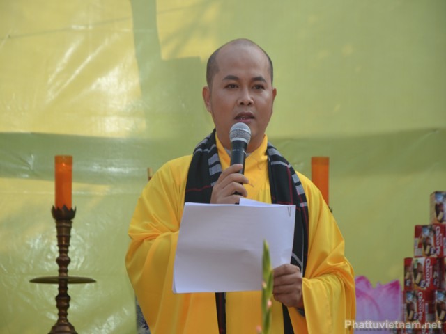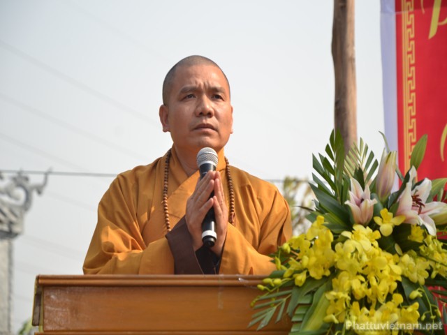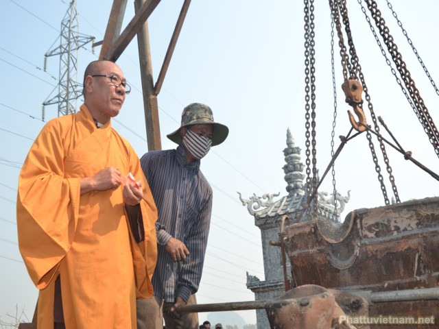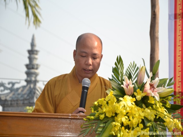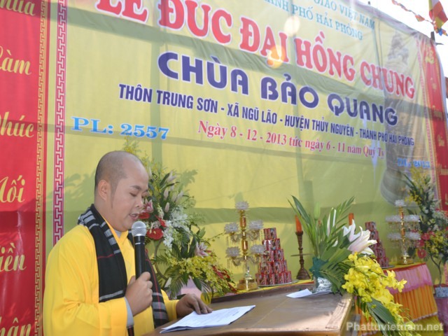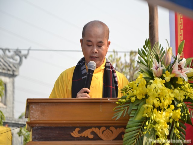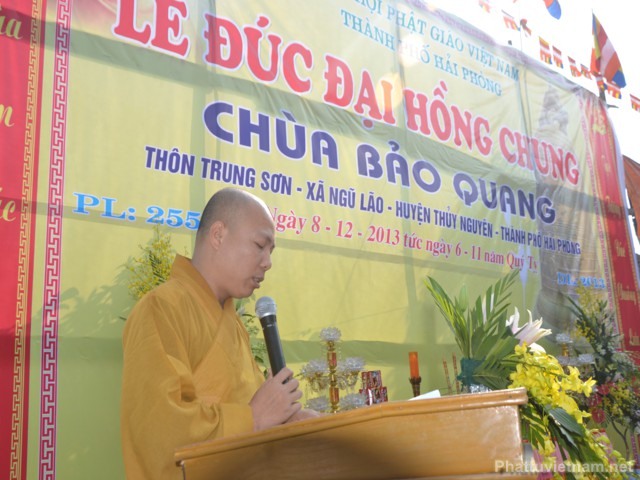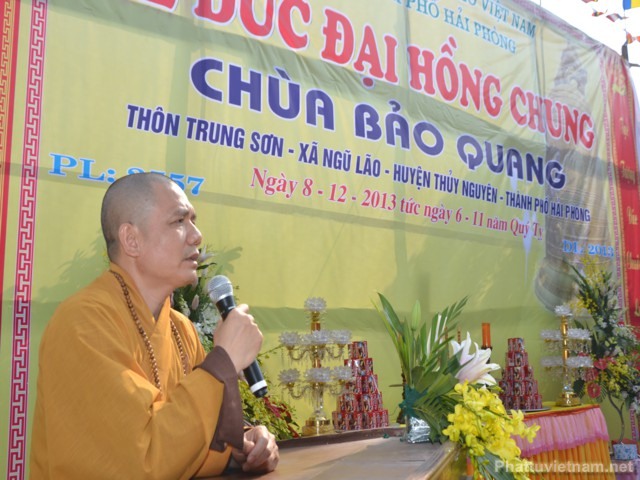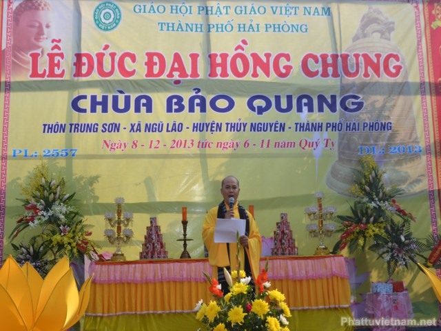 Nhân đây, Đại Đức Thích Tục Thành , Ủy viên BTS GHPGVN Tp. Hải Phòng , trưởng Ban trị sự GHPGVN huyện Thủy Nguyên đã thay mặt cho BTS GHPGVN Tp, Hải Phòng ban đạo từ tán thán công đức của Thầy trụ trì Thích Tịnh Nguyên, các nhà hảo tâm, các mạnh thường quân, các Phật tử gần xa và bà con địa phương đã đóng góp tịnh tài, tịnh vật cho công việc Phật sự đúc chuông ngày hôm nay. Đồng thời, Đại Đức đã nêu lên ý nghĩa của việc đúc đại Hồng chung đối với mỗi ngôi chùa, nó cũng chính là Pháp khí, là Pháp bảo của nhà Phật, mỗi khi tiếng chuông ngân lên sẽ xóa tan màn vô minh đen tối, là tiếng cảnh tỉnh khiến cho các chúng sinh phải quay đầu về hướng thiện, thoát khỏi mê lầm.