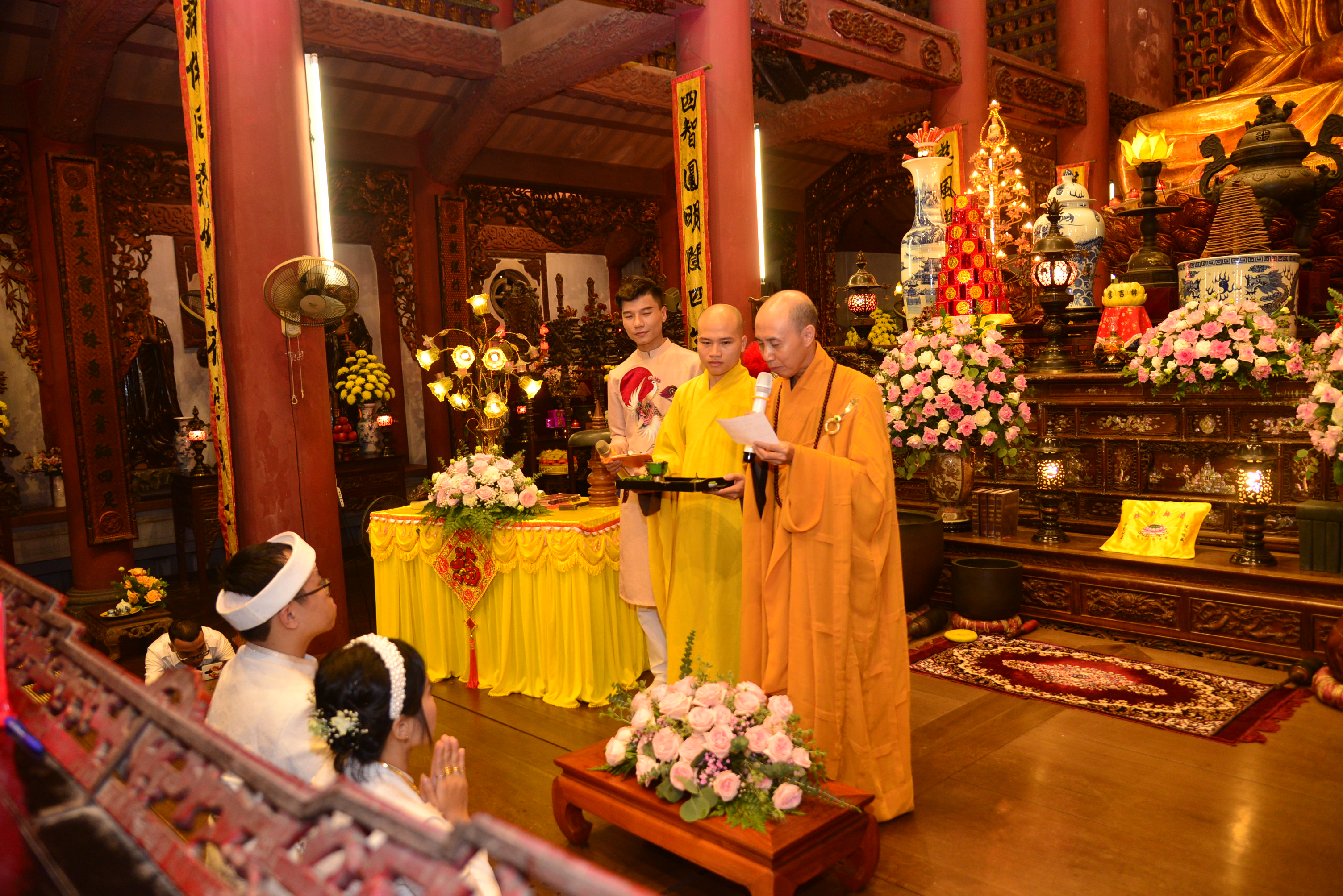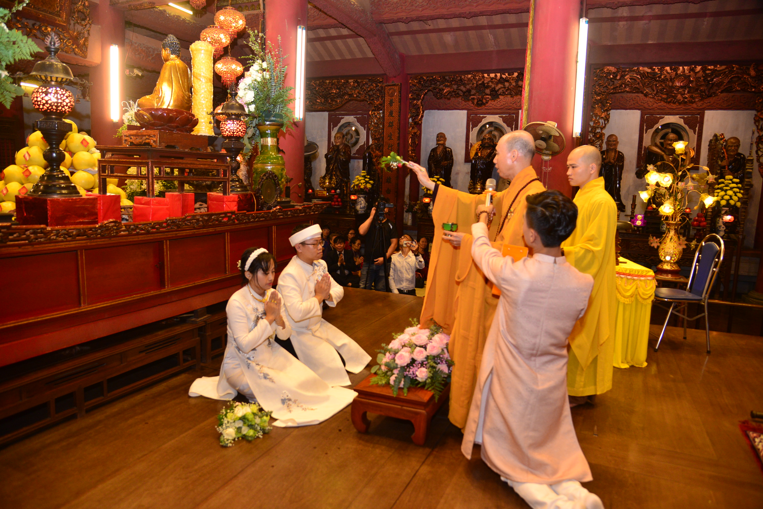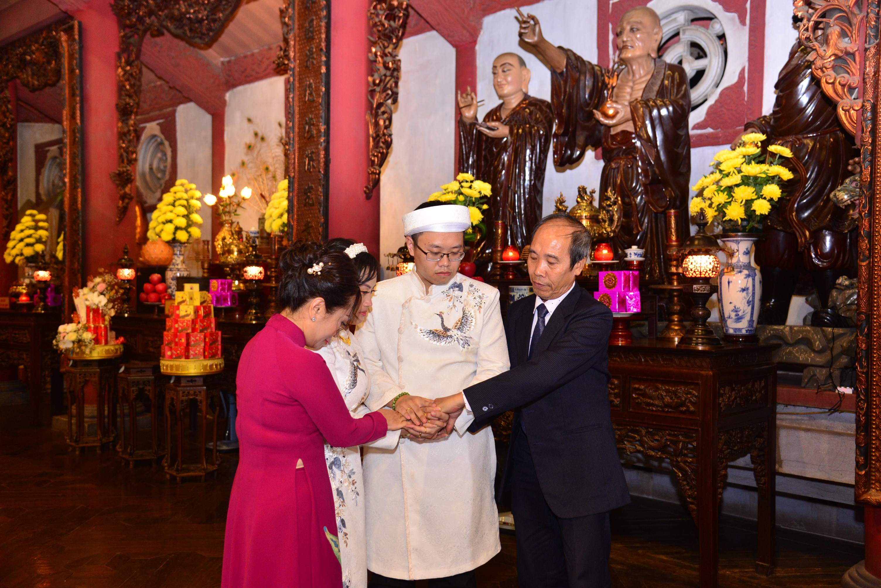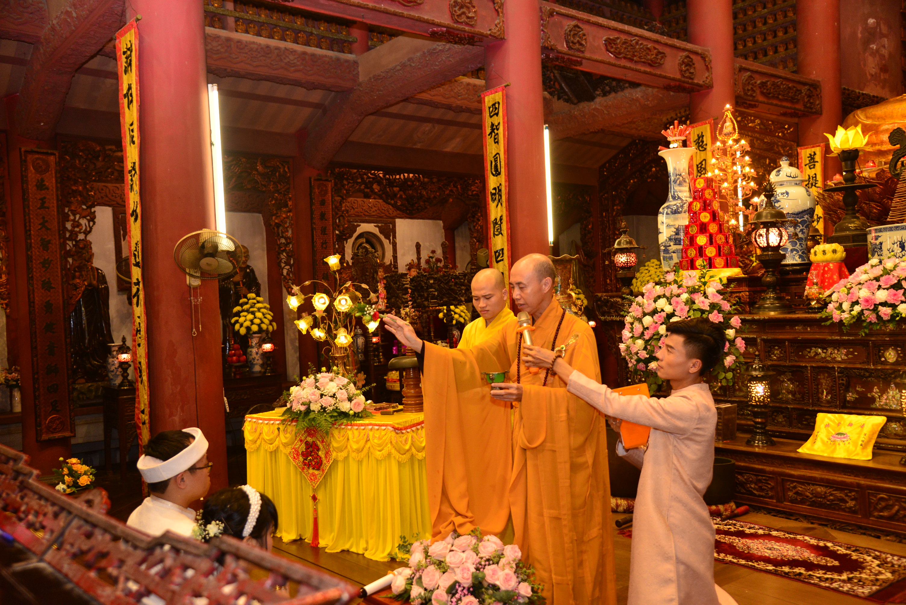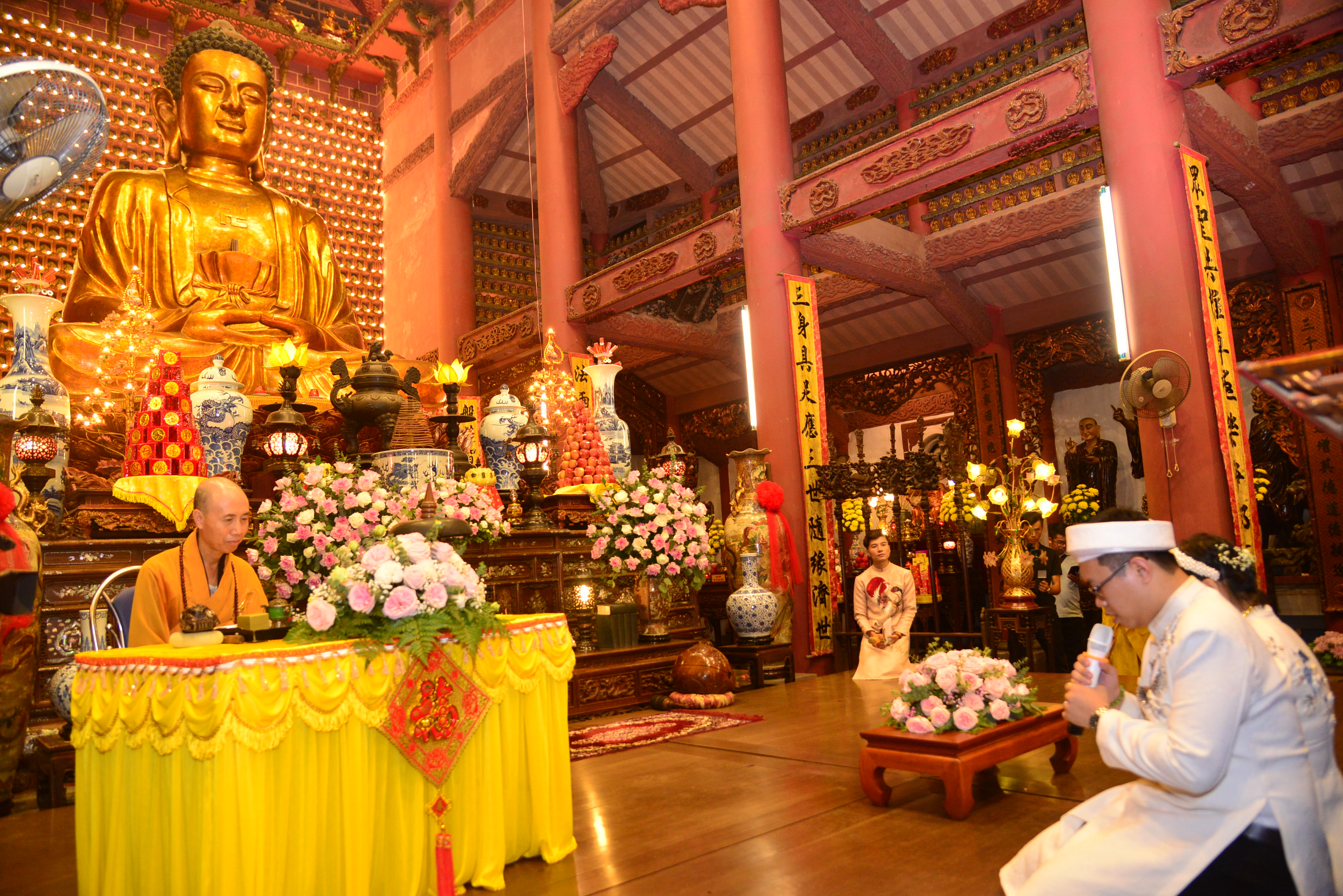 Dưới sự gia hộ của mười phương chư Phật và sự chứng minh hùng tráng của chư tôn đức Tăng trụ xứ, đôi bạn trẻ đã làm lễ tạ ơn Tam Bảo, lễ thụ ân công sinh thành dưỡng dục của hai đấng song thân và nghi lễ quỳ gối rót trà dâng lên cha mẹ. Cha mẹ của đôi tân lang và tân nương không khỏi xúc động khi đón nhận chén trà nóng đong đầy tình cảm gia đình từ tay các con của mình, chứng kiến sự trưởng thành của các con trong ngày lễ thiêng liêng, trọng đại này.