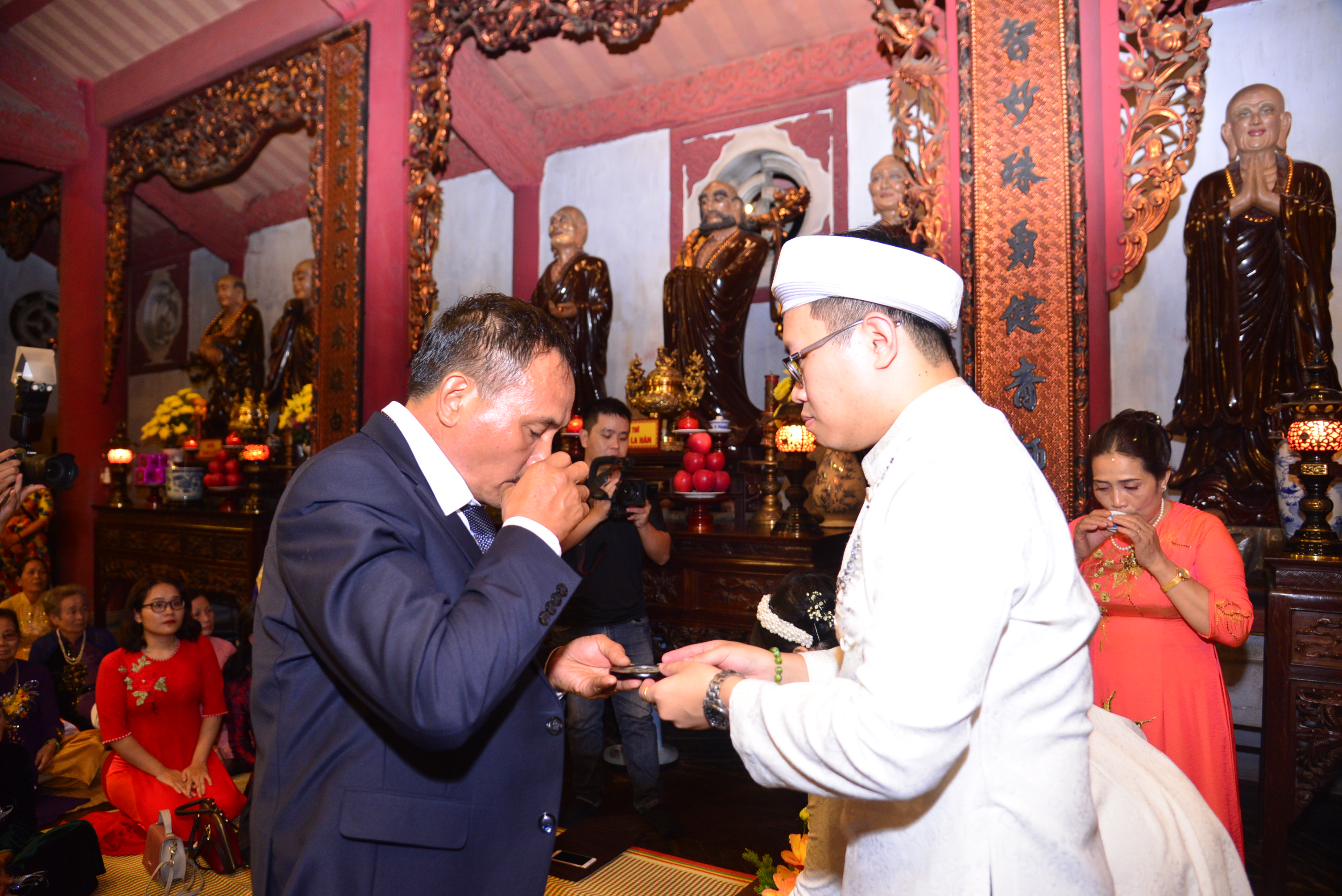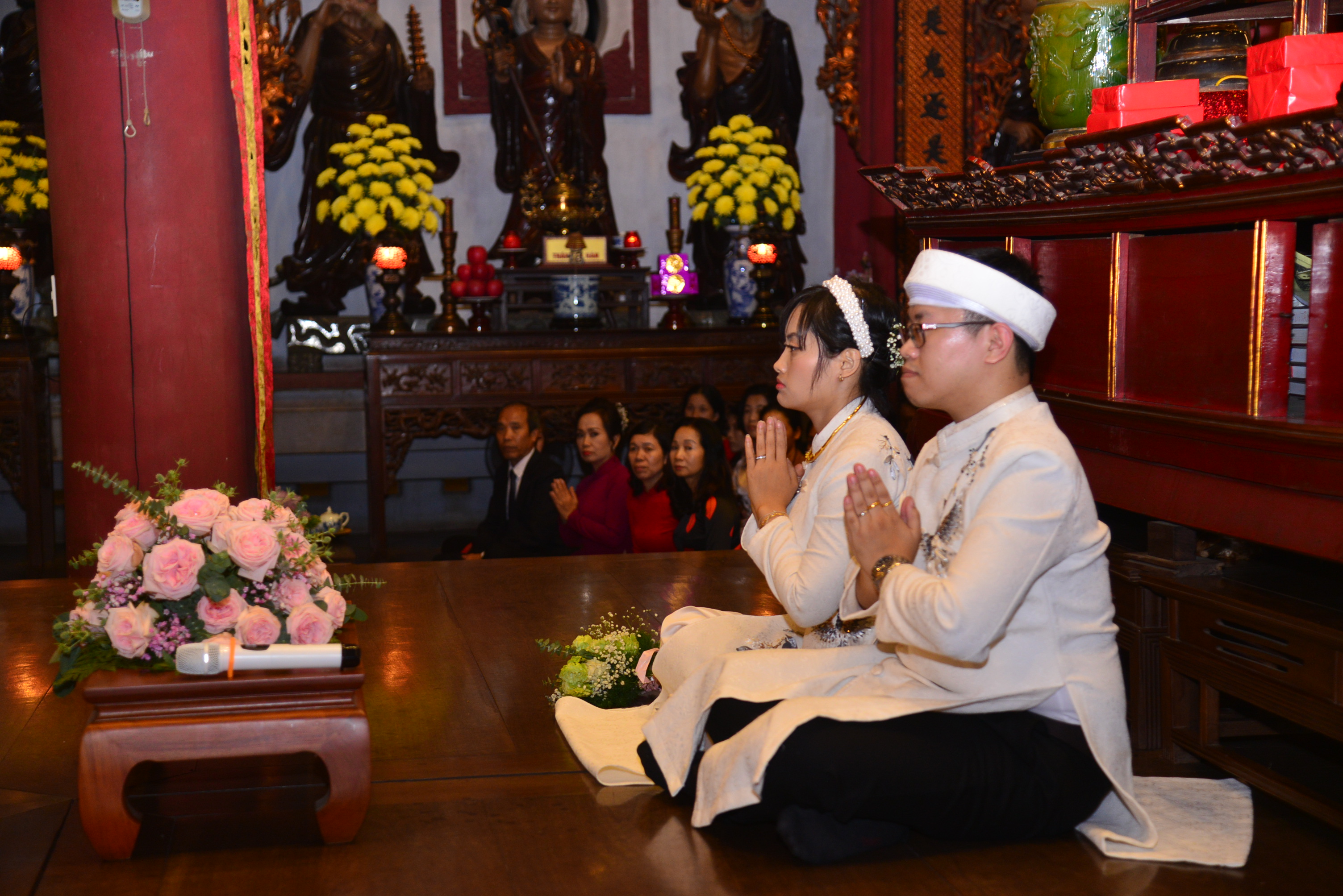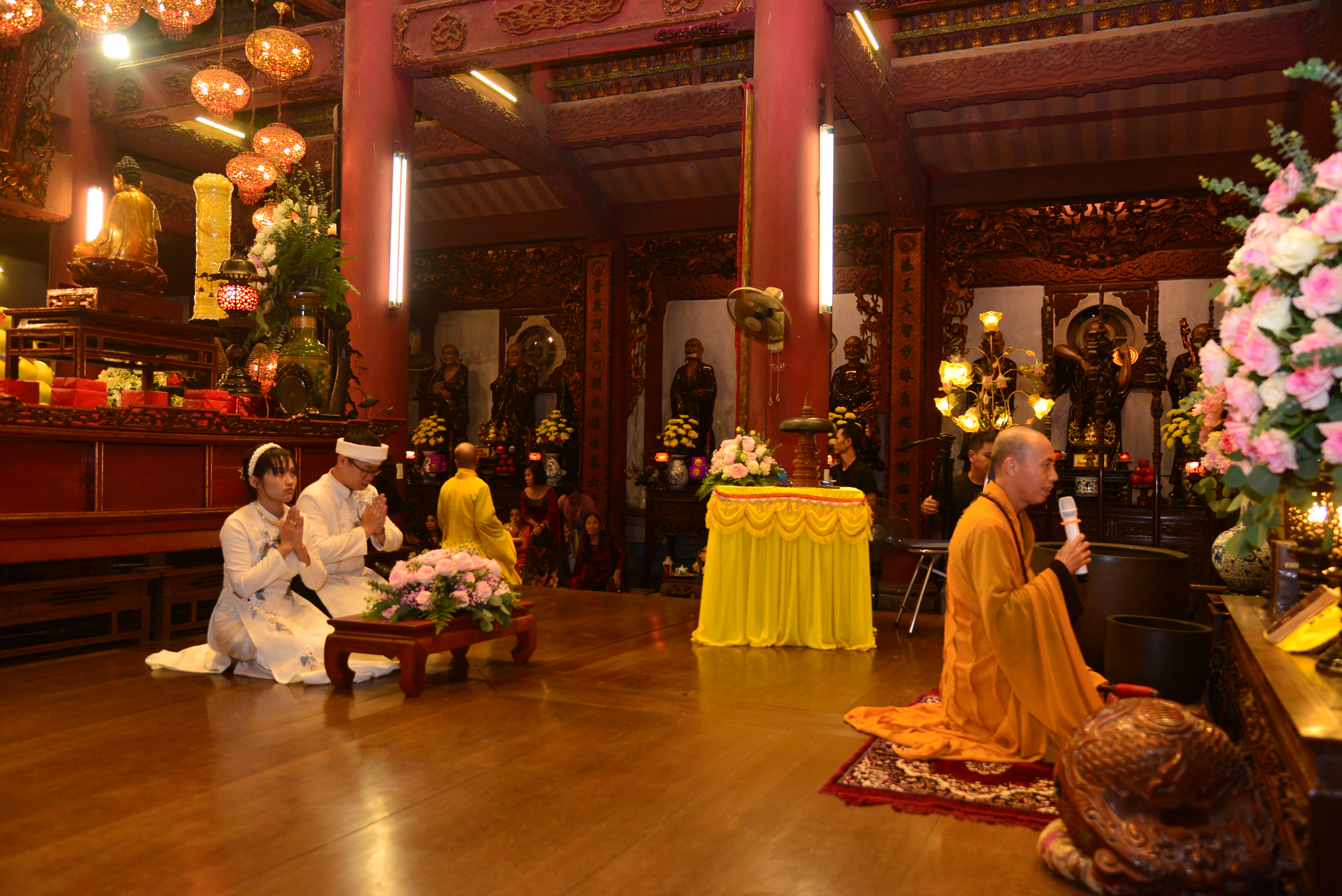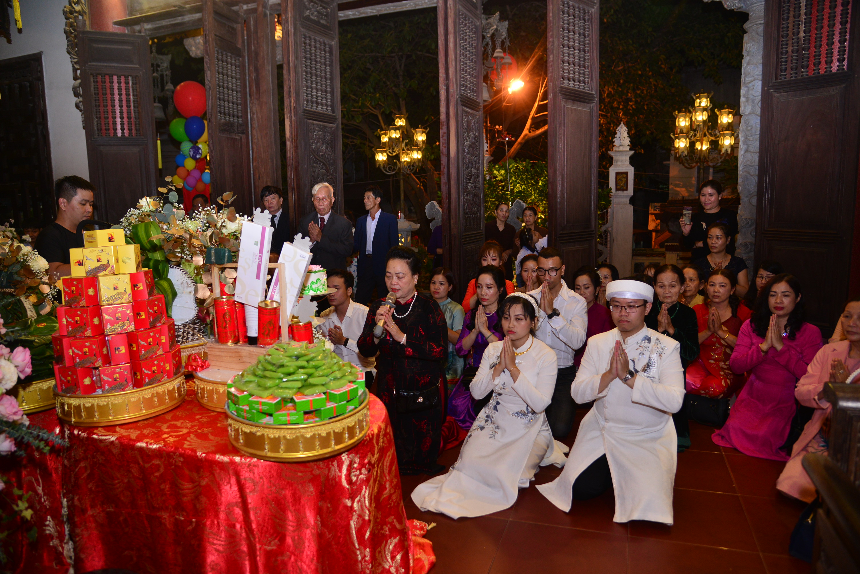 Dưới sự gia hộ của mười phương chư Phật và sự chứng minh hùng tráng của chư tôn đức Tăng trụ xứ, đôi bạn trẻ đã làm lễ tạ ơn Tam Bảo, lễ thụ ân công sinh thành dưỡng dục của hai đấng song thân và nghi lễ quỳ gối rót trà dâng lên cha mẹ. Cha mẹ của đôi tân lang và tân nương không khỏi xúc động khi đón nhận chén trà nóng đong đầy tình cảm gia đình từ tay các con của mình, chứng kiến sự trưởng thành của các con trong ngày lễ thiêng liêng, trọng đại này.