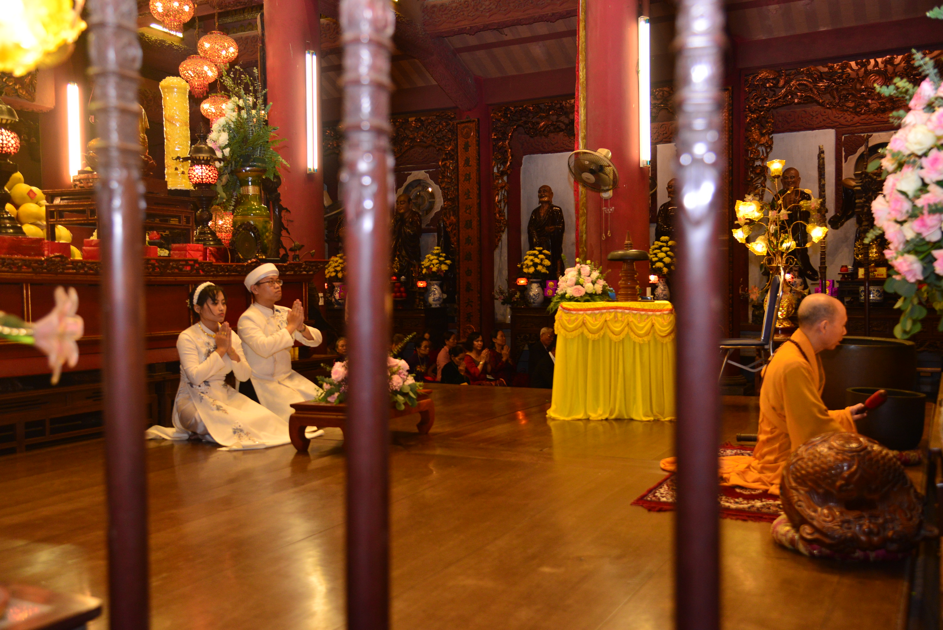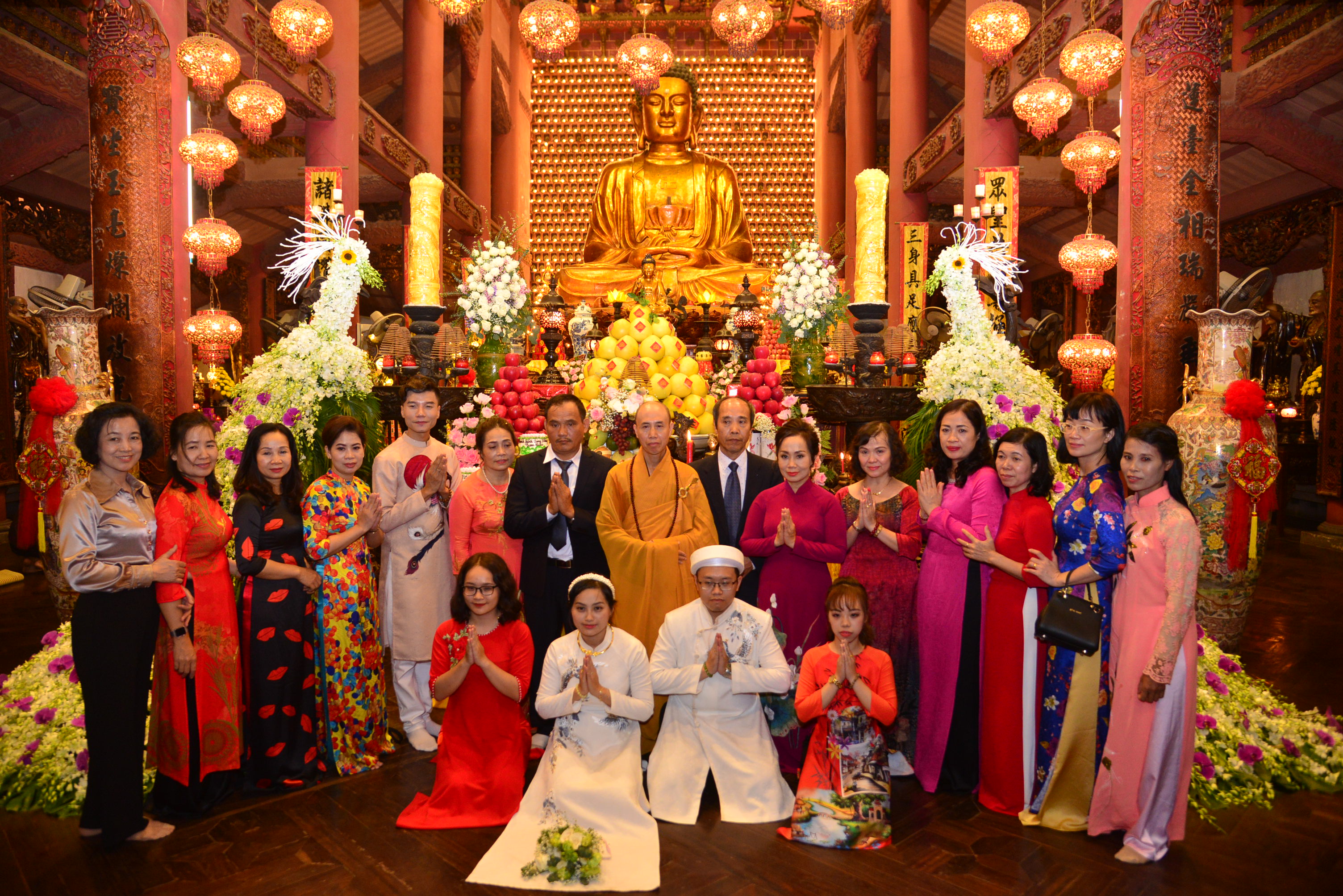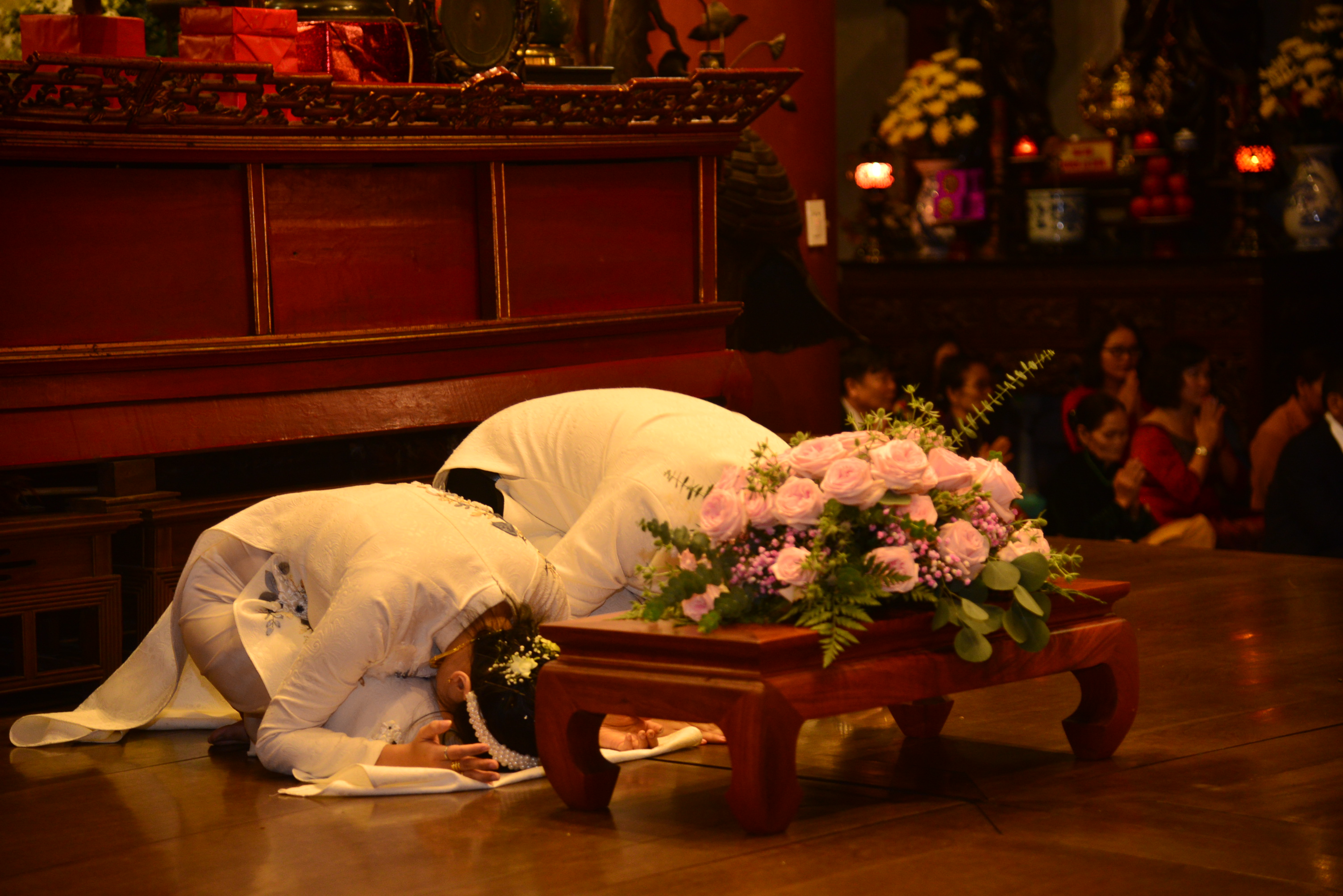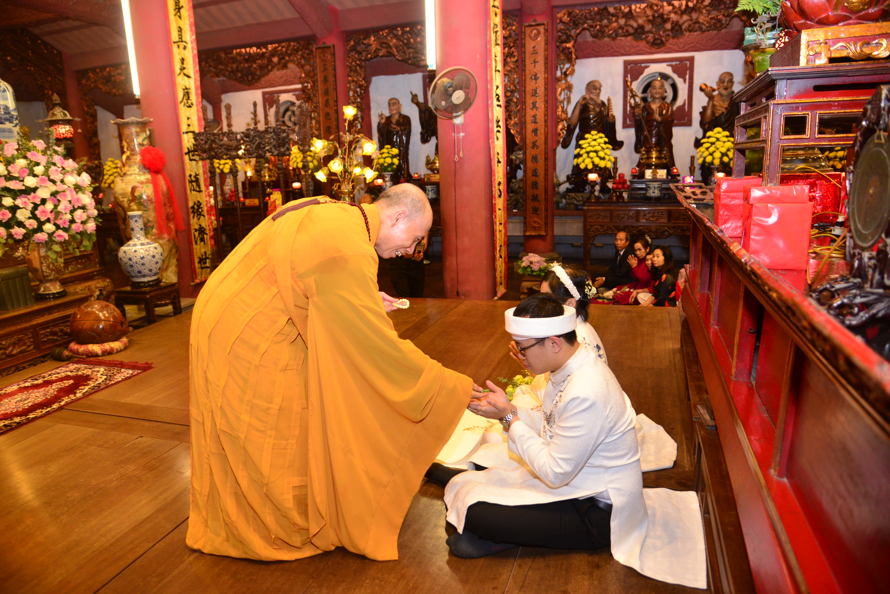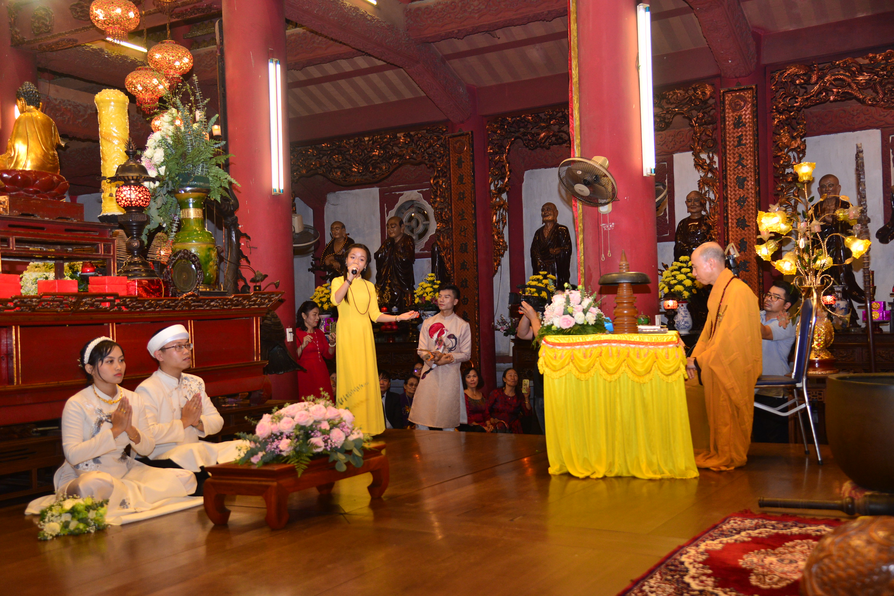 Dưới sự gia hộ của mười phương chư Phật và sự chứng minh hùng tráng của chư tôn đức Tăng trụ xứ, đôi bạn trẻ đã làm lễ tạ ơn Tam Bảo, lễ thụ ân công sinh thành dưỡng dục của hai đấng song thân và nghi lễ quỳ gối rót trà dâng lên cha mẹ. Cha mẹ của đôi tân lang và tân nương không khỏi xúc động khi đón nhận chén trà nóng đong đầy tình cảm gia đình từ tay các con của mình, chứng kiến sự trưởng thành của các con trong ngày lễ thiêng liêng, trọng đại này.