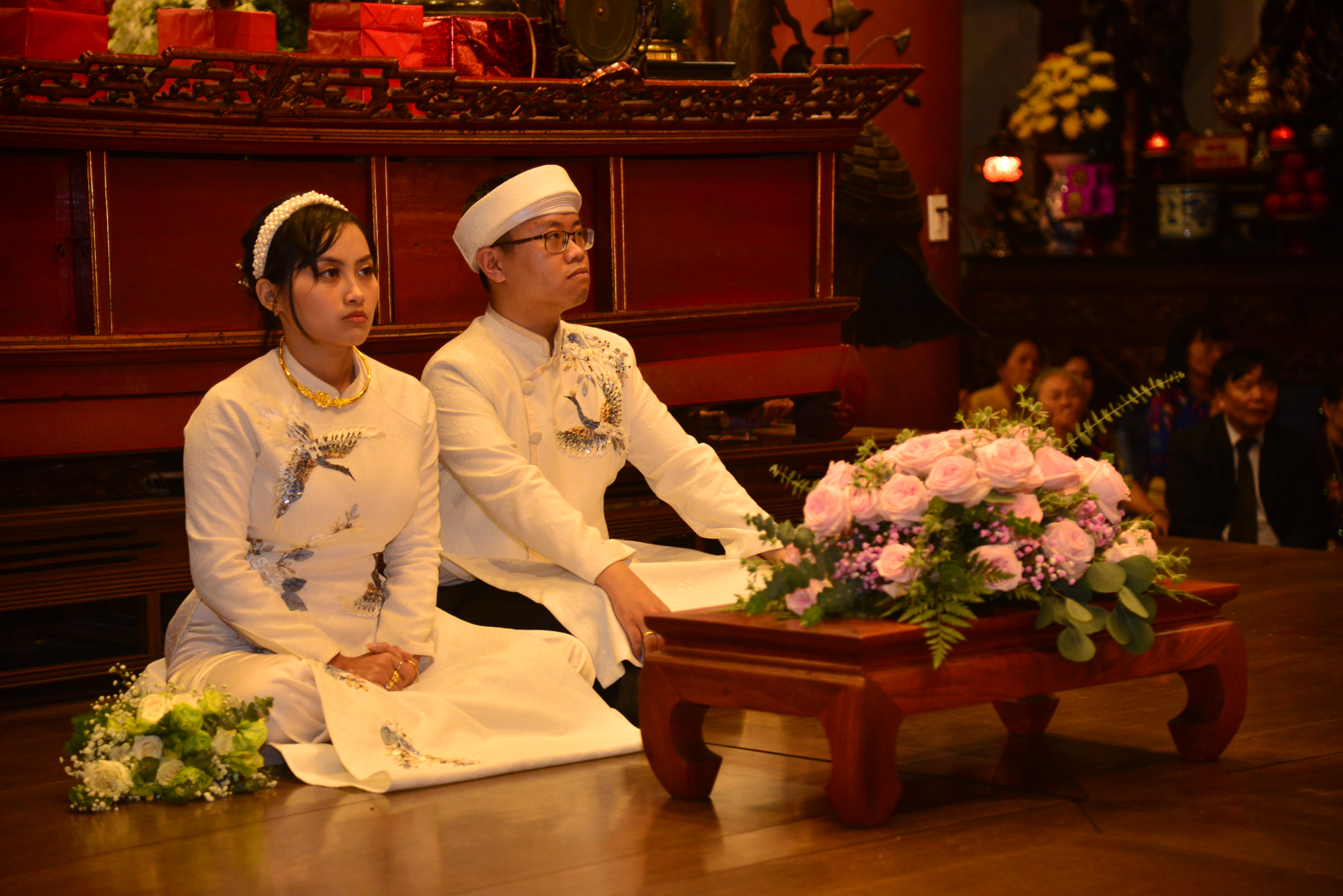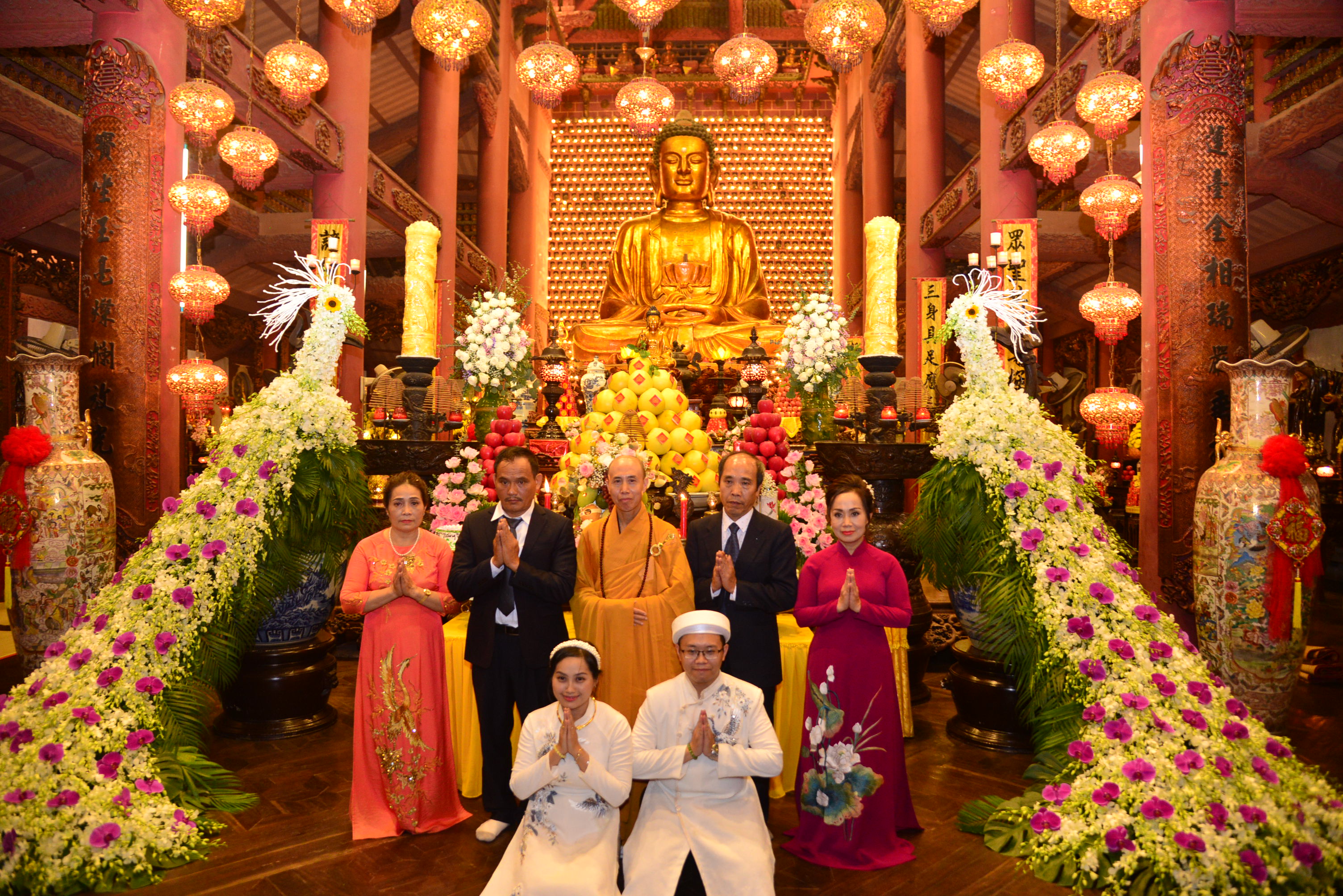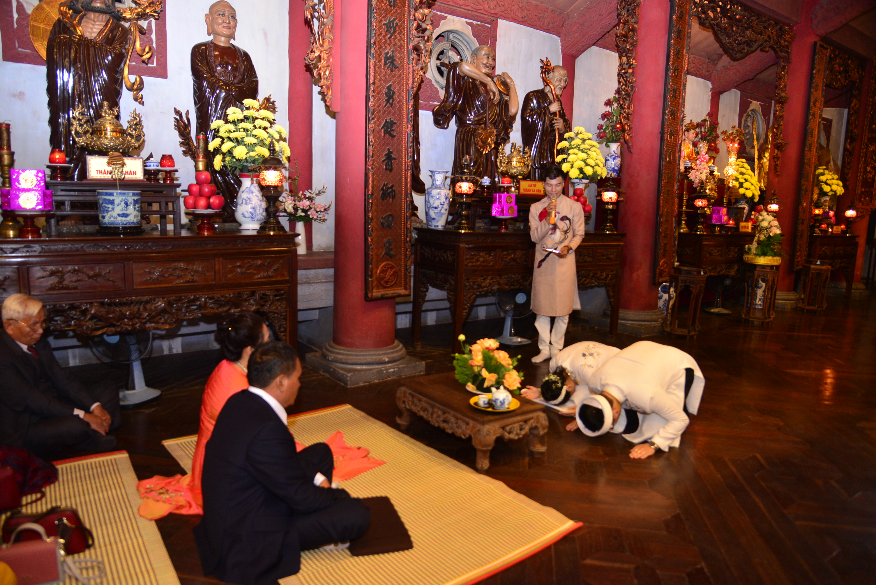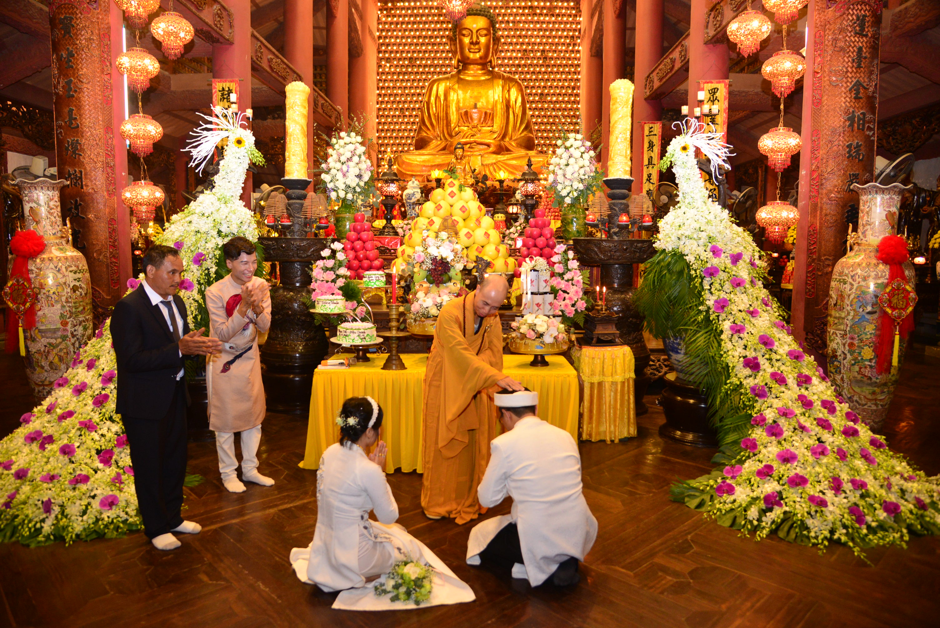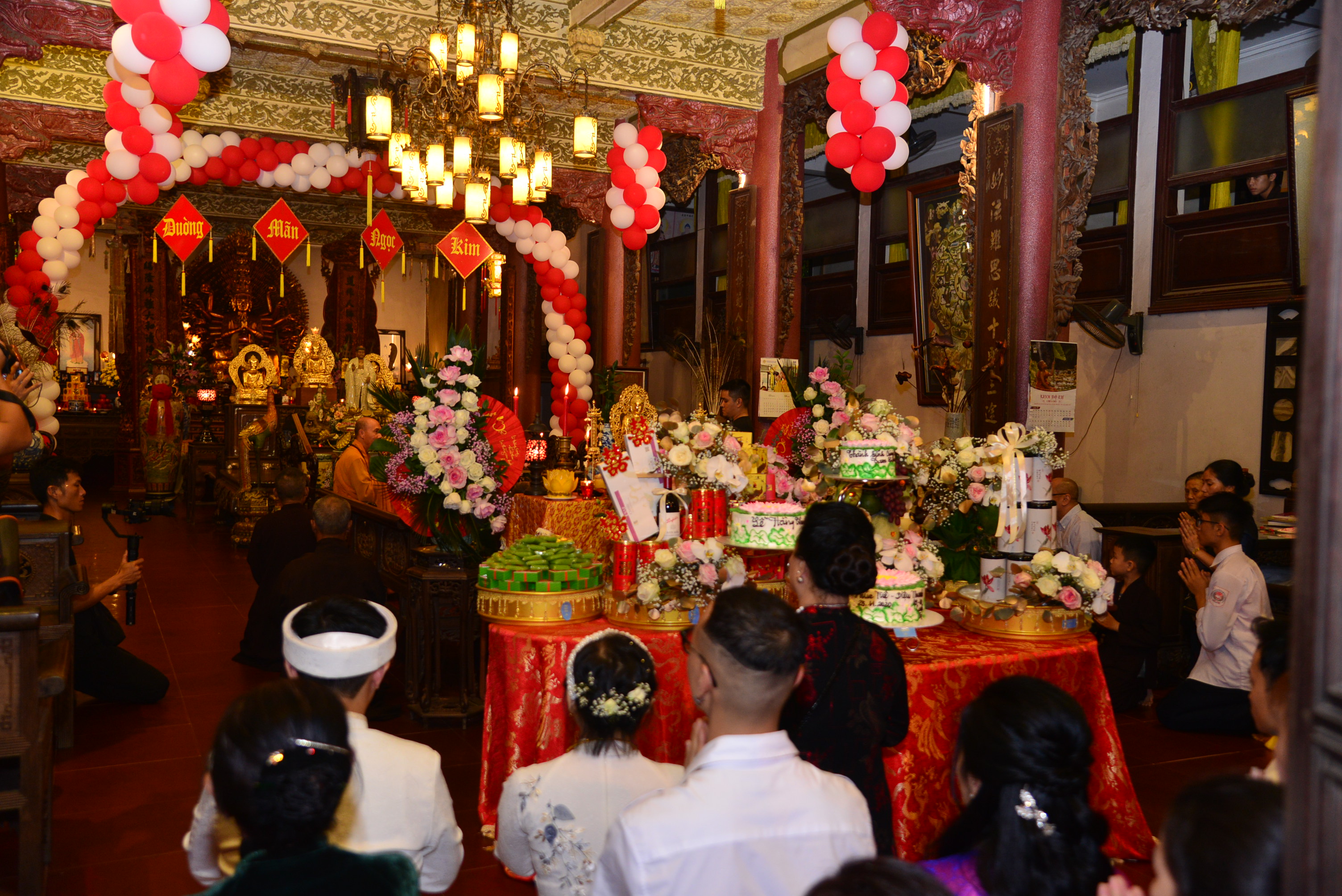 Dưới sự gia hộ của mười phương chư Phật và sự chứng minh hùng tráng của chư tôn đức Tăng trụ xứ, đôi bạn trẻ đã làm lễ tạ ơn Tam Bảo, lễ thụ ân công sinh thành dưỡng dục của hai đấng song thân và nghi lễ quỳ gối rót trà dâng lên cha mẹ. Cha mẹ của đôi tân lang và tân nương không khỏi xúc động khi đón nhận chén trà nóng đong đầy tình cảm gia đình từ tay các con của mình, chứng kiến sự trưởng thành của các con trong ngày lễ thiêng liêng, trọng đại này.