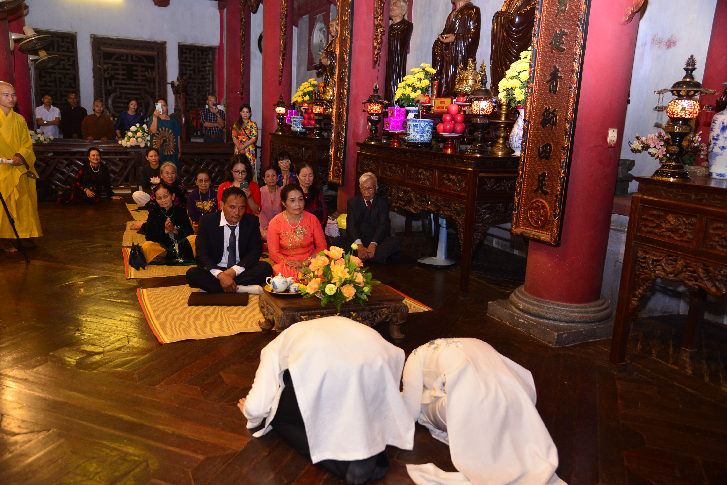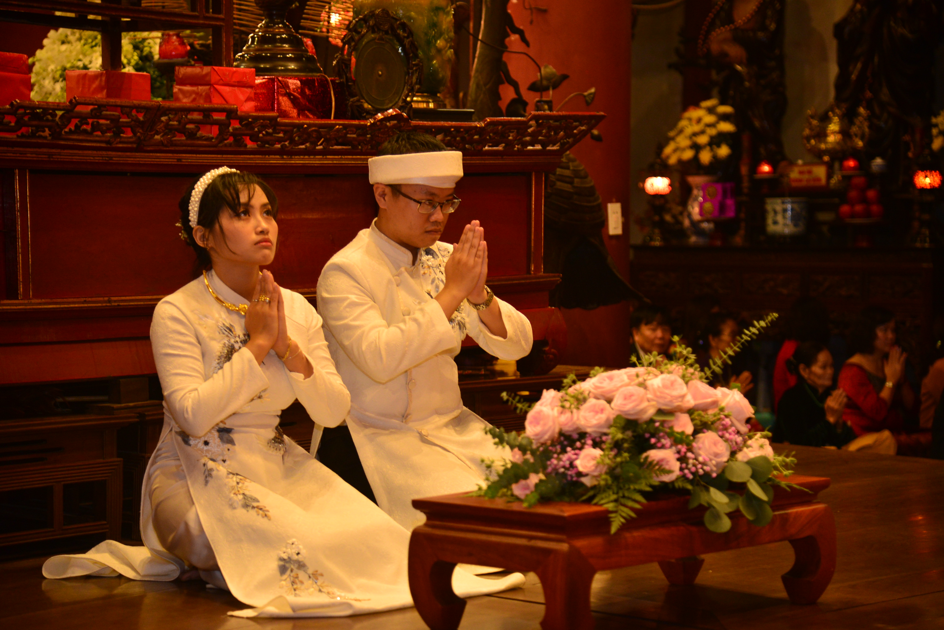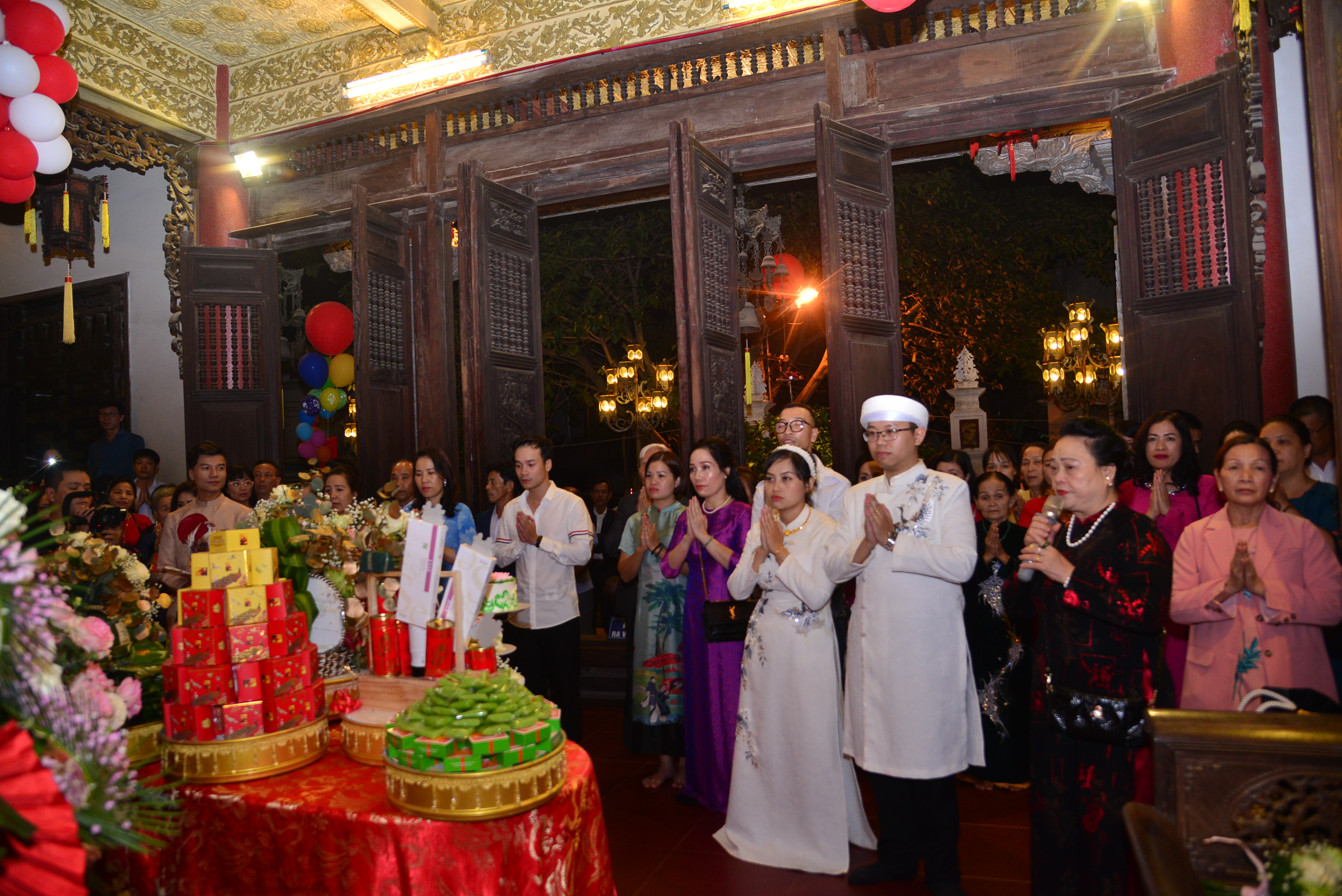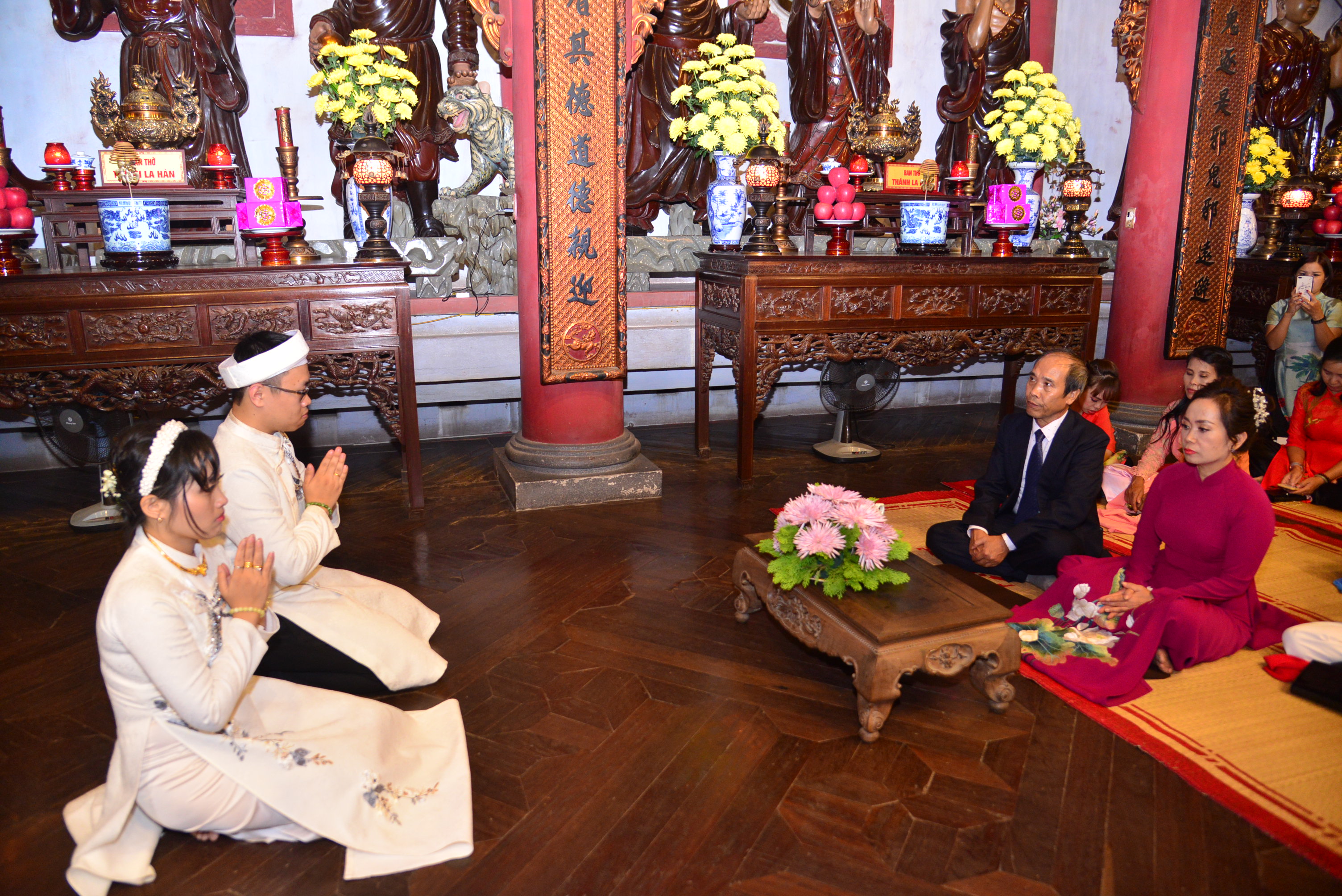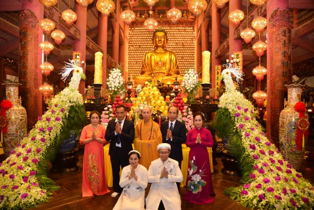 Dưới sự gia hộ của mười phương chư Phật và sự chứng minh hùng tráng của chư tôn đức Tăng trụ xứ, đôi bạn trẻ đã làm lễ tạ ơn Tam Bảo, lễ thụ ân công sinh thành dưỡng dục của hai đấng song thân và nghi lễ quỳ gối rót trà dâng lên cha mẹ. Cha mẹ của đôi tân lang và tân nương không khỏi xúc động khi đón nhận chén trà nóng đong đầy tình cảm gia đình từ tay các con của mình, chứng kiến sự trưởng thành của các con trong ngày lễ thiêng liêng, trọng đại này.