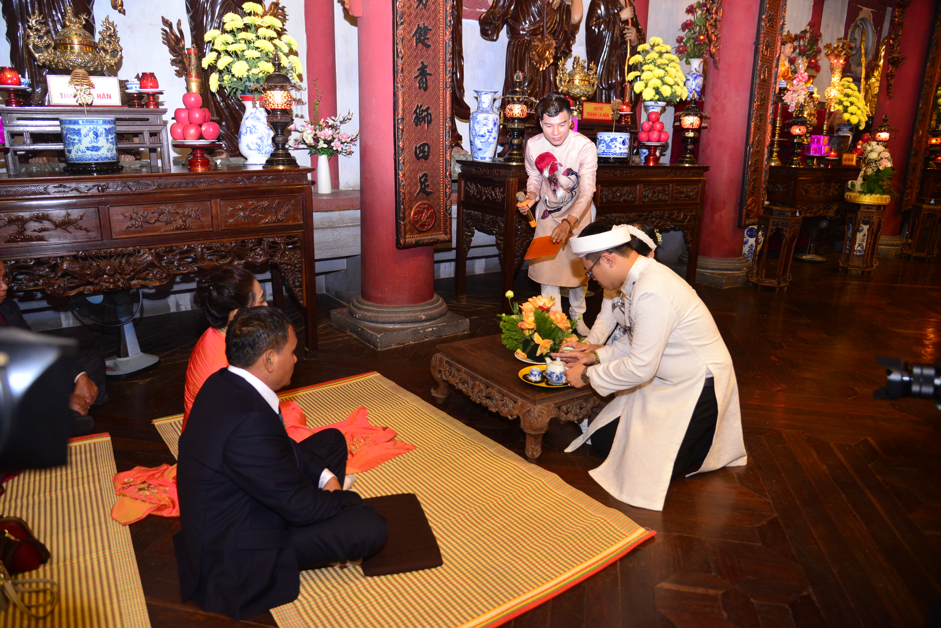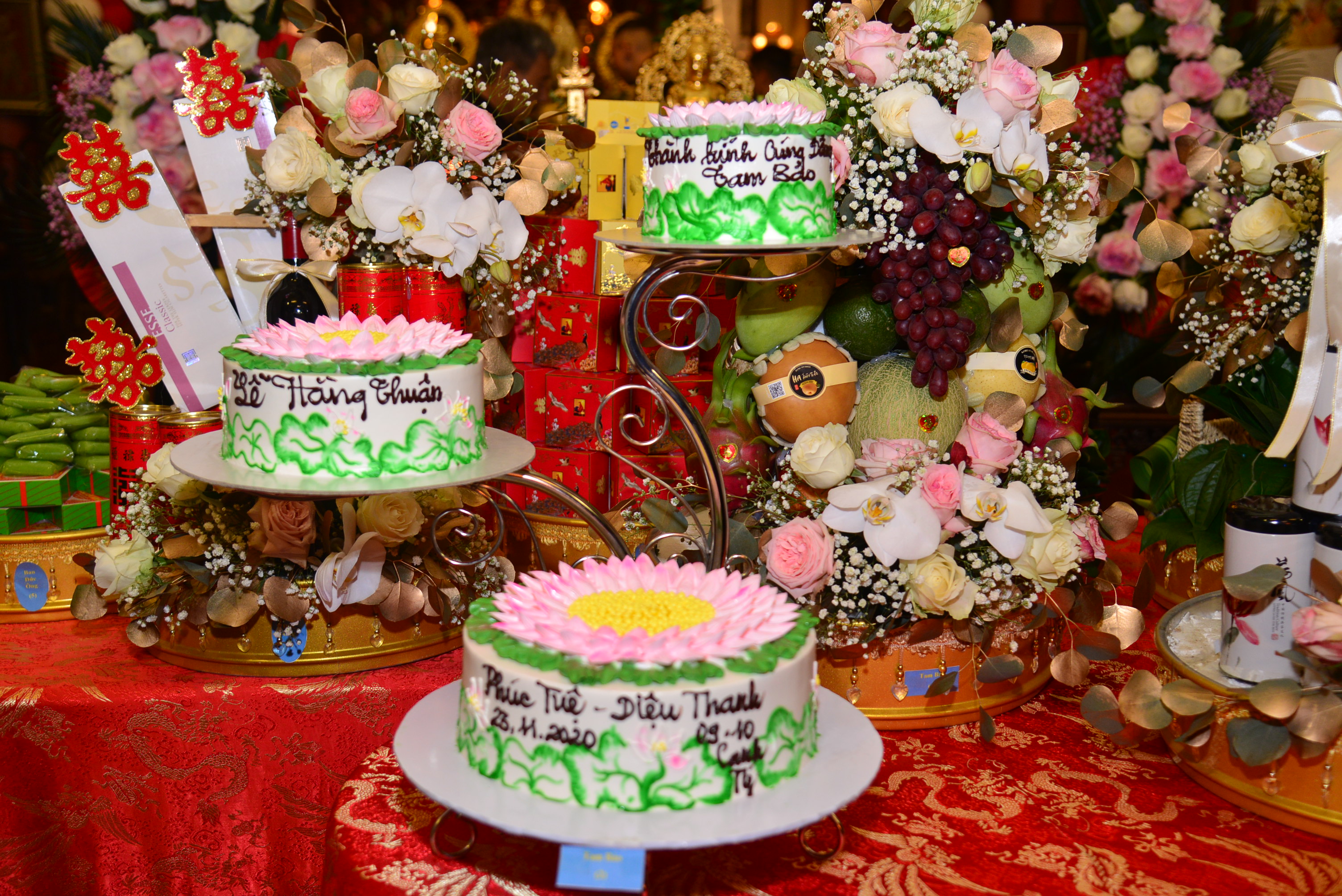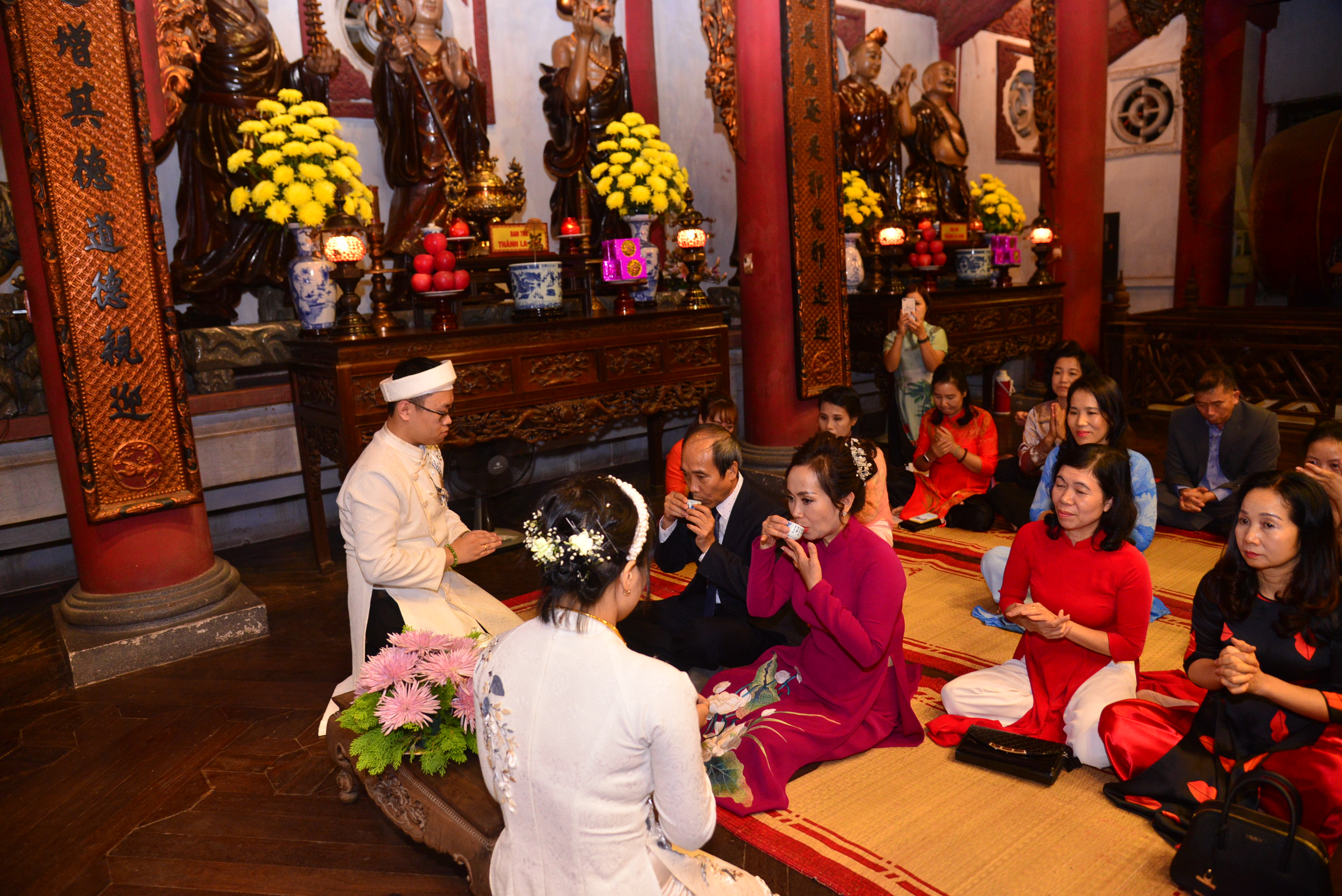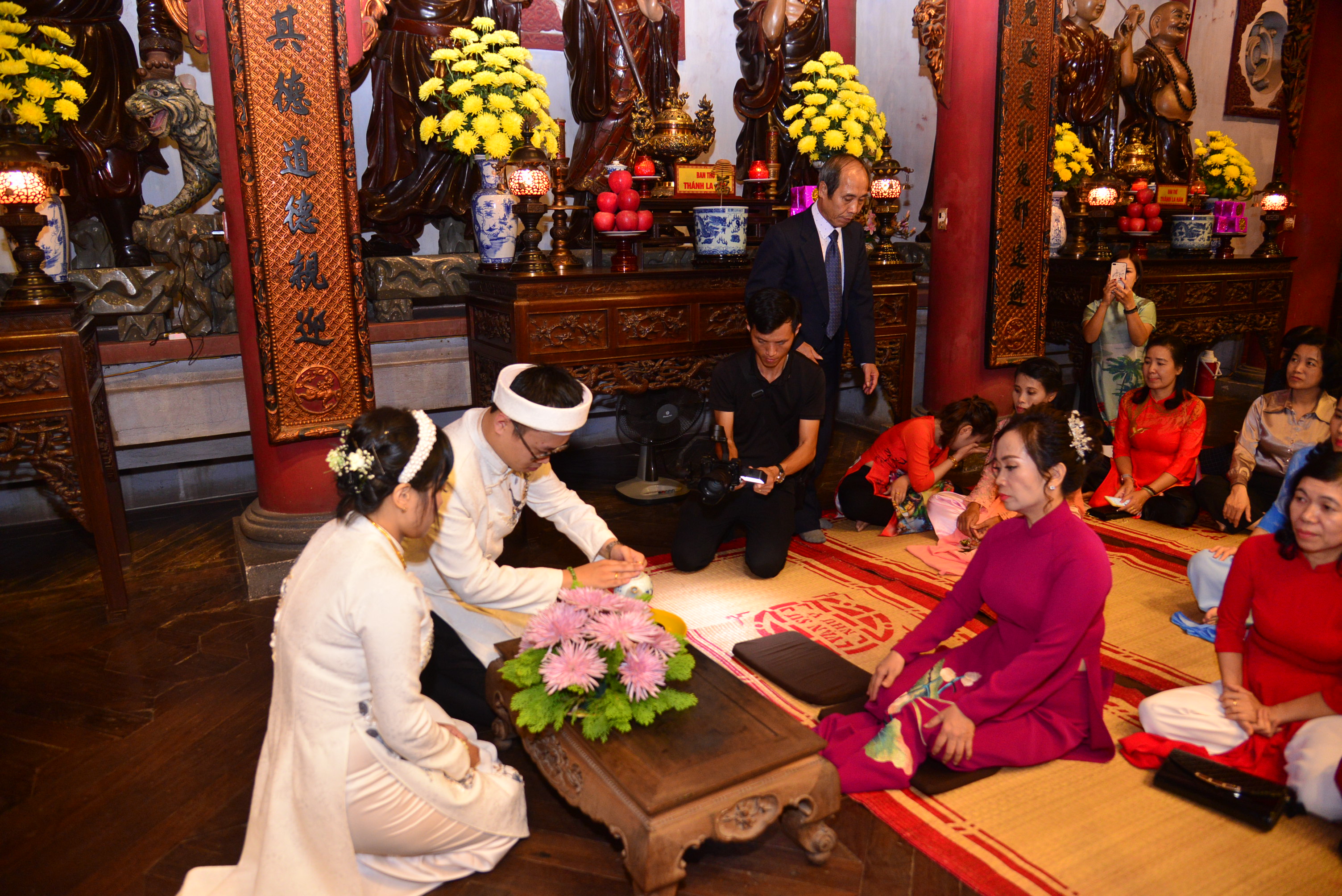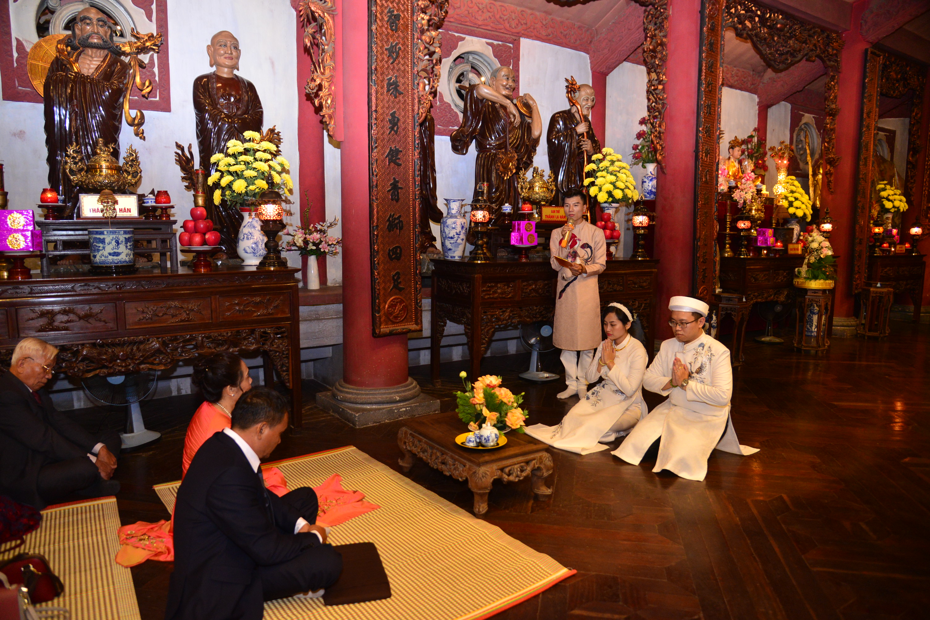 Dưới sự gia hộ của mười phương chư Phật và sự chứng minh hùng tráng của chư tôn đức Tăng trụ xứ, đôi bạn trẻ đã làm lễ tạ ơn Tam Bảo, lễ thụ ân công sinh thành dưỡng dục của hai đấng song thân và nghi lễ quỳ gối rót trà dâng lên cha mẹ. Cha mẹ của đôi tân lang và tân nương không khỏi xúc động khi đón nhận chén trà nóng đong đầy tình cảm gia đình từ tay các con của mình, chứng kiến sự trưởng thành của các con trong ngày lễ thiêng liêng, trọng đại này.