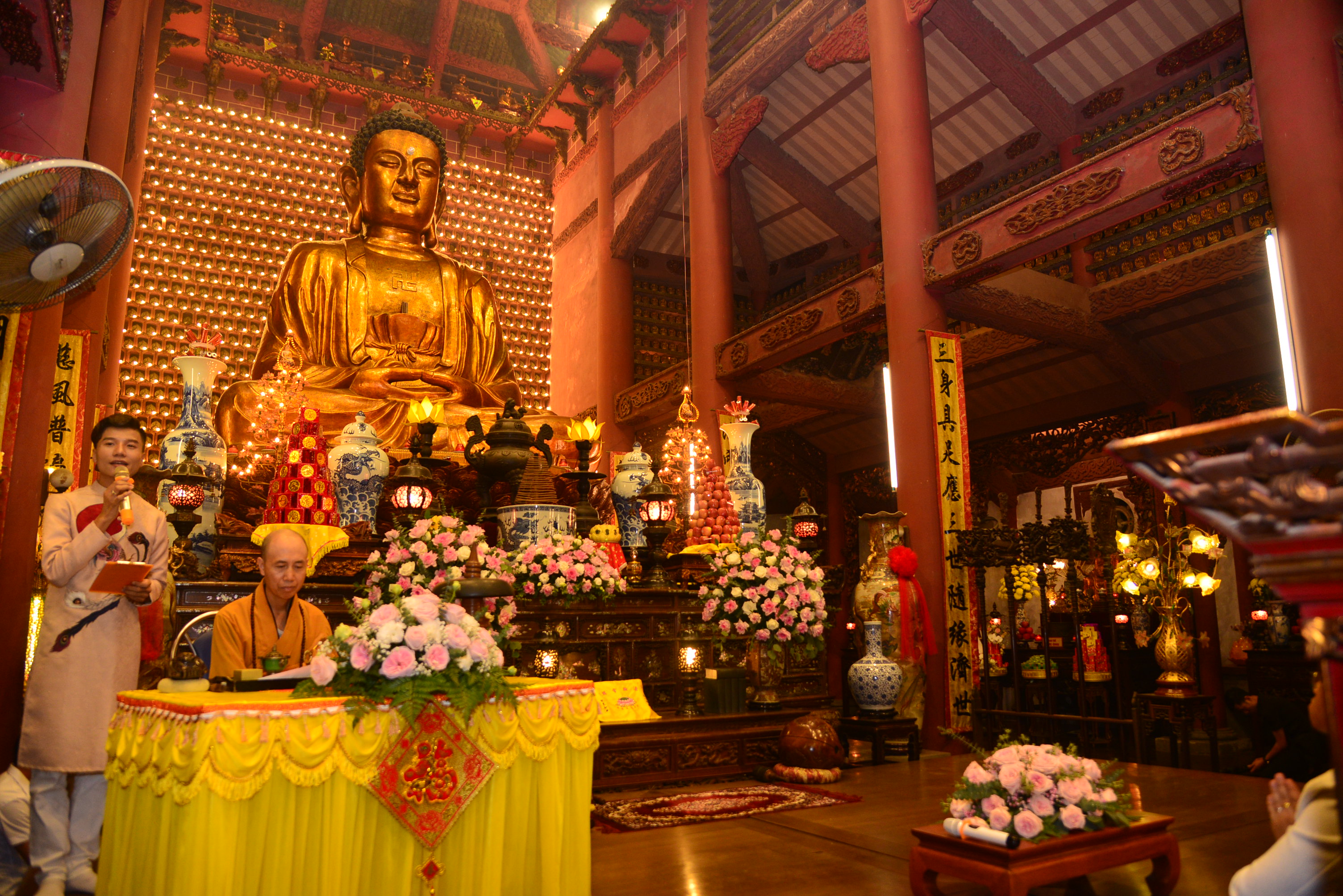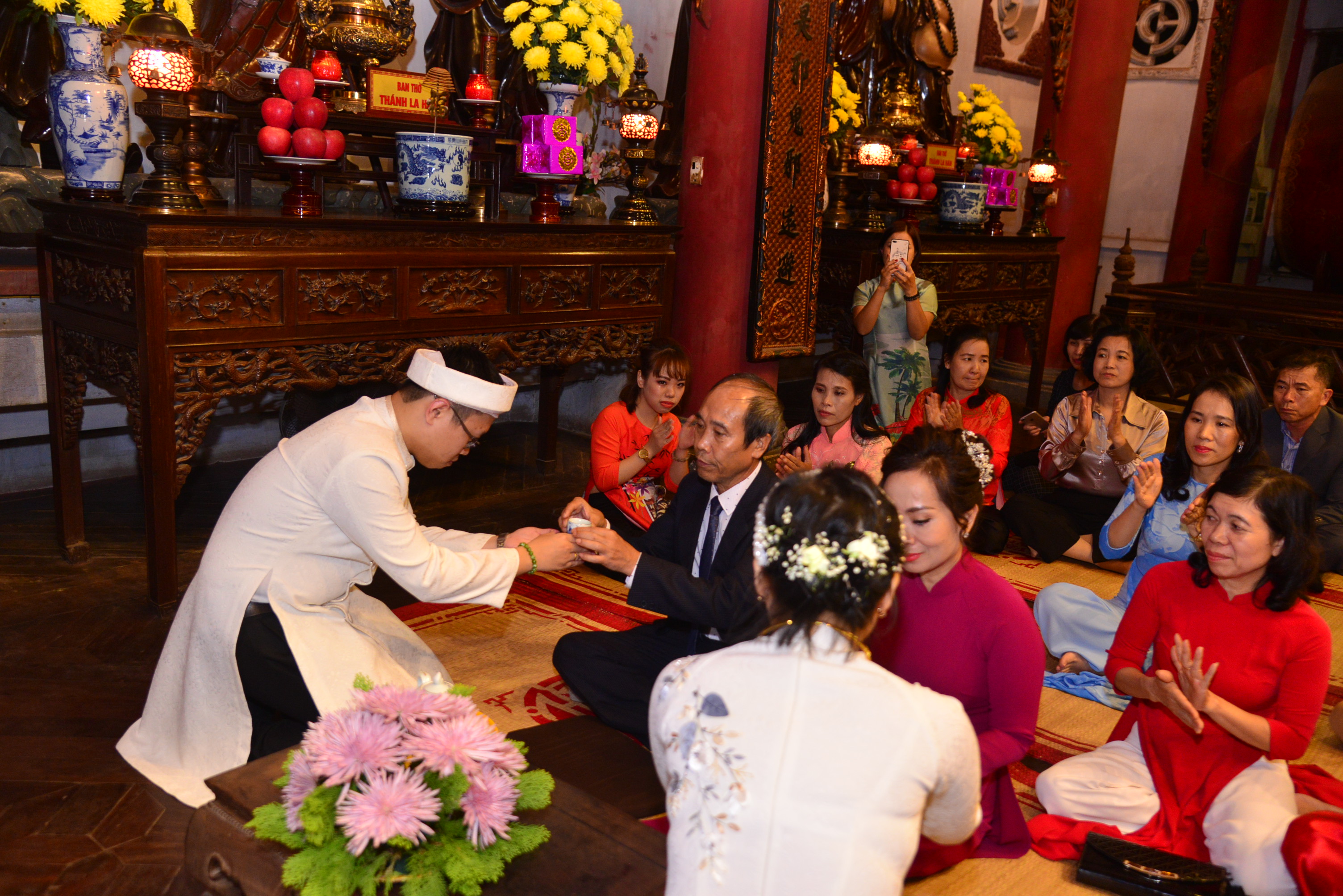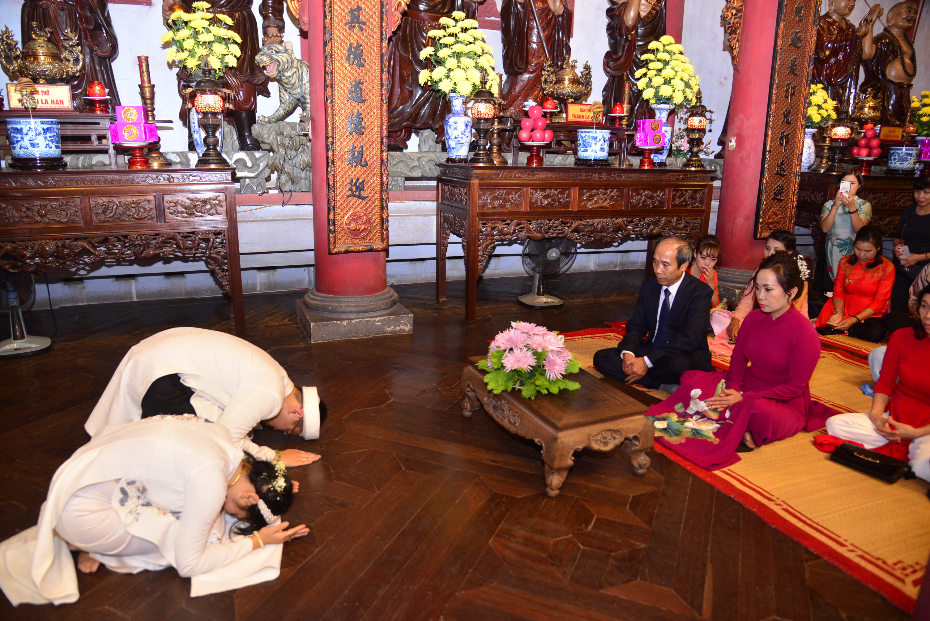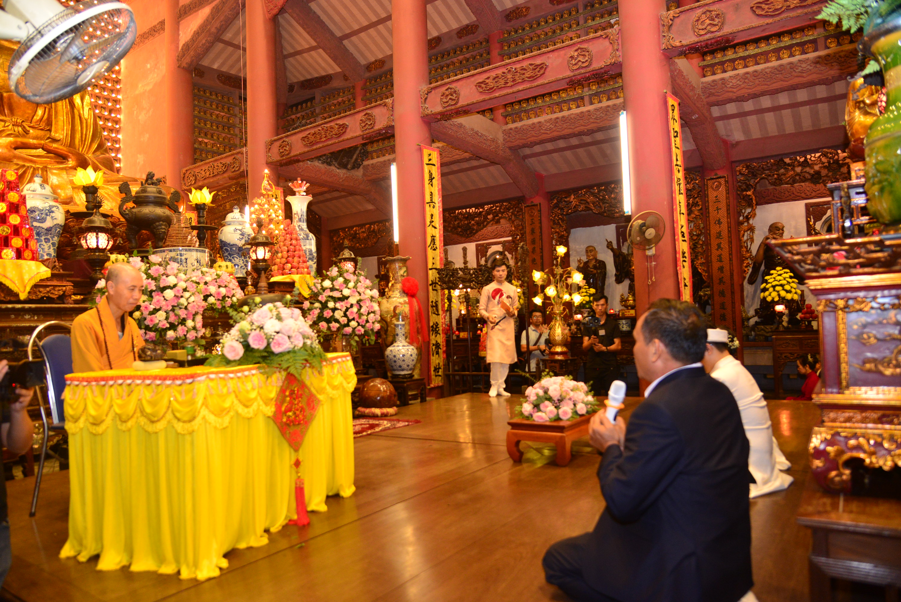 Dưới sự gia hộ của mười phương chư Phật và sự chứng minh hùng tráng của chư tôn đức Tăng trụ xứ, đôi bạn trẻ đã làm lễ tạ ơn Tam Bảo, lễ thụ ân công sinh thành dưỡng dục của hai đấng song thân và nghi lễ quỳ gối rót trà dâng lên cha mẹ. Cha mẹ của đôi tân lang và tân nương không khỏi xúc động khi đón nhận chén trà nóng đong đầy tình cảm gia đình từ tay các con của mình, chứng kiến sự trưởng thành của các con trong ngày lễ thiêng liêng, trọng đại này.