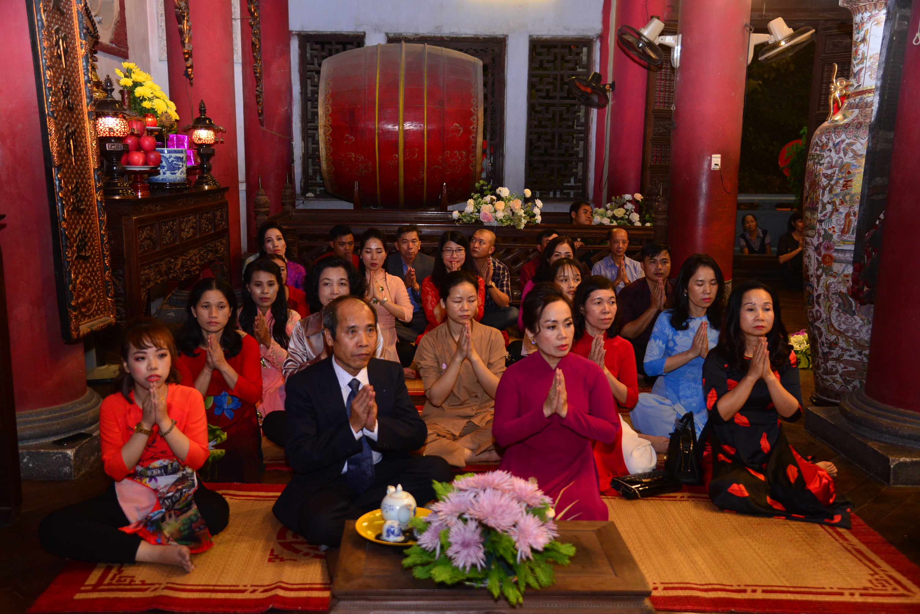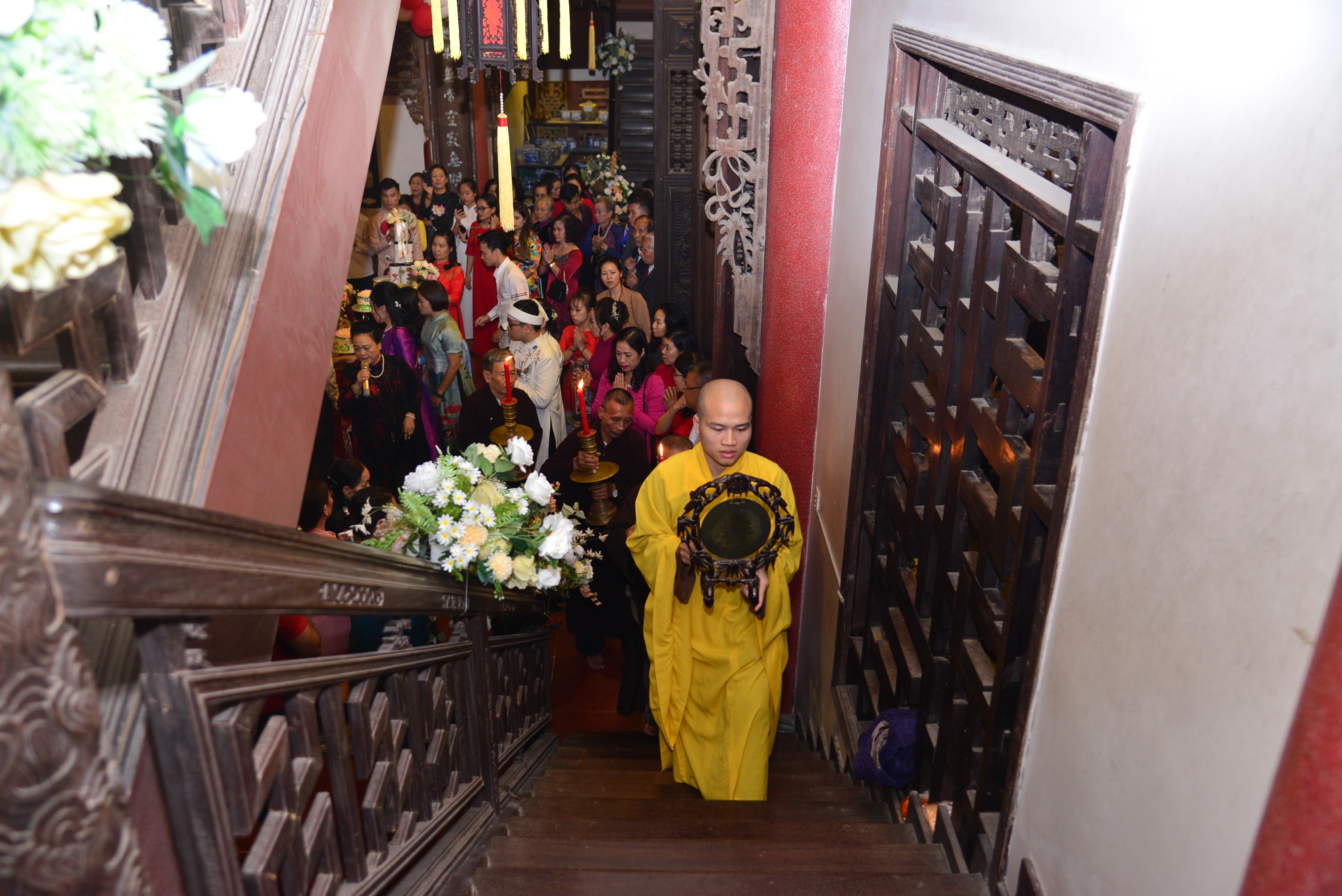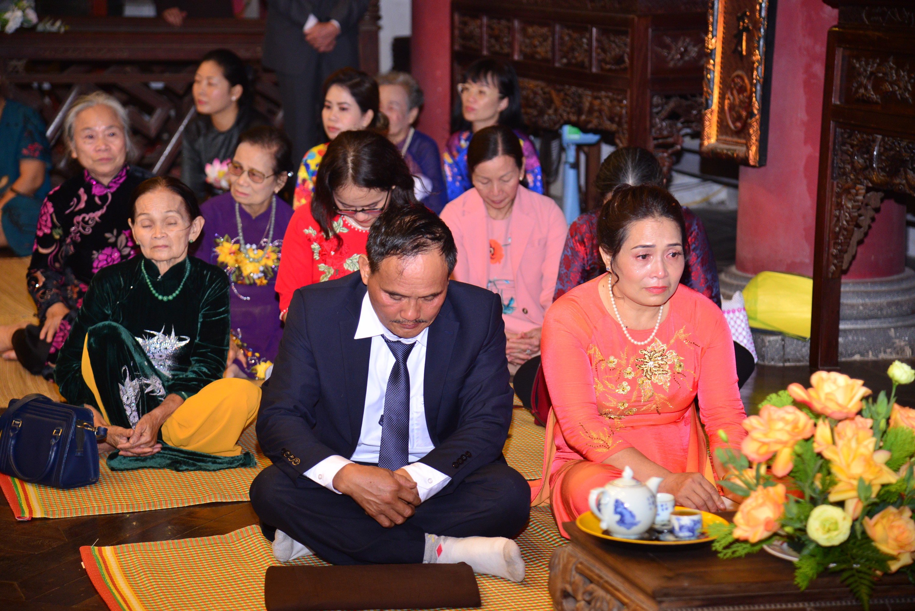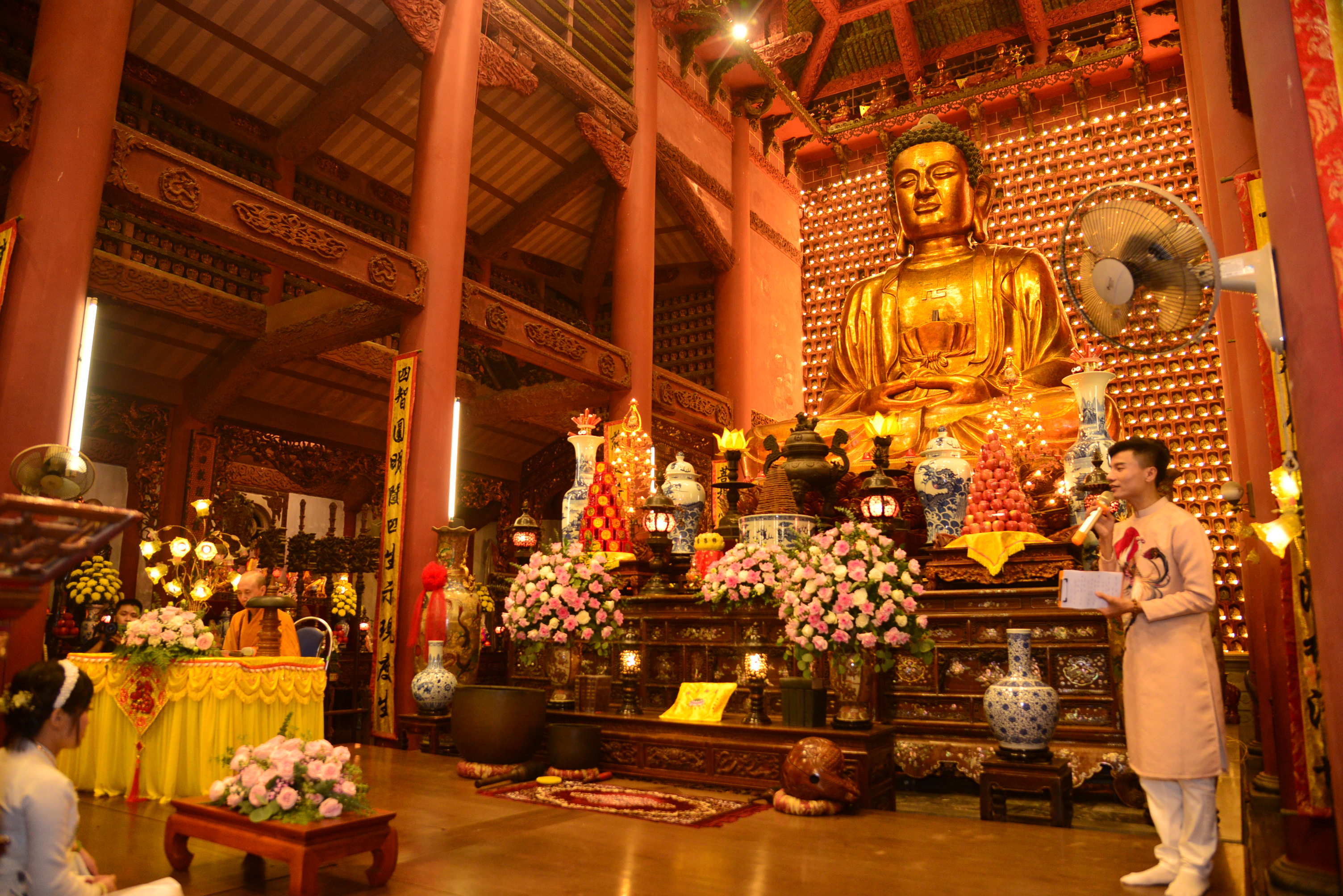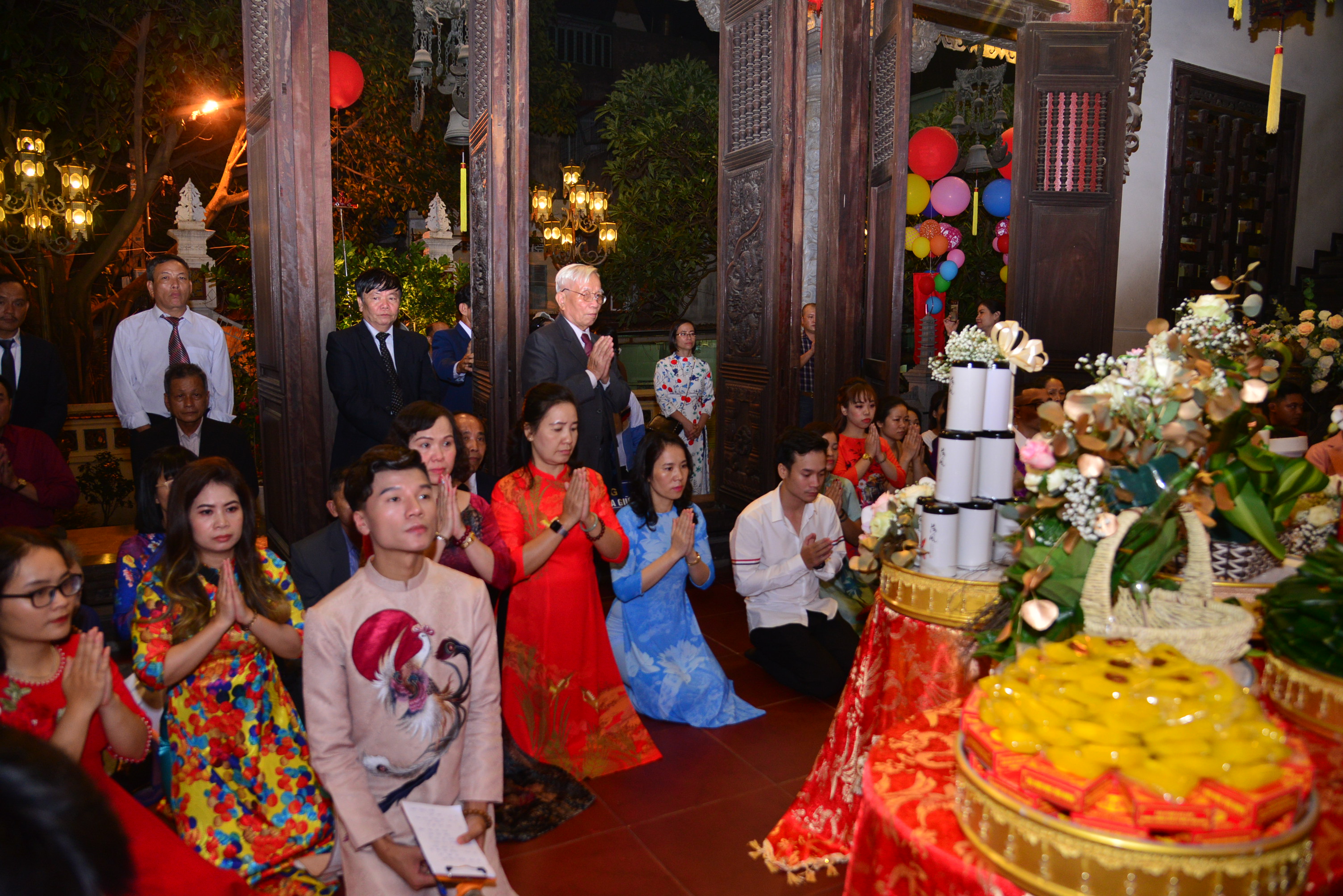 Dưới sự gia hộ của mười phương chư Phật và sự chứng minh hùng tráng của chư tôn đức Tăng trụ xứ, đôi bạn trẻ đã làm lễ tạ ơn Tam Bảo, lễ thụ ân công sinh thành dưỡng dục của hai đấng song thân và nghi lễ quỳ gối rót trà dâng lên cha mẹ. Cha mẹ của đôi tân lang và tân nương không khỏi xúc động khi đón nhận chén trà nóng đong đầy tình cảm gia đình từ tay các con của mình, chứng kiến sự trưởng thành của các con trong ngày lễ thiêng liêng, trọng đại này.