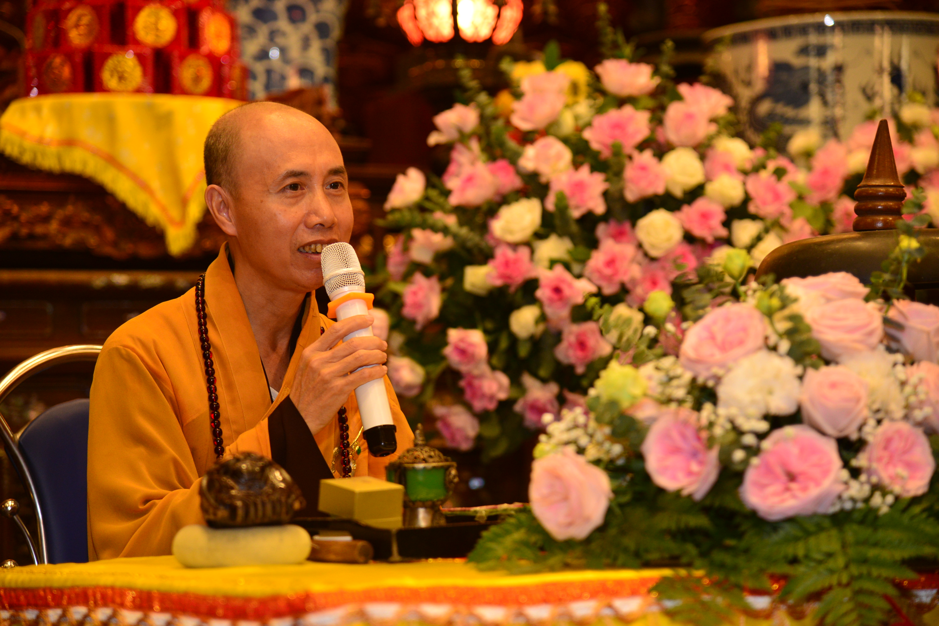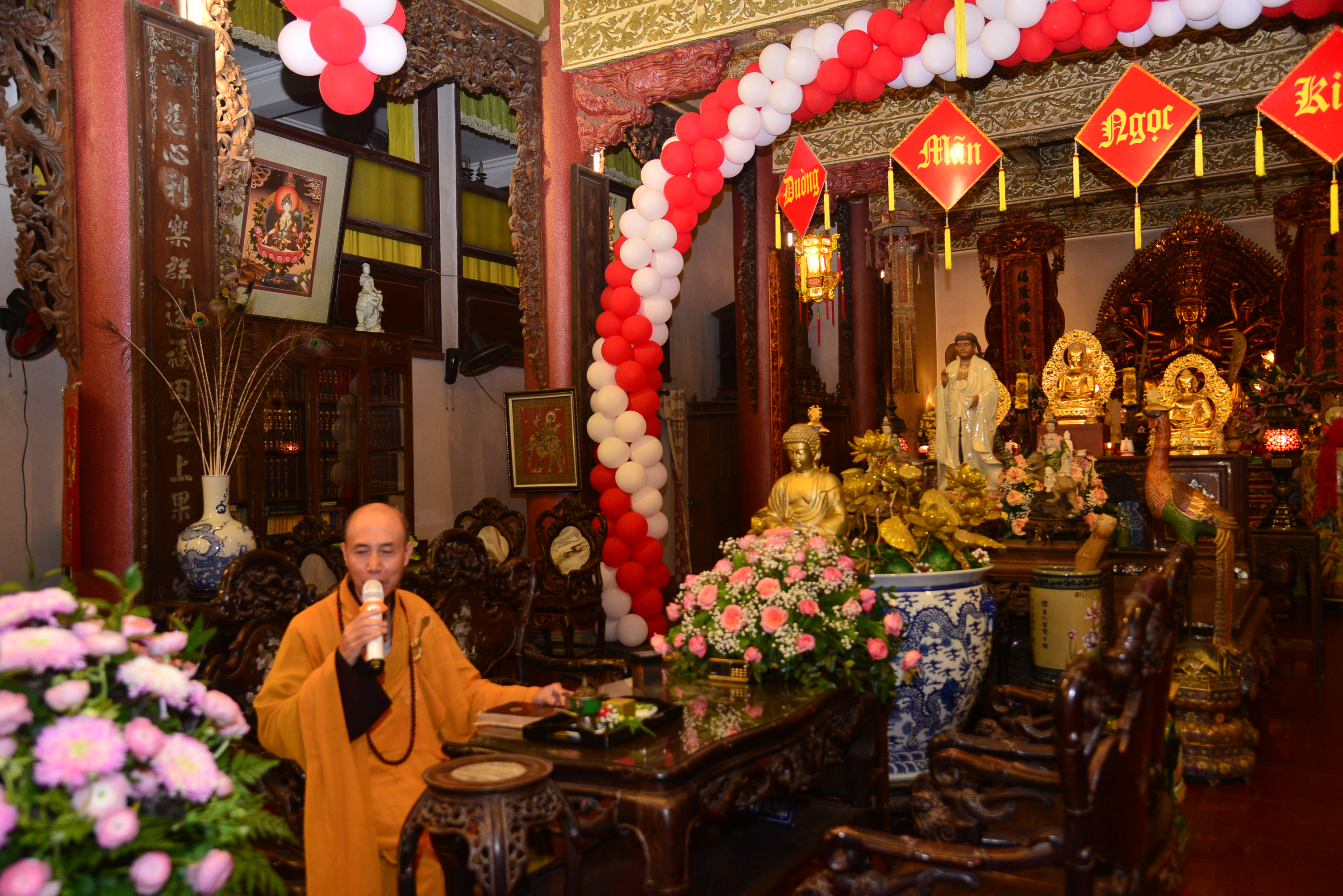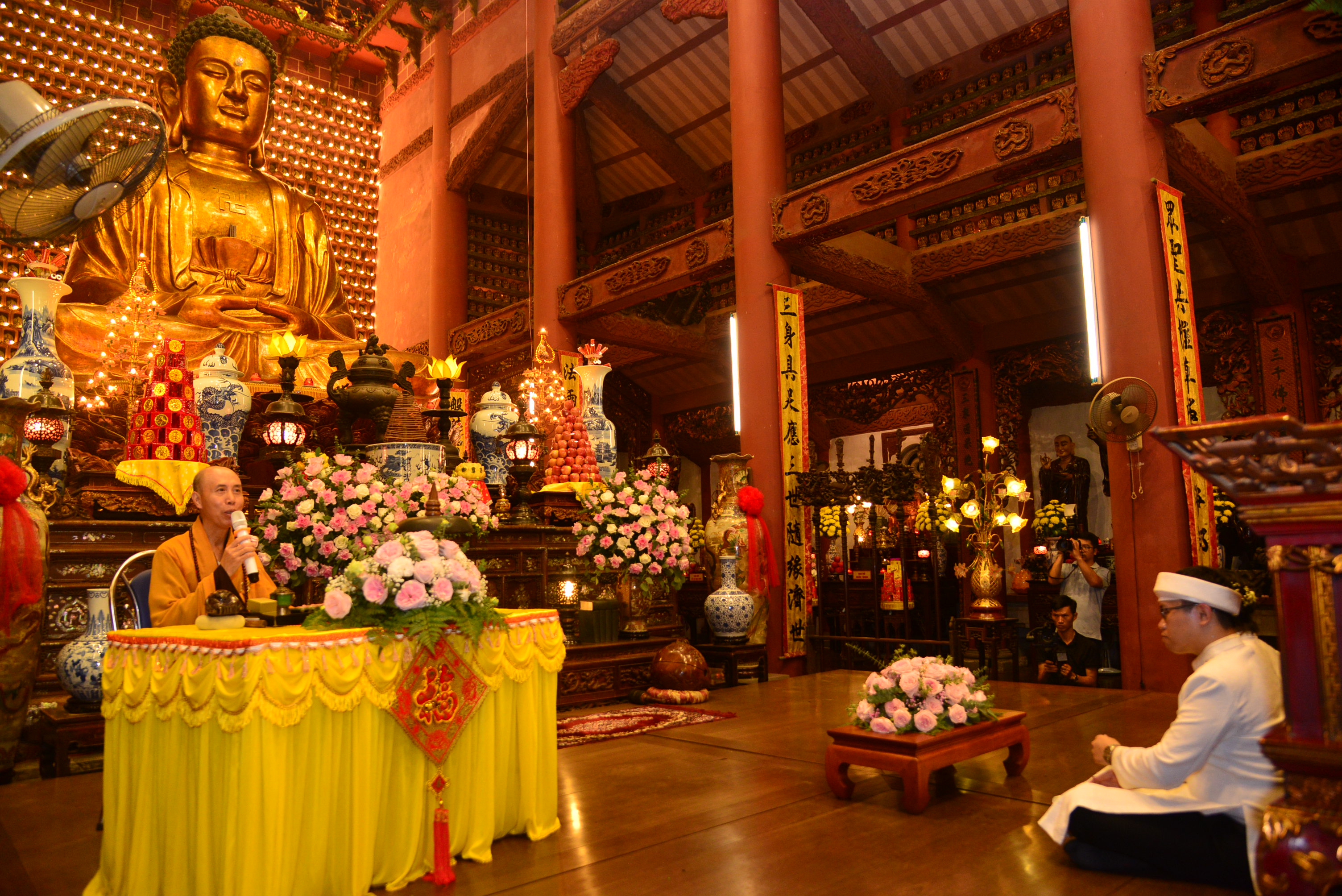 Tiếp đó, đôi tân lang, tân nương và đại chúng đã được Đại đức trụ trì bố thí cho một thời pháp ngắn chia sẻ về đạo nghĩa vợ chồng đã được Đức Phật thuyết trong kinh điển. Theo đó, trong kinh Thiện Sinh, Đức Phật đã chỉ dạy rất rõ cho chúng ta về bổn phận của của người vợ đối với chồng và gia đình bên chồng, cũng như bổn phận của người chống đối với vợ và gia đình bên vợ; bổn phận của cha mẹ đối với con cái và bổn phận của con cái đối với cha mẹ…Ngoài ra, Đại đức còn giảng giải cho hai bạn hiểu về ý nghĩa của chiếc nhẫn cũng như ý nghĩa của chữ “Nhẫn” đối với hạnh phúc gia đình. Nhẫn ở đây là sự nhẫn nhịn, vợ chồng phải biết nhường nhịn, nhẫn nhịn nhau, tôn trọng nhau; “Nhẫn” ở đây chính là sự tu dưỡng đạo đức và tu dưỡng phẩm hạnh. Một gia đình có được êm ấm, có được hòa thuận hay không, phần lớn là do sự nhẫn nhịn quyết định.
