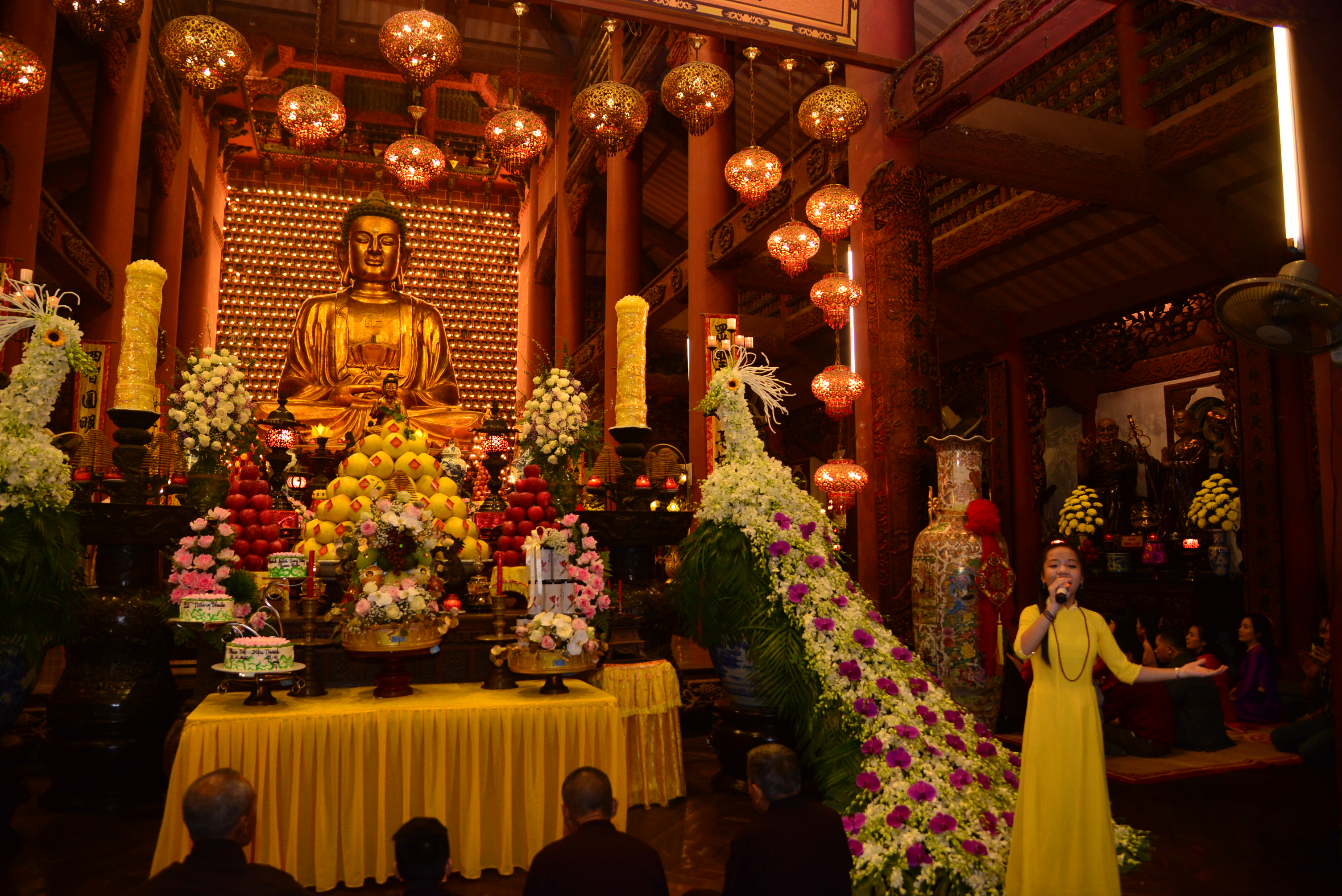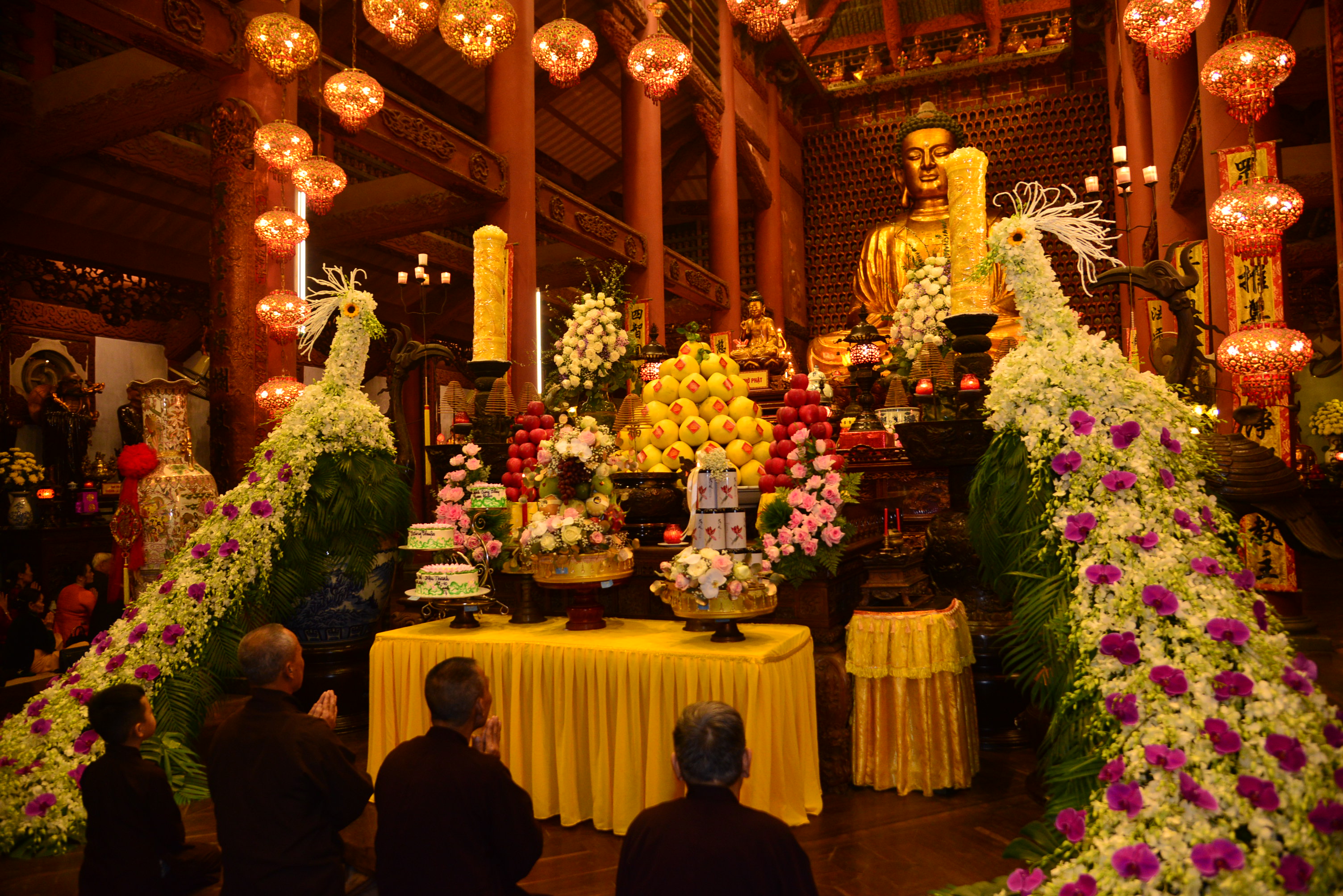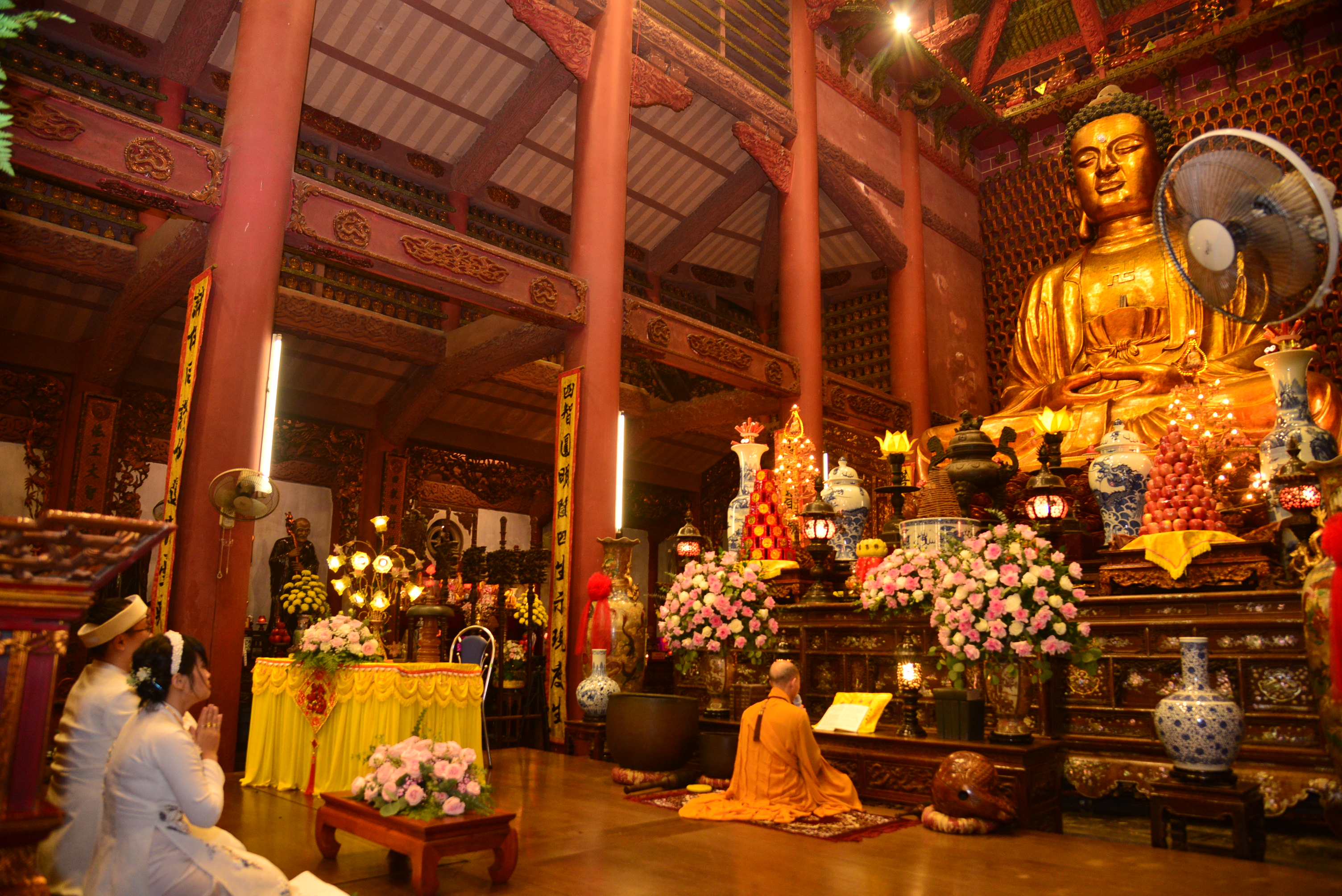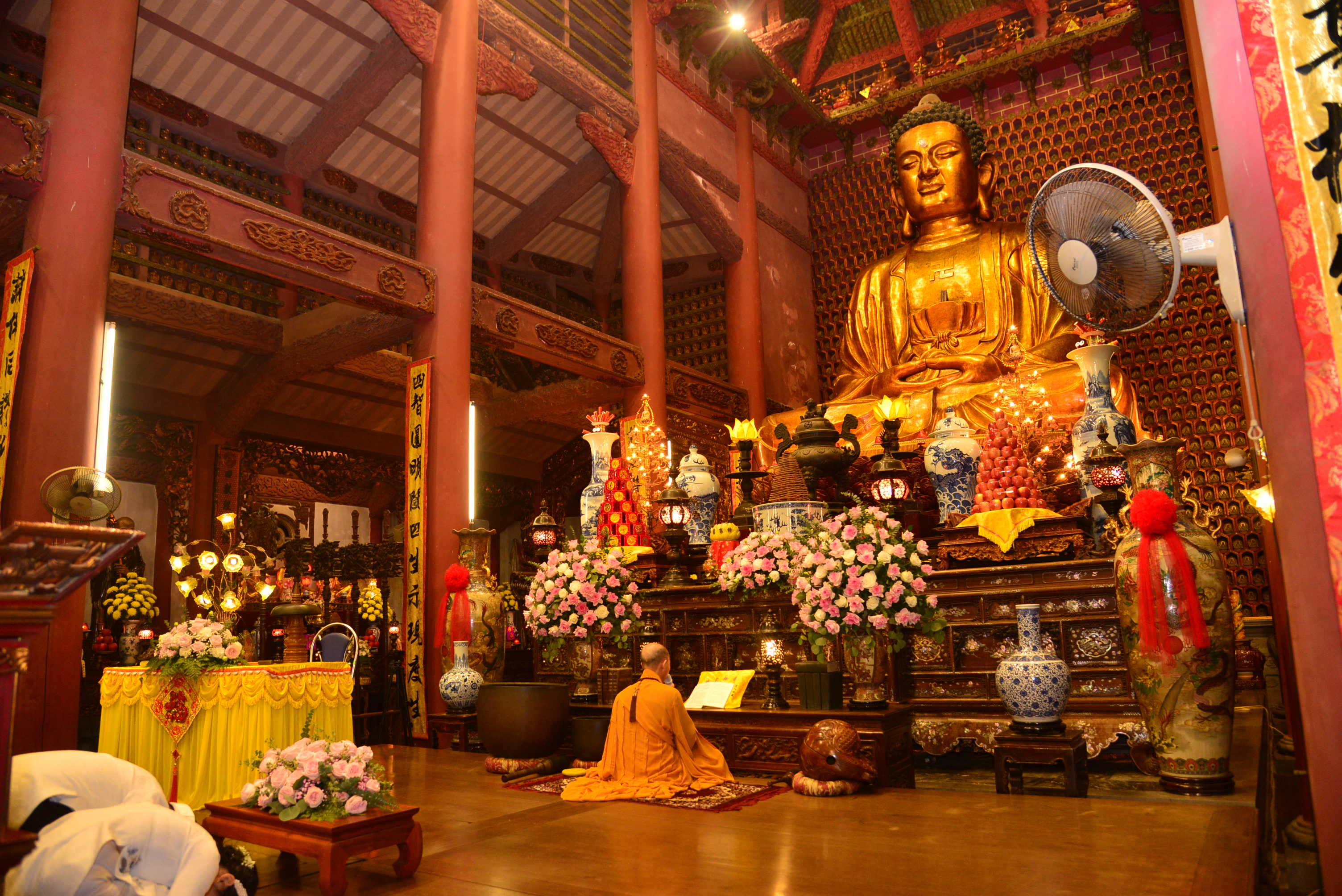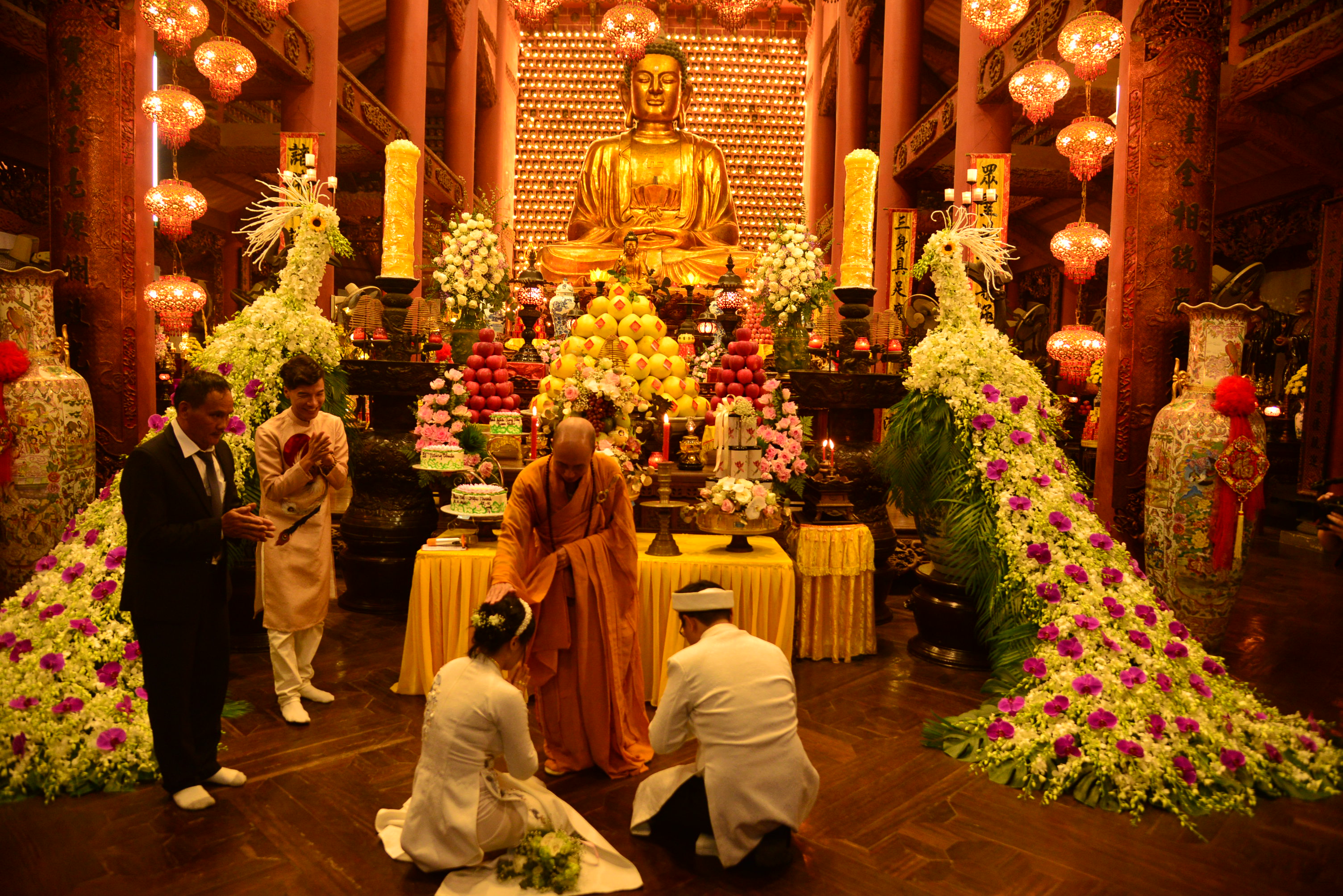 Chư tăng làm lễ chú nguyện, chúc phúc cho đôi bạn trẻ tại chính điện chùa Đỏ ( Linh Độ Tự)