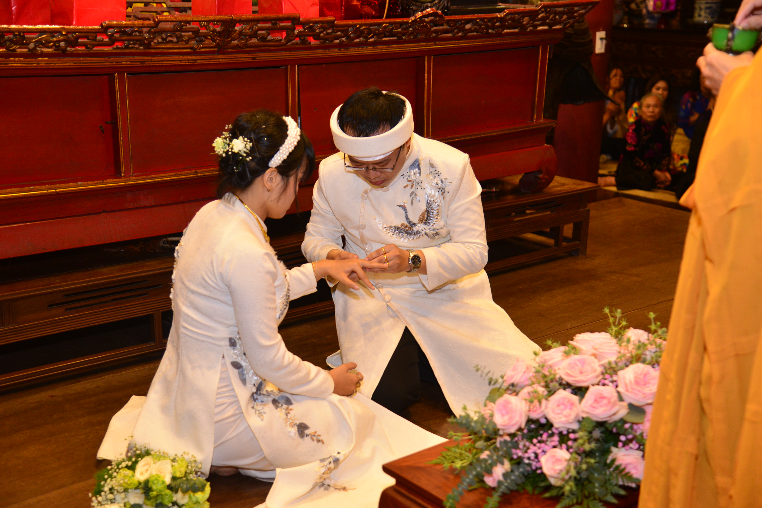 Trước khi đôi bạn trẻ trao nhẫn cưới cho nhau, Đại đức Thích Trường Xuân đã làm lễ sái tịnh, gia trì chú nguyện vào đôi nhẫn cưới; Khi đôi nhẫn cưới được chư tăng gia trì, chú nguyện thì sẽ có sự gia hộ của mười phương Chư Phật, Chư Hộ Pháp thiện thần, Đại đức mong đôi bạn trẻ sẽ trân trọng và giữ gìn đôi nhẫn cưới này cho đến hết cuộc đời mình như chính tình cảm của các bạn vậy.