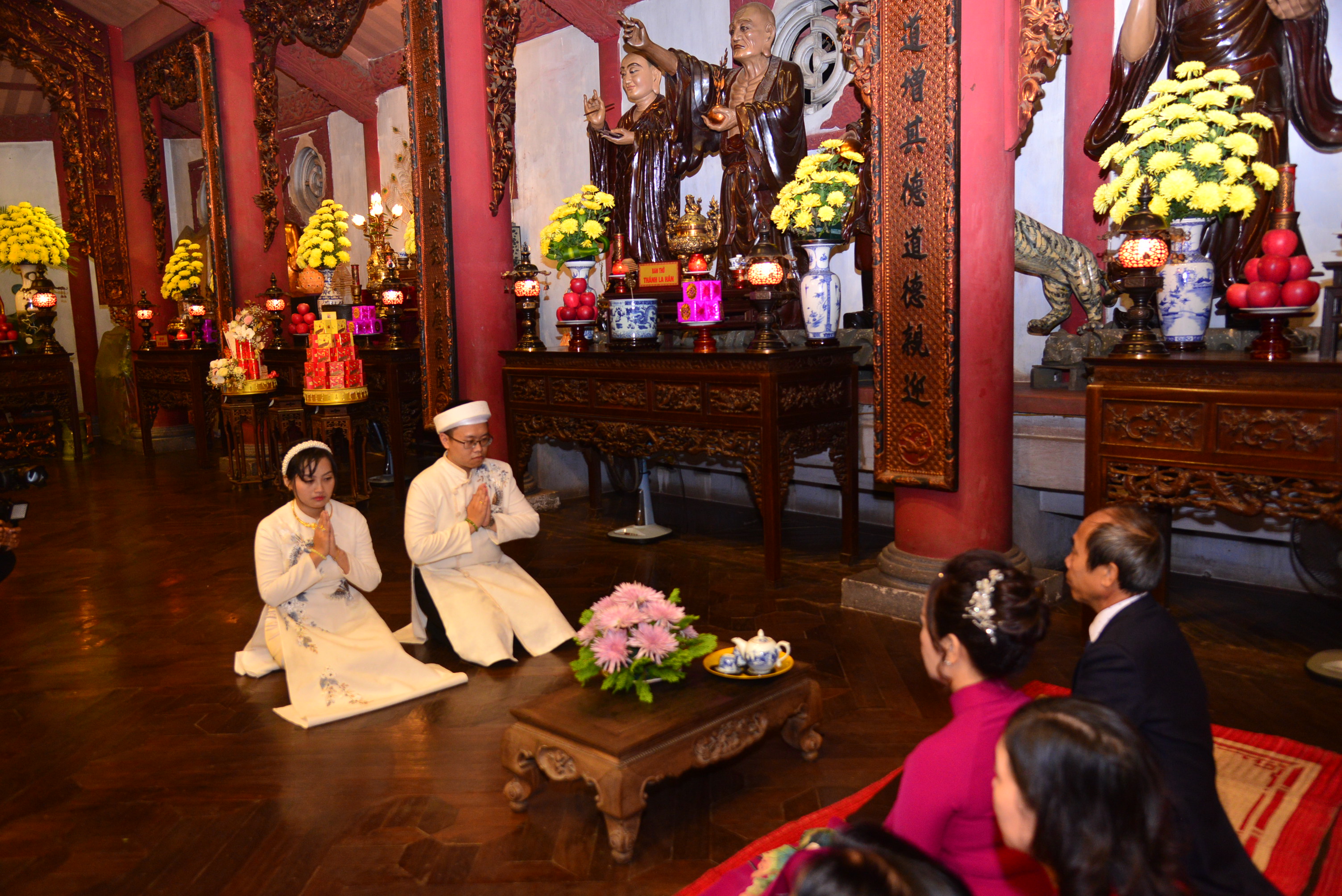 Hai bạn trẻ tổ chức lễ hằng thuận tại chùa
