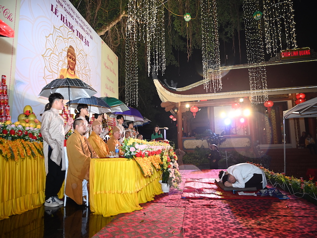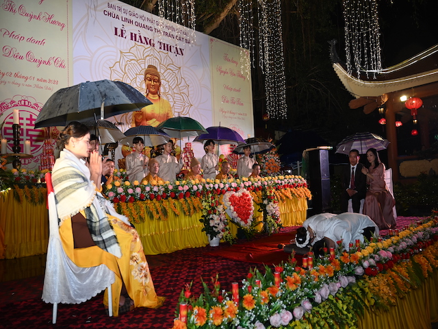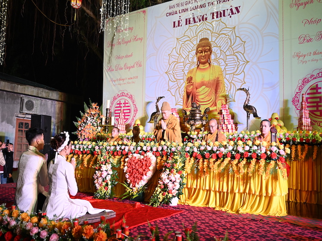 Trước khi chính thức cử hành nghi lễ hằng thuận cho đôi bạn trẻ, Chư tôn đức tăng ni chứng minh cùng đôi bạn trẻ và hai bên gia đình đã vân tập tại chính điện chùa Linh Quang đỉnh lễ Tam Bảo, dâng hương, bạch Phật, tụng kinh cầu nguyện cho buổi lễ hằng thuận được diễn ra thập phần viên mãn, cầu nguyện cho đôi bạn trẻ luôn hạnh phúc bên nhau.