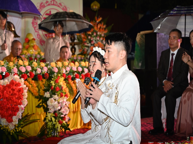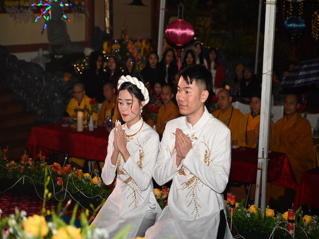 Dưới sự gia hộ của mười phương Chư Phật và sự chứng minh của chư tôn đức tăng hiện tiền, đôi bạn trẻ đã làm lễ Tạ ơn Tam Bảo, lễ tri ân công sinh thành dưỡng dục của hai đấng song thân. Cha mẹ của đôi tân lang – tân nương đã không khỏi xúc động vì đây là lần đầu tiên con cái làm lễ tạ ơn để bày tỏ lòng biết ơn hai đấng sinh thành đã cho các con có được hình hài và sự trưởng thành như ngày hôm nay.
