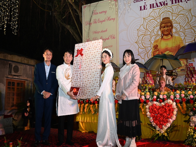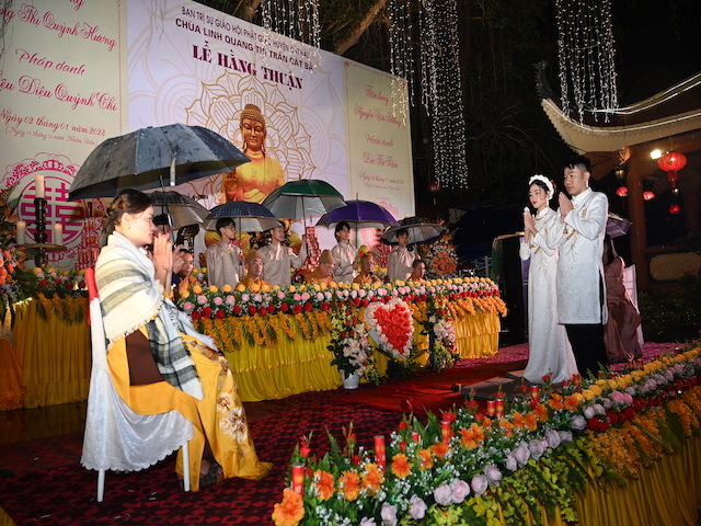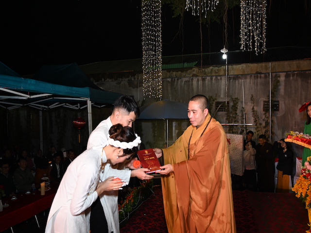 Trong niềm hoan hỷ của toàn thể đại chúng, chư tôn đức hiện tiền, cũng như đại diện Phật tử chùa Linh Quang đã tặng cho đôi bạn trẻ những món quà chúc phúc đầy ý nghĩa nhân sự kiện trọng đại trong cuộc đời, cầu chúc cho đôi tân lang, tân nương được: “ Trăm năm tình viên mãn, bạc đầu nghĩa phu thê”, sống và yêu thương nhau đến hết cuộc đời.