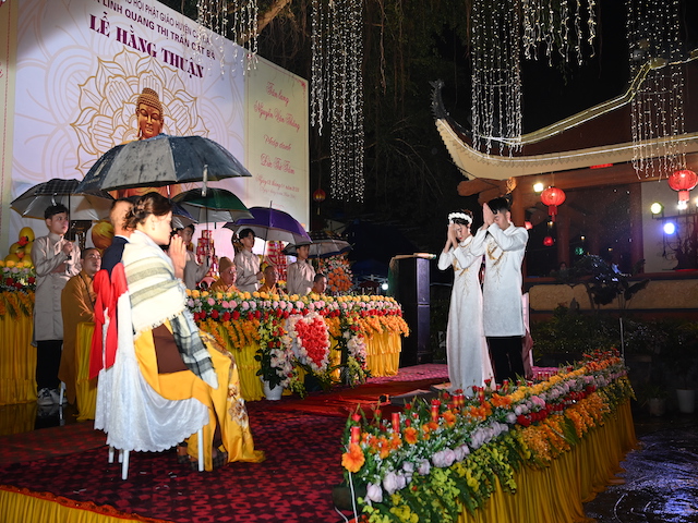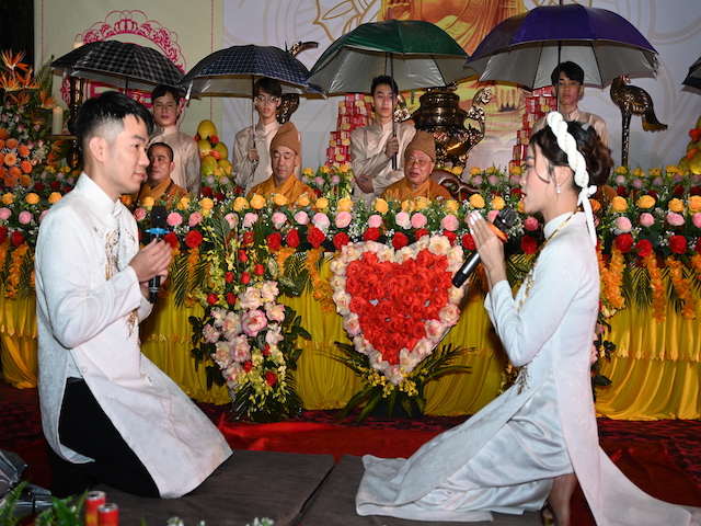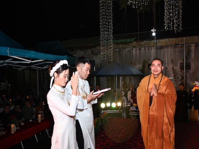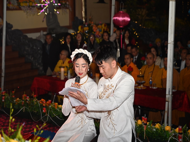 Trước sự chứng minh của chư tôn đức và sự chứng kiến của hai bên gia đình, đôi tân lang, tân nương đã lễ lạy nhau thông qua nghi thức: “ Lễ bình đẳng”. Sau đó, lần lượt Tân lang và Tân nương đã đối trước Tam Bảo, đối trước chư tăng dâng lời phát nguyện từ sâu thẳm trái tim mình, hứa sẽ luôn yêu thương nhau, luôn tôn trọng nhau, luôn bảo vệ cho hạnh phúc gia đình để hạnh phúc gia đình được trường tồn mãi mãi và nguyện sẽ hành trì theo đúng lời Phật dạy trong kinh Thiện Sinh và kinh Sáu Phương mà Đức Phật đã dạy, đồng thời hứa sẽ cố gắng tinh tấn tu học để trở thành những người phật tử thuần thành, hộ trì đắc lực cho Tam Bảo.