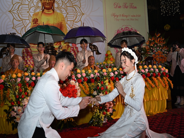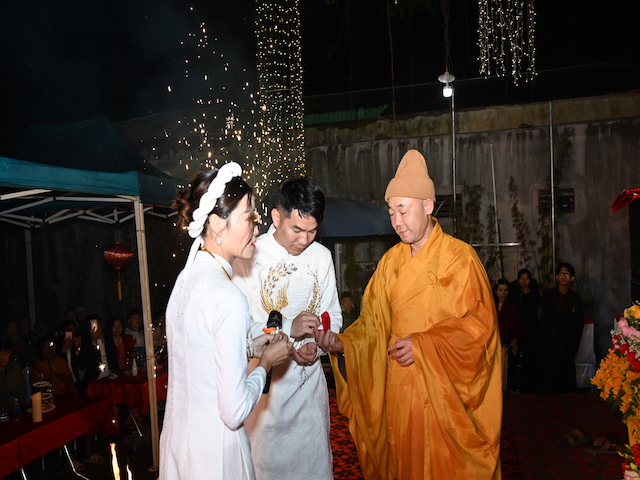 Trước khi đôi bạn trẻ trao nhẫn cho nhau, Thượng toạ Thích Tục Khang, cùng chư tôn đức chứng minh đã làm lễ gia trì, sái tịnh đôi nhẫn cưới và giảng cho hai bạn hiểu về ý nghĩa của chiếc nhẫn, chất liệu làm ra chiếc nhẫn, cũng như ý nghĩa của chữ “Nhẫn” đối với hạnh phúc gia đình. “Nhẫn” ở đây được hiểu là sự nhẫn nại, sự kham nhẫn, vợ chồng phải biết nhường nhịn, nhẫn nhịn nhau, tôn trọng nhau. Gia đình có được ấm êm, hạnh phúc hay không, phần lớn là nhờ vào sự nhẫn nhịn của người chồng và người vợ.