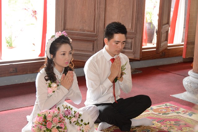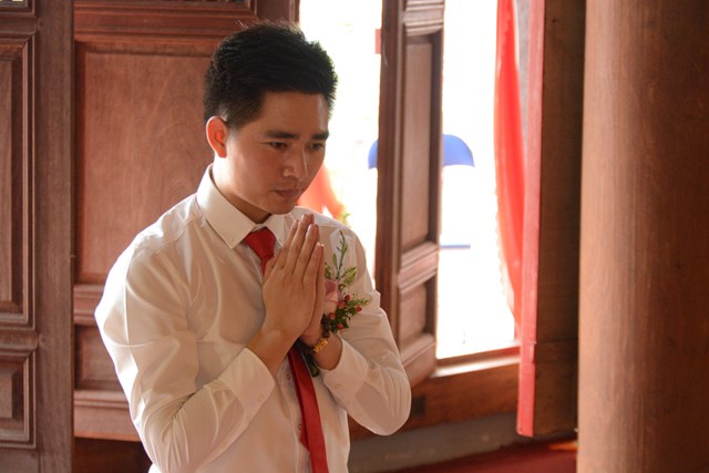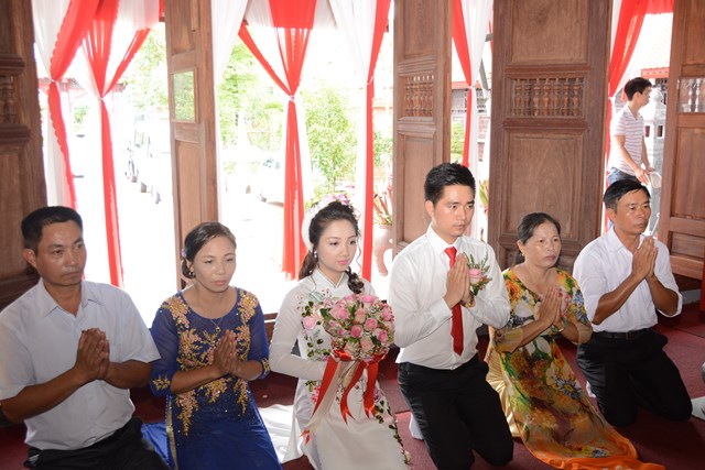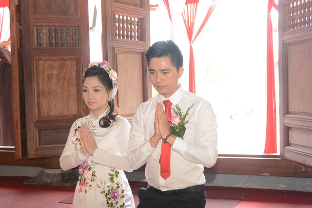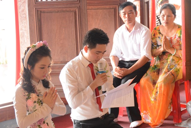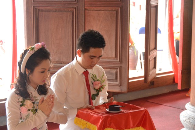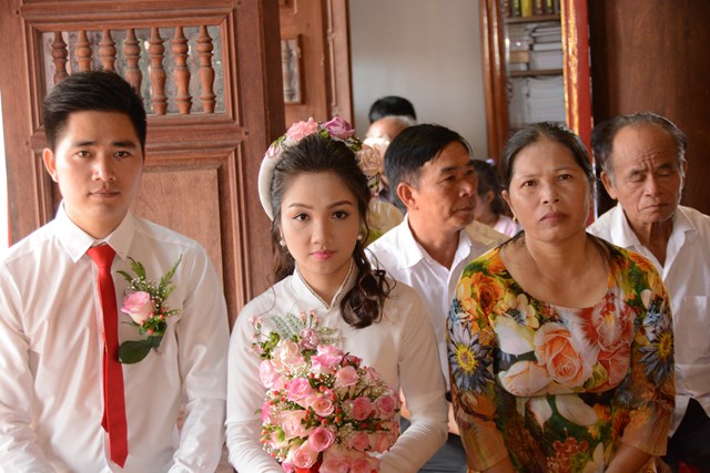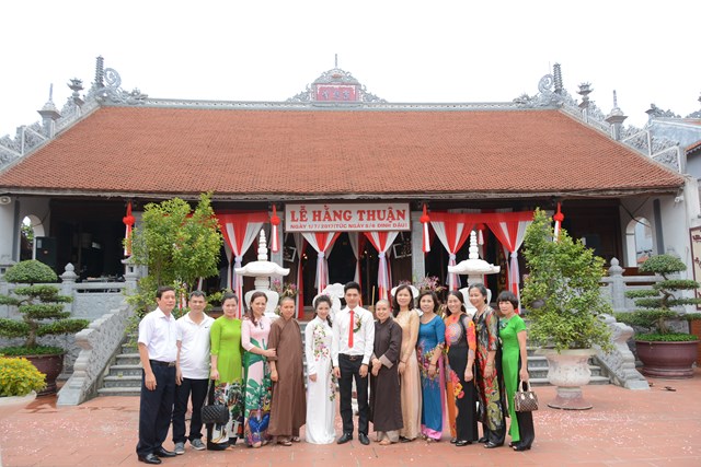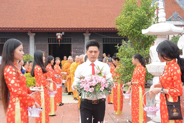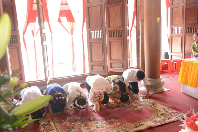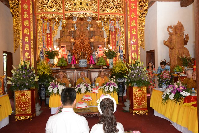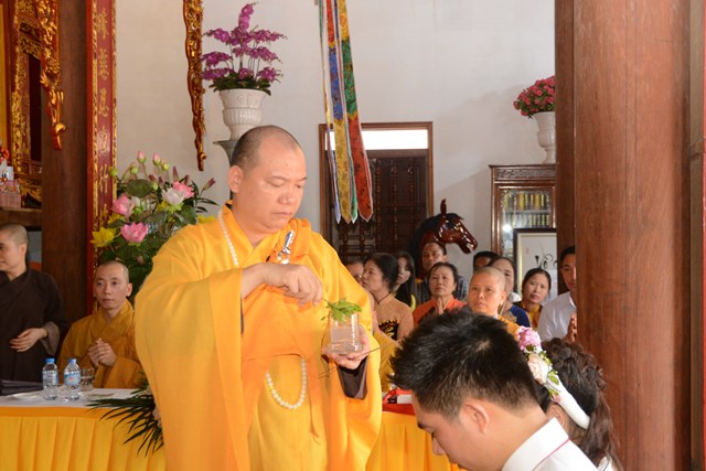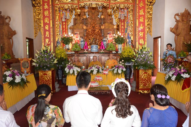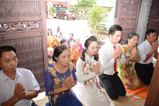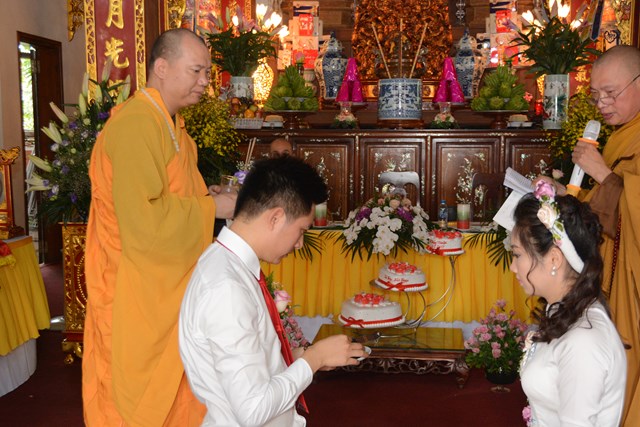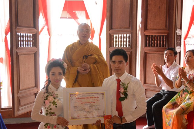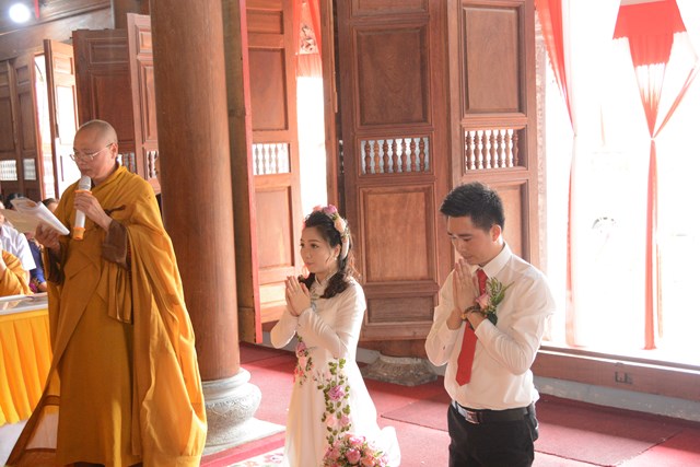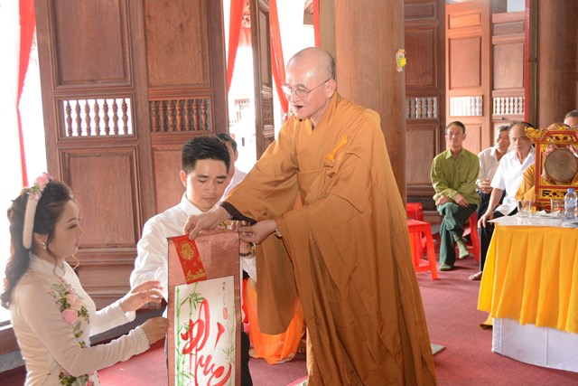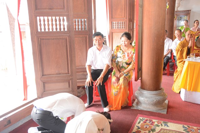 Tiếp đó, thượng tọa chứng minh đã cử hành lễ Quy y Tam Bảo và truyền thụ Tam quy, ngũ giới cho đôi bạn trẻ trước sự chứng minh của chư tôn đức Tăng Ni và sự tham dự của hai bên gia đình cùng các Phật tử, nhân dân địa phương đã về tham dự buổi lễ. Và từ đây, đôi bạn trẻ Lê Văn Hợp và Bùi Thị Ngọc chính thức trở thành những người Phật tử, những người con của Đức Phật, nguyện tu học và thực hành theo giáo lý mà Đức Phật đã dạy, để hướng tới một cuộc sống an lạc và hạnh phúc.
