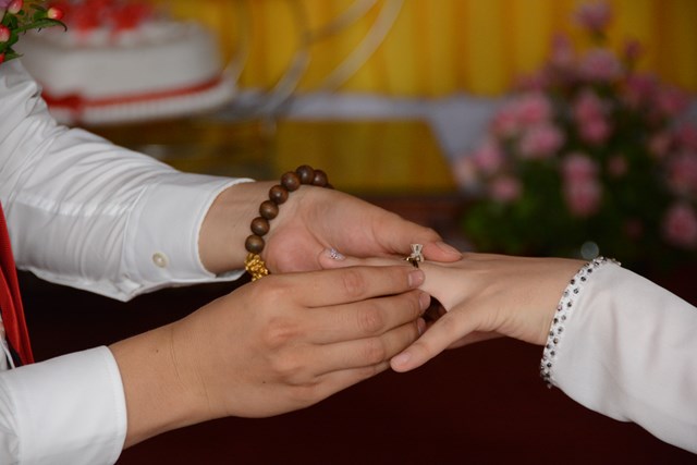 Trước khi đôi bạn tự trao nhẫn cưới cho nhau, Thượng tọa chứng minh đã làm lễ chú nguyện, gia trì đôi nhẫn cưới và giảng cho hai bạn hiểu về ý nghĩa của chiếc nhẫn cũng như ý nghĩa của chữ “Nhẫn” đối với hạnh phúc của gia đình. Nhẫn ở đây được hiểu là sự nhẫn nhịn, vợ chồng phải biết nhường nhịn, nhẫn nhịn nhau, tôn trọng nhau; “Nhẫn” ở đây chính là sự tu dưỡng đạo đức và tu dưỡng phẩm hạnh. Một gia đình có đươc êm ấm, có được hòa thuận hay không, phần lớn là do sự nhẫn nhịn quyết định.