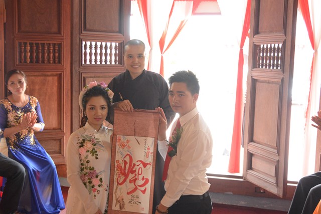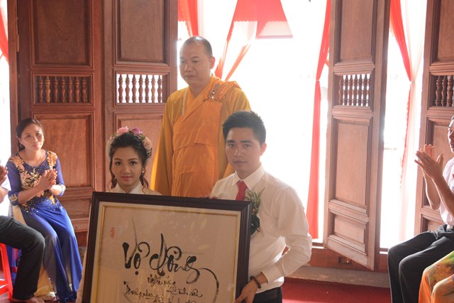 Nhân dịp này, thượng tọa Thích Thanh Giác, thượng tọa Thích Nguyên Bình, Sư thầy Thích Hạnh Như – Trụ trì chùa Linh Ứng, trưởng BTC buổi lễ đã chúc phúc cho đôi tân lang, tân nương qua những món quà đầy ý nghĩa nhân sự kiện trọng đại này.