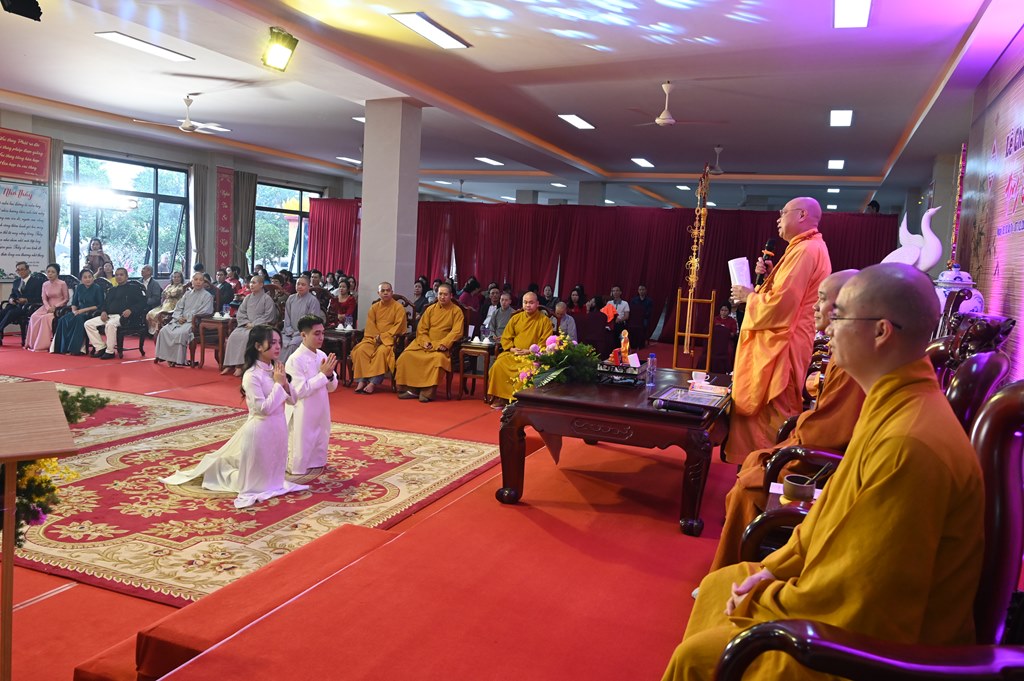 Tại buổi lễ, đôi tân lang, tân nương và toàn thể đại chúng đã được Hòa thượng Thích Thanh Giác bố thí cho một thời pháp chia sẻ về đạo nghĩa vợ chồng đã được Đức Phật thuyết trong kinh điển. Theo đó, trong kinh Thiện Sinh, Đức Phật đã chỉ dạy rất rõ về bổn phận của của người vợ đối với người chồng và gia đình bên chồng, cũng như bổn phận của người chồng đối với vợ và gia đình bên vợ; bổn phận của cha mẹ đối với con cái và bổn phận của con cái đối với cha mẹ…Ngoài ra, Hòa thượng cũng giảng giải cho hai bạn hiểu về ý nghĩa của chiếc nhẫn cũng như ý nghĩa của chữ “Nhẫn” đối với hạnh phúc gia đình. Nhẫn ở đây là sự nhẫn nhịn, vợ chồng phải biết nhường nhịn, nhẫn nhịn nhau, tôn trọng nhau; “Nhẫn” ở đây chính là sự tu dưỡng đạo đức và tu dưỡng phẩm hạnh. Một gia đình có được êm ấm, có được hòa thuận, hạnh phúc hay không, phần lớn là do sự nhẫn nhịn quyết định.