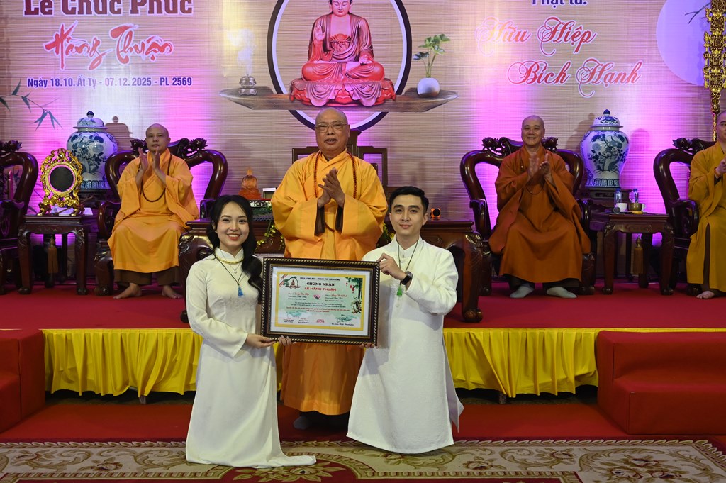 Đôi bạn trẻ đón nhận Giấy chứng nhận Lễ Hằng Thuận từ Hòa thượng chứng minh, trưởng Ban tổ chức buổi lễ