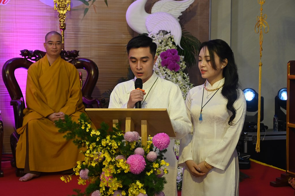 Trước sự chứng minh của chư tôn đức Tăng Ni và sự chứng kiến của đại diện hai bên gia đình, đôi bạn trẻ đã trao nhẫn cưới cho nhau và dâng lời phát nguyện luôn yêu thương nhau, luôn tôn trọng nhau, luôn bảo vệ cho hạnh phúc của gia đình được trường tồn mãi mãi, nguyện sẽ hành trì theo đúng những điều Đức Phật đã chỉ dạy trong kinh Thiện Sinh, đồng thời sẽ cố gắng thực hành, giữ gìn 5 giới của người Phật tử tại gia, nguyện siêng năng, tinh tấn tu học để trở thành những người phật tử chân chính, hộ trì Tam Bảo.