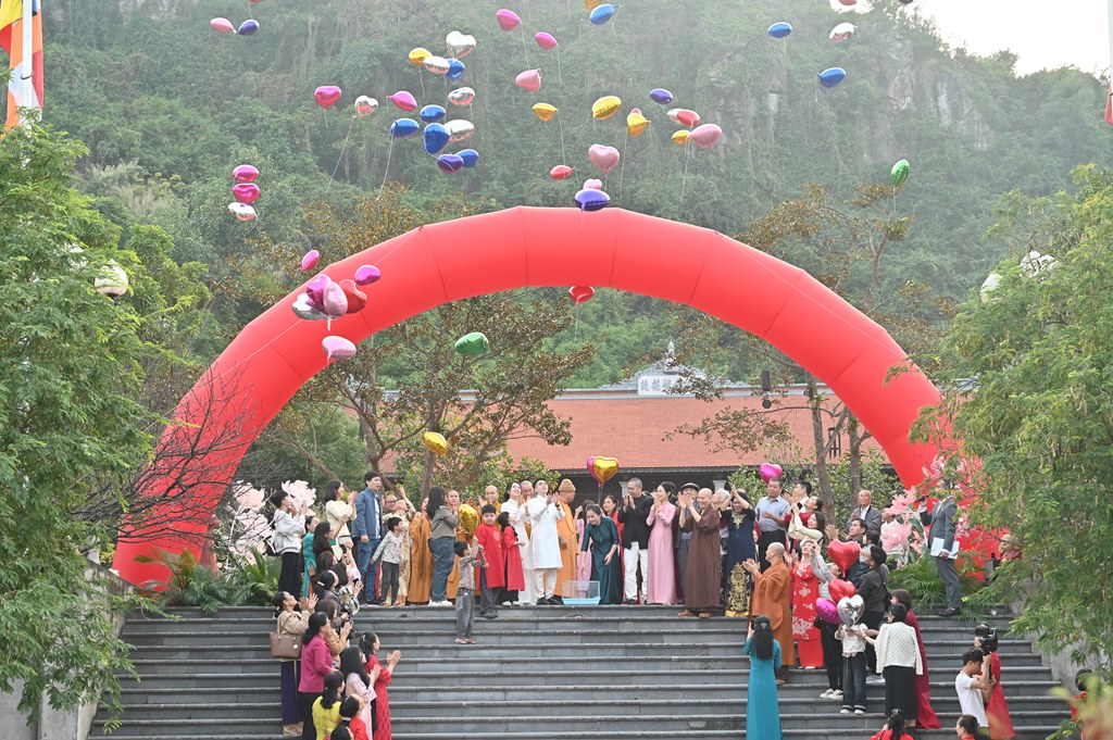 Trước khi kết thúc buổi lễ, chư tôn đức Tăng Ni, cùng đôi tân lang, tân nương và đại diện hai bên gia đình đã tổ chức lễ phóng sinh, thả bóng bay cầu nguyện thế giới hòa bình, chúng sinh an lạc, nhân khang, vật thịnh và dùng tiệc chay tại chùa trong không khí hoan hỷ, ấm áp.
