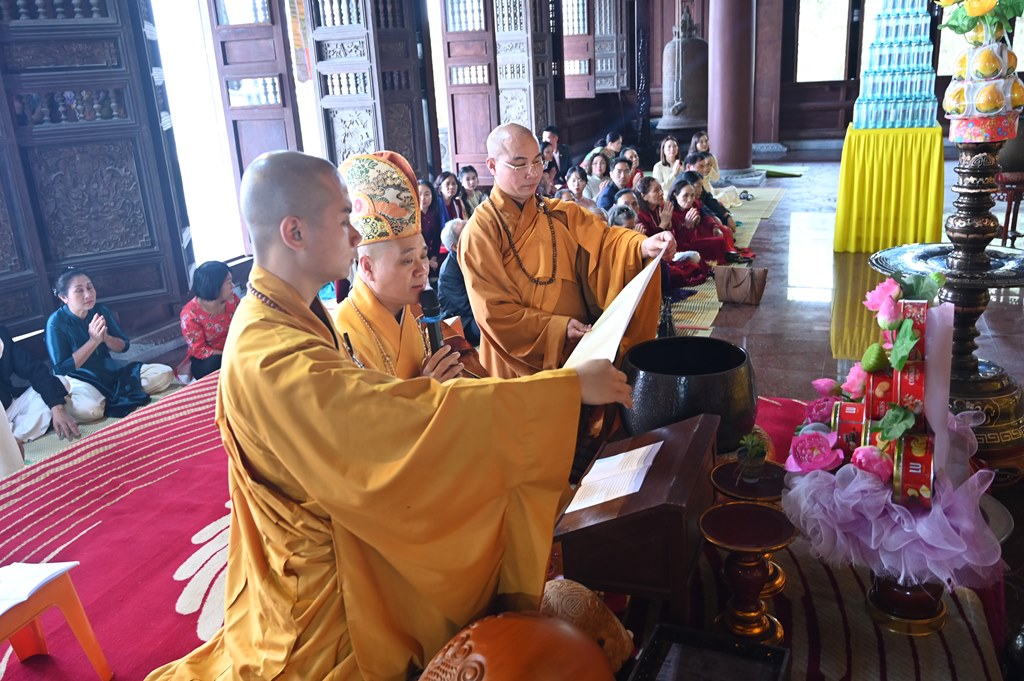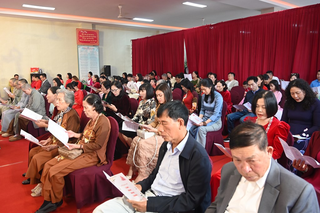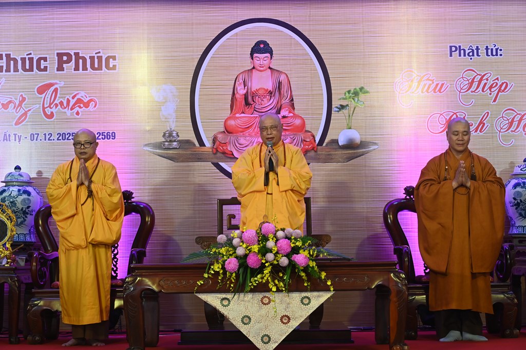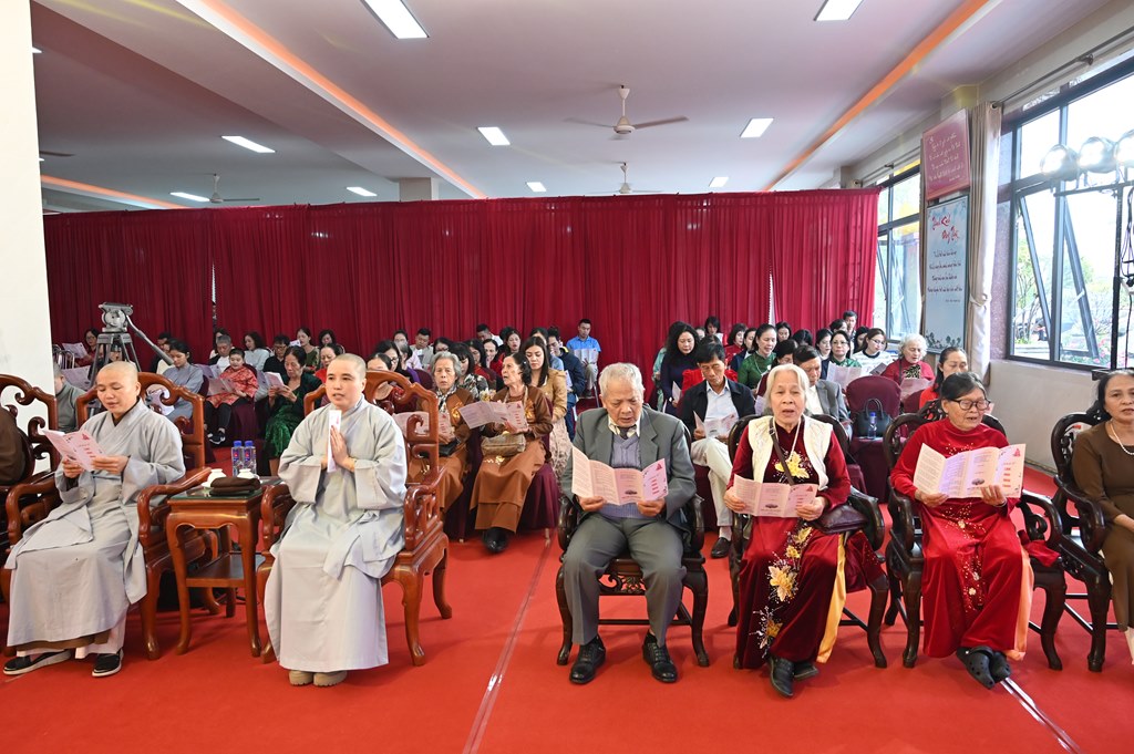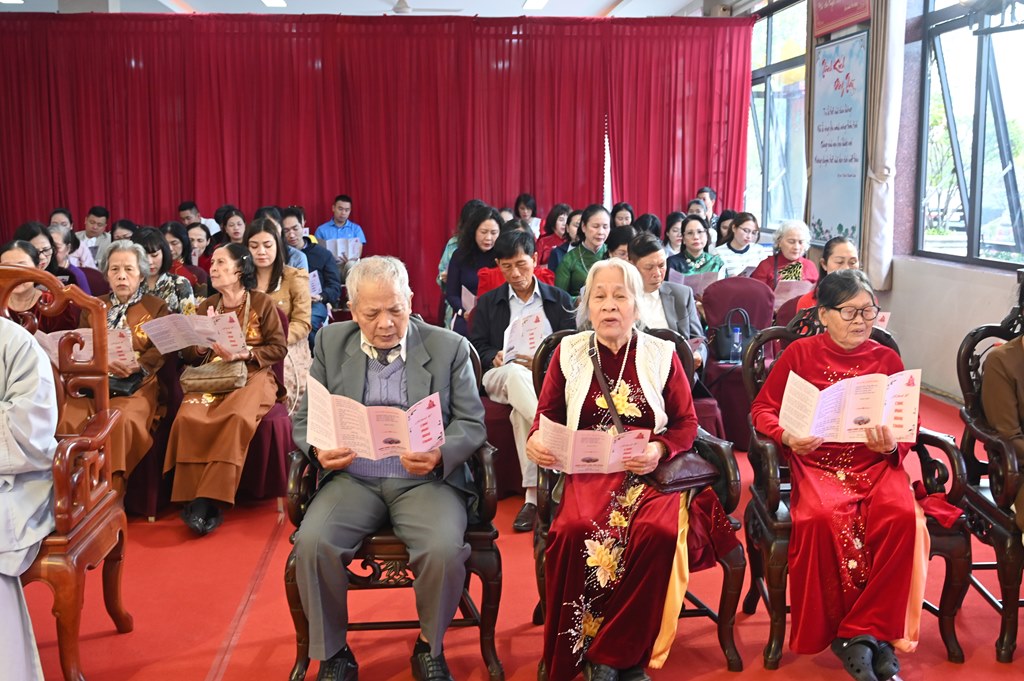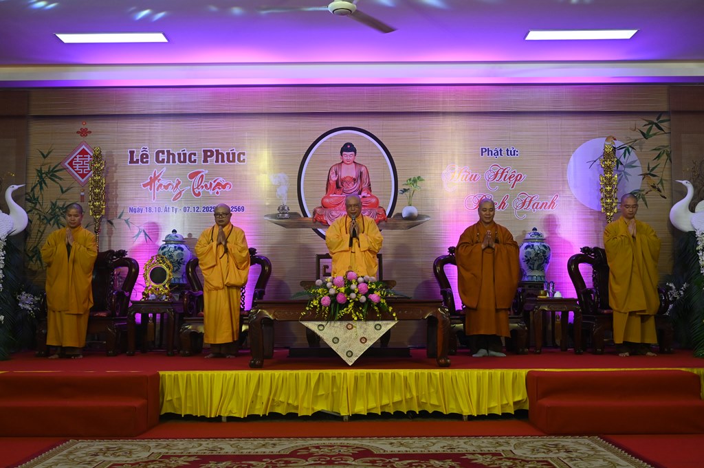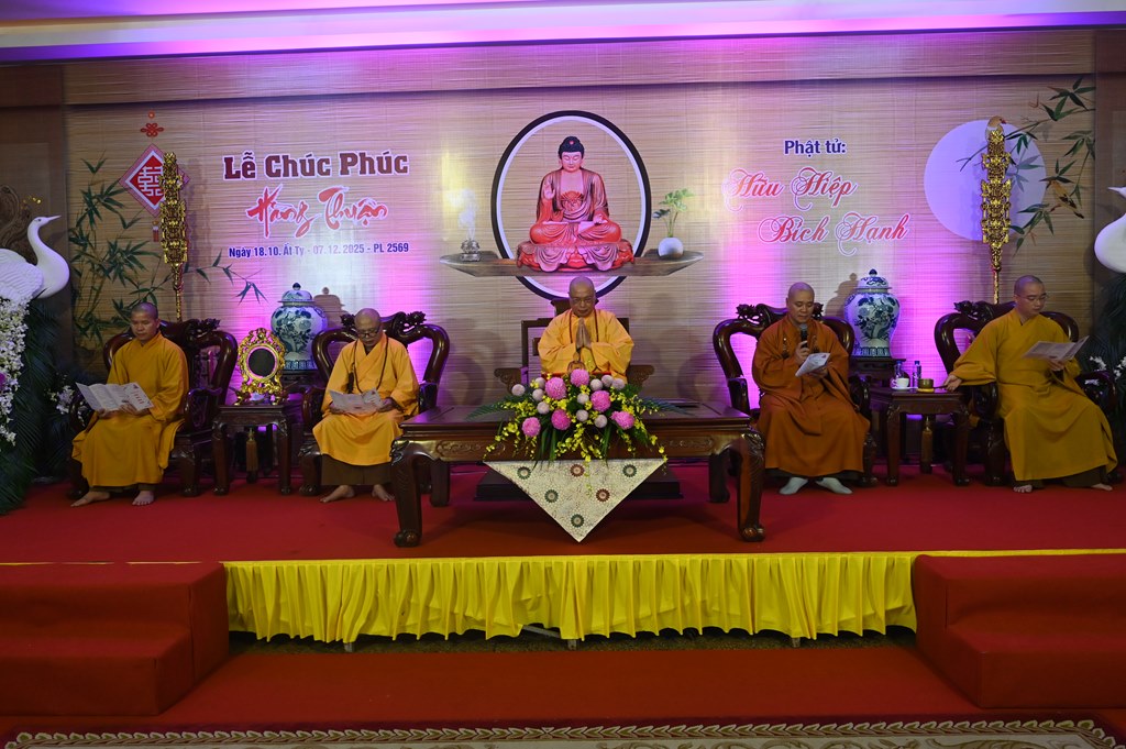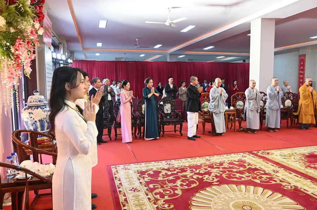 Trong không khí hoan hỷ của buổi lễ, toàn thể đại chúng đã tụng kinh Thiện Sinh cầu nguyện, chúc phúc cho đôi bạn trẻ, cầu nguyện chư Phật, chư Bồ tát, chư hộ pháp thiện thần chứng minh, gia hộ cho đôi tân lang, tân nương được cát tường, thường lạc, luôn hạnh phúc, bình an trong ánh sáng và tình thương của mười phương chư Phật.