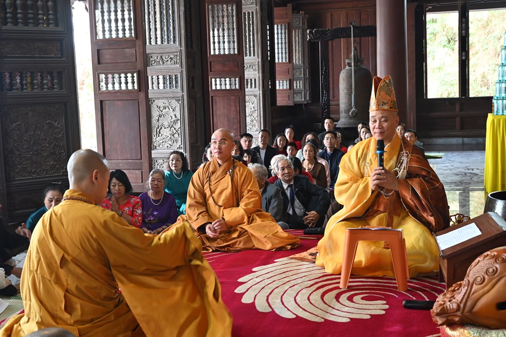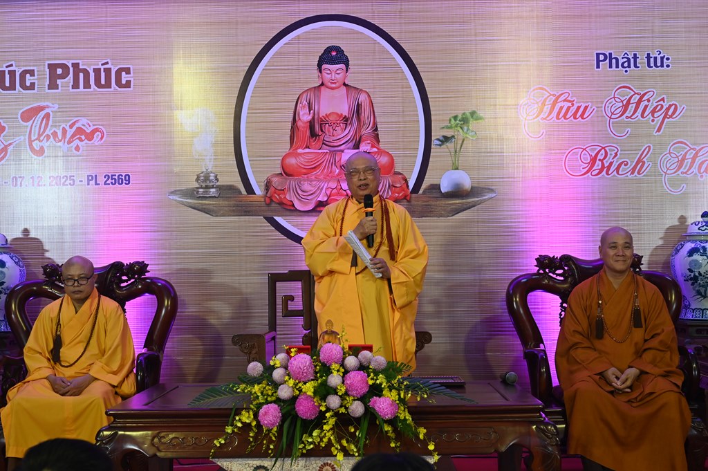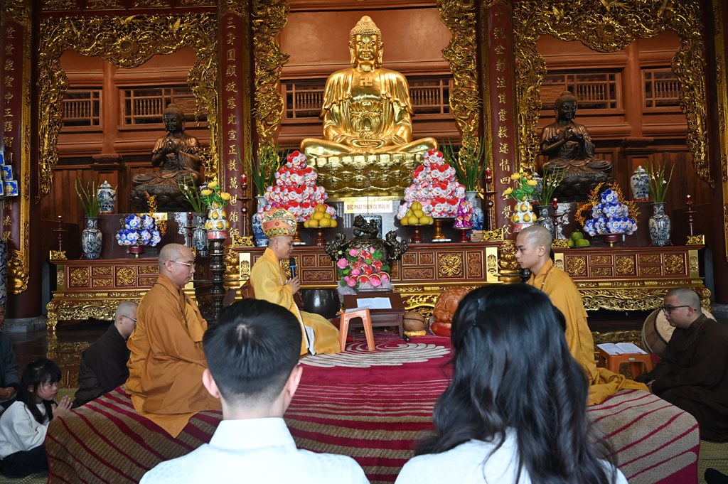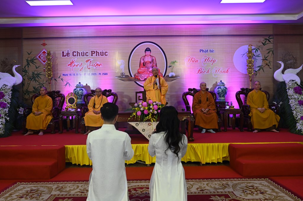 Tại buổi lễ, đôi tân lang, tân nương và toàn thể đại chúng đã được Hòa thượng Thích Thanh Giác bố thí cho một thời pháp chia sẻ về đạo nghĩa vợ chồng đã được Đức Phật thuyết trong kinh điển. Theo đó, trong kinh Thiện Sinh, Đức Phật đã chỉ dạy rất rõ về bổn phận của của người vợ đối với người chồng và gia đình bên chồng, cũng như bổn phận của người chồng đối với vợ và gia đình bên vợ; bổn phận của cha mẹ đối với con cái và bổn phận của con cái đối với cha mẹ…Ngoài ra, Hòa thượng cũng giảng giải cho hai bạn hiểu về ý nghĩa của chiếc nhẫn cũng như ý nghĩa của chữ “Nhẫn” đối với hạnh phúc gia đình. Nhẫn ở đây là sự nhẫn nhịn, vợ chồng phải biết nhường nhịn, nhẫn nhịn nhau, tôn trọng nhau; “Nhẫn” ở đây chính là sự tu dưỡng đạo đức và tu dưỡng phẩm hạnh. Một gia đình có được êm ấm, có được hòa thuận, hạnh phúc hay không, phần lớn là do sự nhẫn nhịn quyết định.