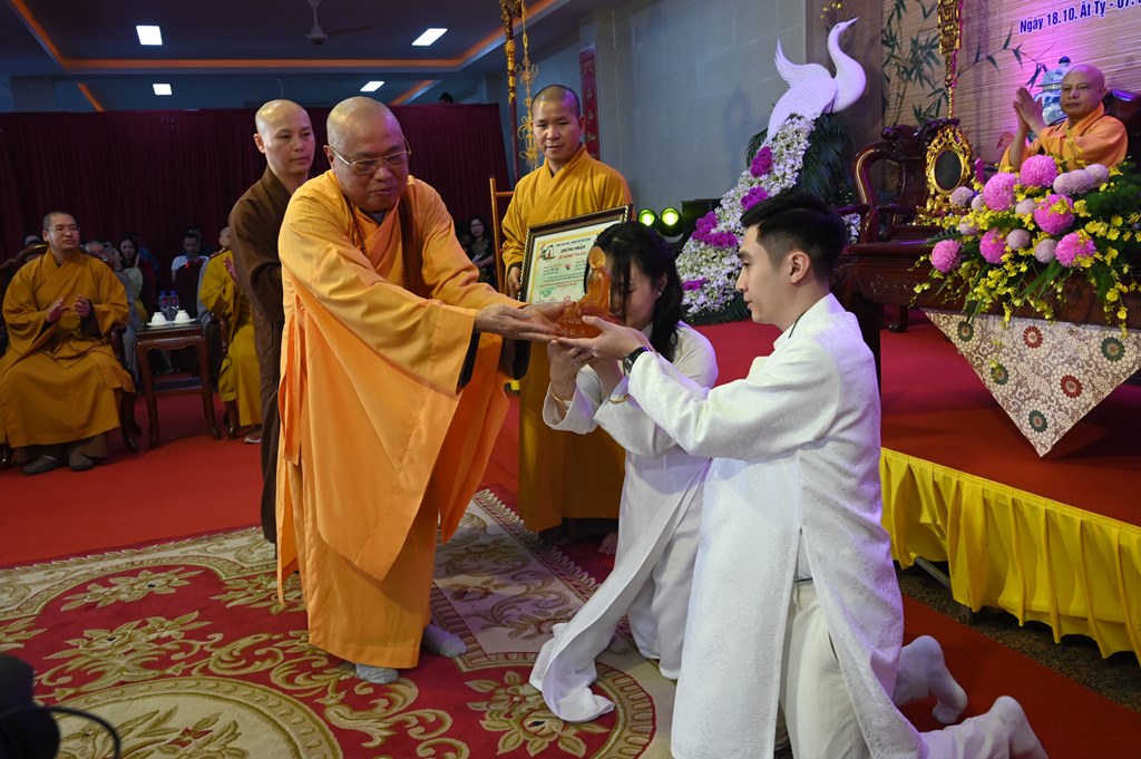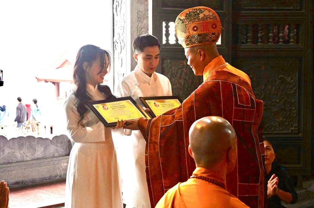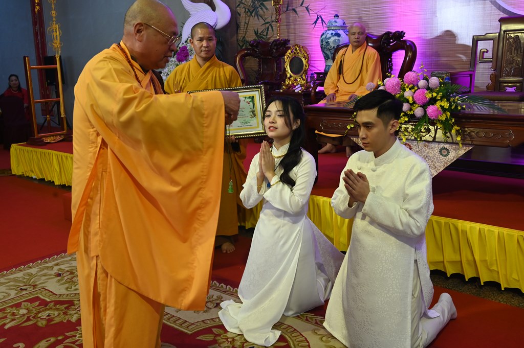 Đôi bạn trẻ đón nhận Giấy chứng nhận Lễ Hằng Thuận từ Hòa thượng chứng minh, trưởng Ban tổ chức buổi lễ