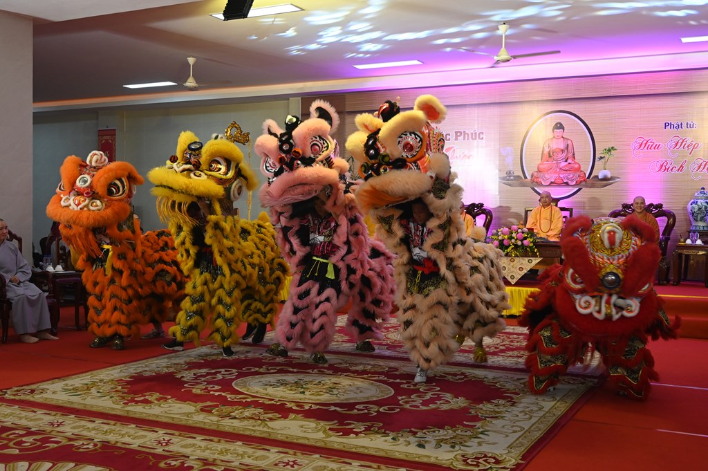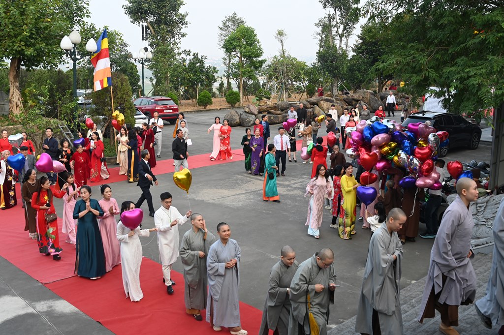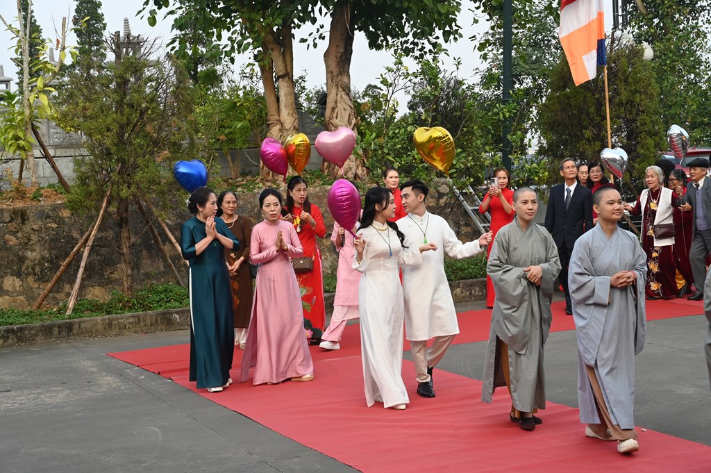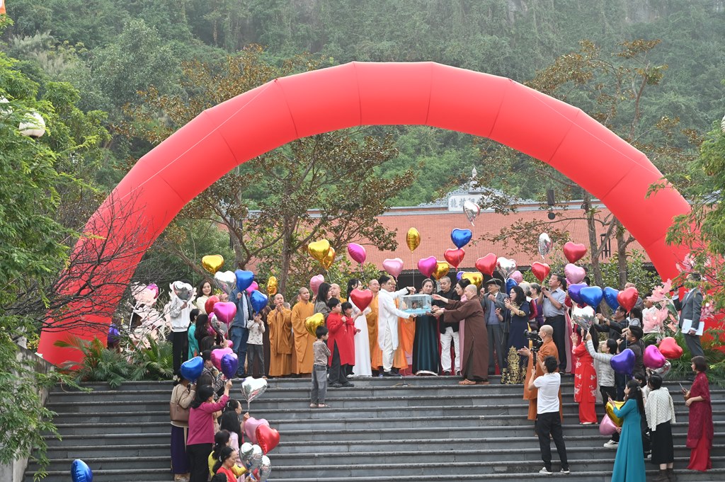 Trước khi kết thúc buổi lễ, chư tôn đức Tăng Ni, cùng đôi tân lang, tân nương và đại diện hai bên gia đình đã tổ chức lễ phóng sinh, thả bóng bay cầu nguyện thế giới hòa bình, chúng sinh an lạc, nhân khang, vật thịnh và dùng tiệc chay tại chùa trong không khí hoan hỷ, ấm áp.