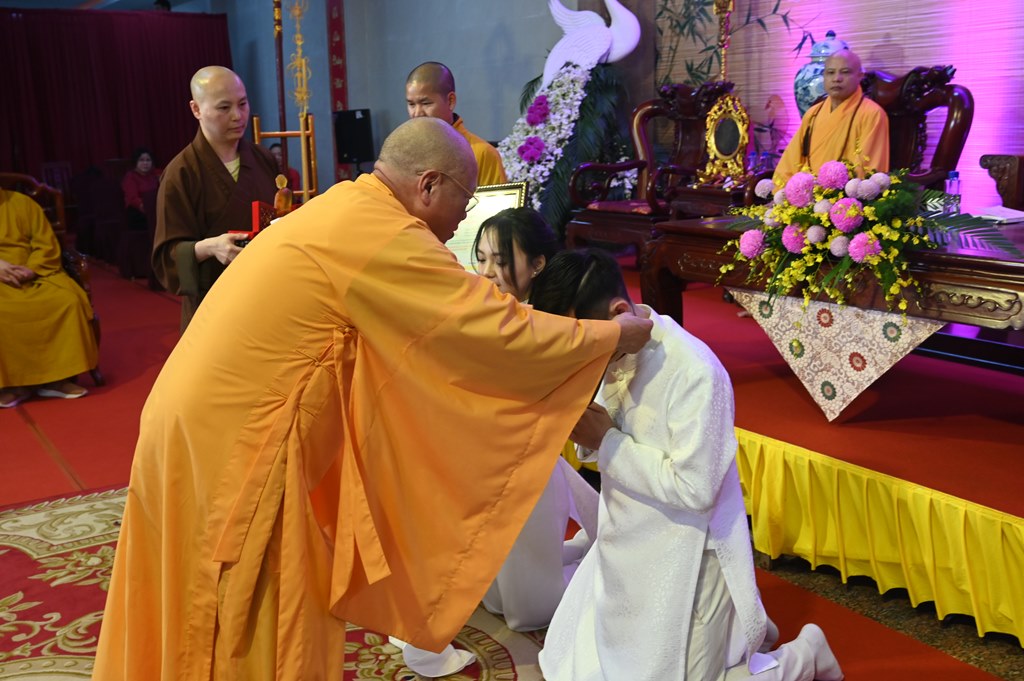 Trước khi chính thức diễn ra buổi lễ Hằng Thuận, đôi bạn trẻ và đại diện hai bên gia đình, cùng quý Phật tử đã vân tập tại chính điện để chư Tăng cử hành nghi lễ Quy y Tam Bảo. Tại buổi lễ, Thượng tọa Thích Thanh Quang đã truyền trao Tam Quy, Ngũ giới cho đôi bạn trẻ . Kể từ giờ phút này, đôi bạn trẻ đã chính thức trở thành người đệ tử của Như Lai, hai bạn đã phát nguyện trước Tam Bảo, thệ nguyện trước Tam Bảo sẽ trọn đời phụng sự Tam Bảo, một lòng tin kính Tam Bảo, lấy giáo pháp của Đức Phật làm thầy và phát nguyện giữ gìn 5 giới của người Phật tử tại gia.
