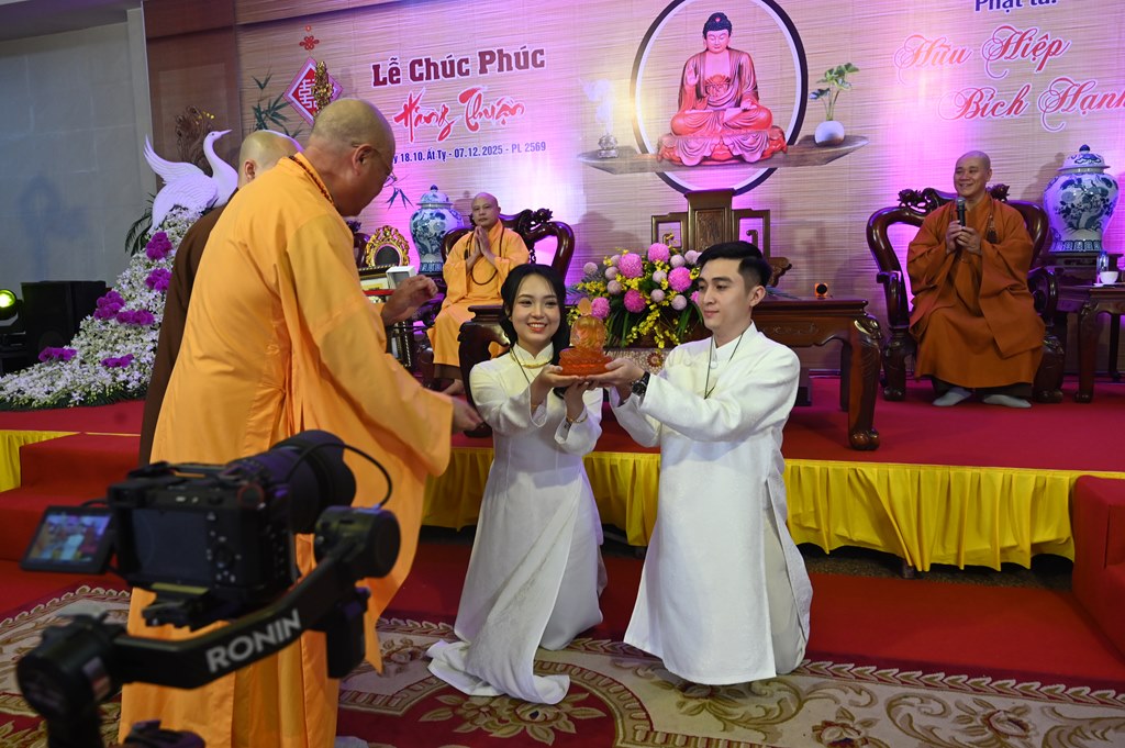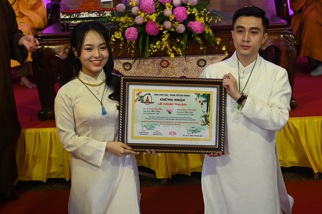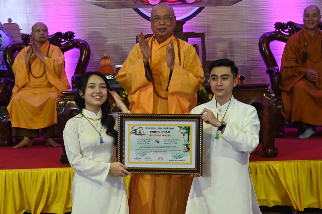 Dịp này, Hòa thượng Thích Thanh Giác – Trụ trì chùa Long Hoa, trưởng BTC buổi lễ đã trao Giấy chứng nhận Lễ Hằng Thuận và trao quà chúc phúc cho đôi bạn trẻ, cũng như những món quà Phật giáo ý nghĩa, chúc mừng đôi tân lang, tân nương kể từ nay đã nên vợ nên chồng và mong cho đôi bạn được “Trăm năm tình viên mãn, bạc đầu nghĩa phu thê”.