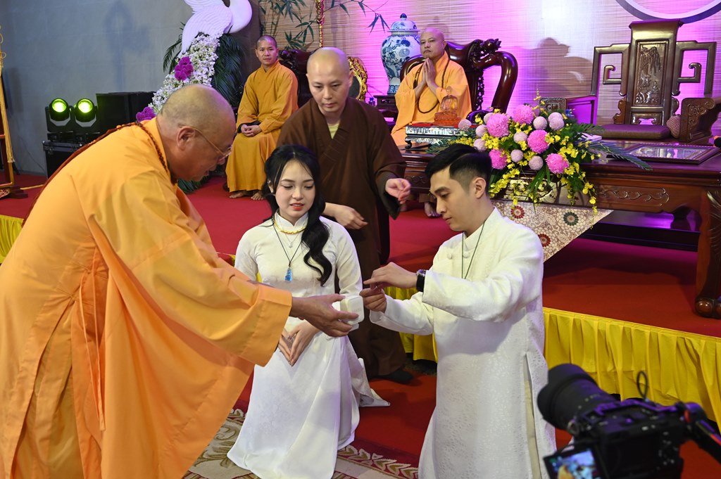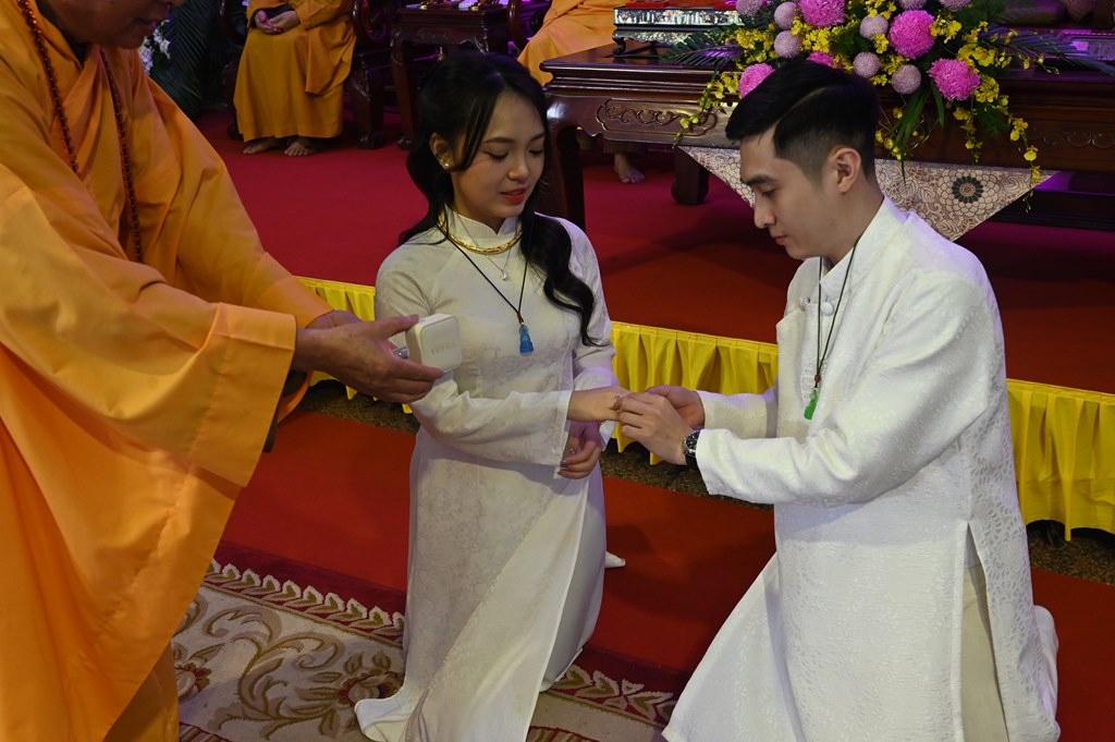 Trước sự chứng minh của chư tôn đức Tăng Ni và sự chứng kiến của đại diện hai bên gia đình, đôi bạn trẻ đã trao nhẫn cưới cho nhau và dâng lời phát nguyện luôn yêu thương nhau, luôn tôn trọng nhau, luôn bảo vệ cho hạnh phúc của gia đình được trường tồn mãi mãi, nguyện sẽ hành trì theo đúng những điều Đức Phật đã chỉ dạy trong kinh Thiện Sinh, đồng thời sẽ cố gắng thực hành, giữ gìn 5 giới của người Phật tử tại gia, nguyện siêng năng, tinh tấn tu học để trở thành những người phật tử chân chính, hộ trì Tam Bảo.